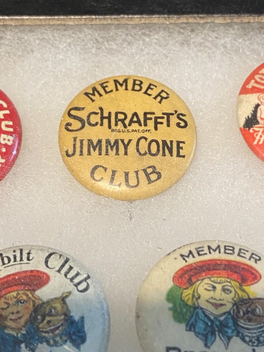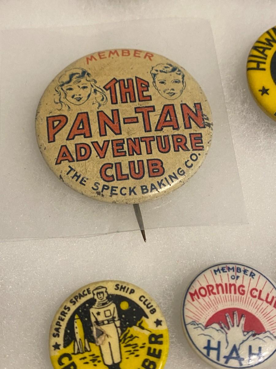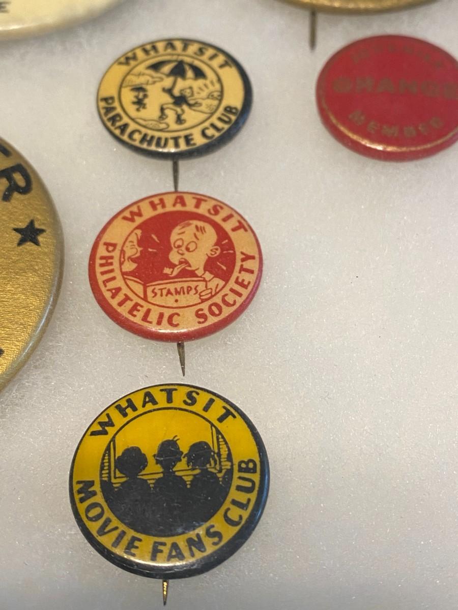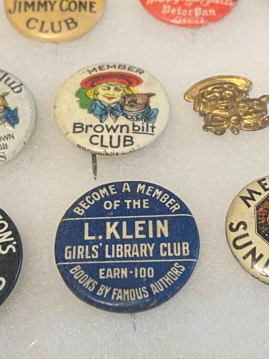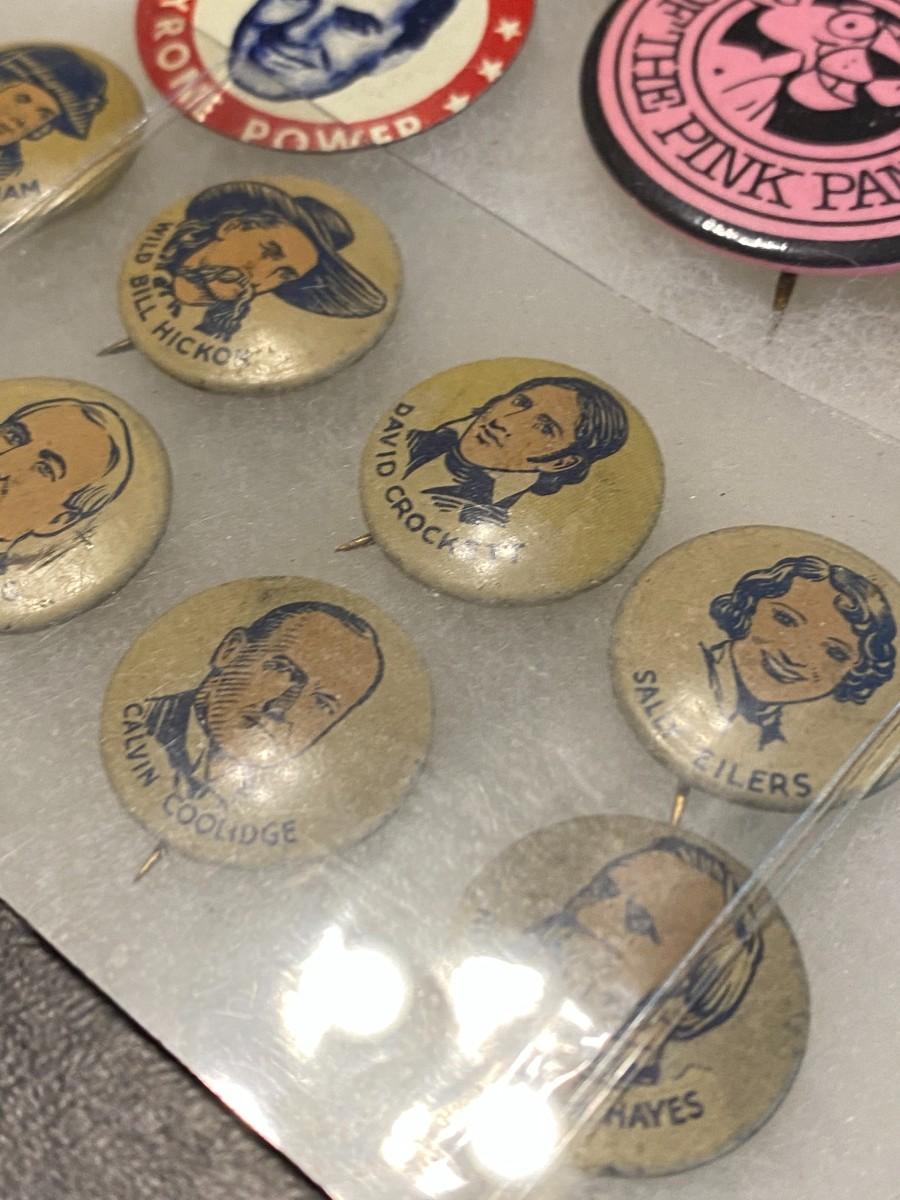 Large Lot of Antique 1900s Buttons Pins Badges and Ribbons of Television Cartoons Characters. Includes Foxy Grandpa button, Betty Hutton button, Paramount Star Buttons, Shirley Temple Button, Ann Little in the Blue Fox, Will Rogers, The Mummy, Mickey Rooney, Allan Lane, Gary Coooper, Harold Lloyd, Laurel & Hardy, Strom Becker, National Boys Magikclub, Komic Club, Robin Hood, Junior Explorers Club, Teeny the Clown, The Pan-Tan Adventure Club, and more! Condition as shown.