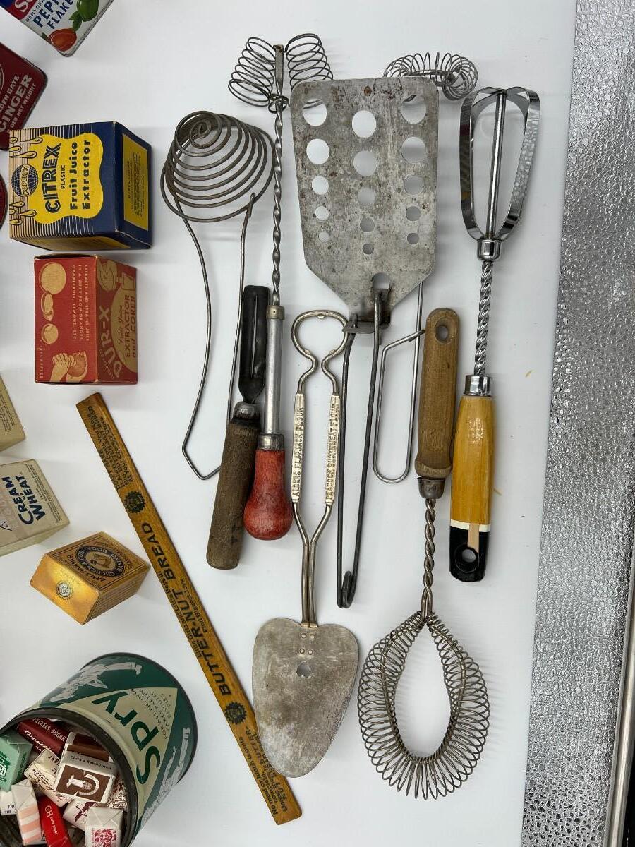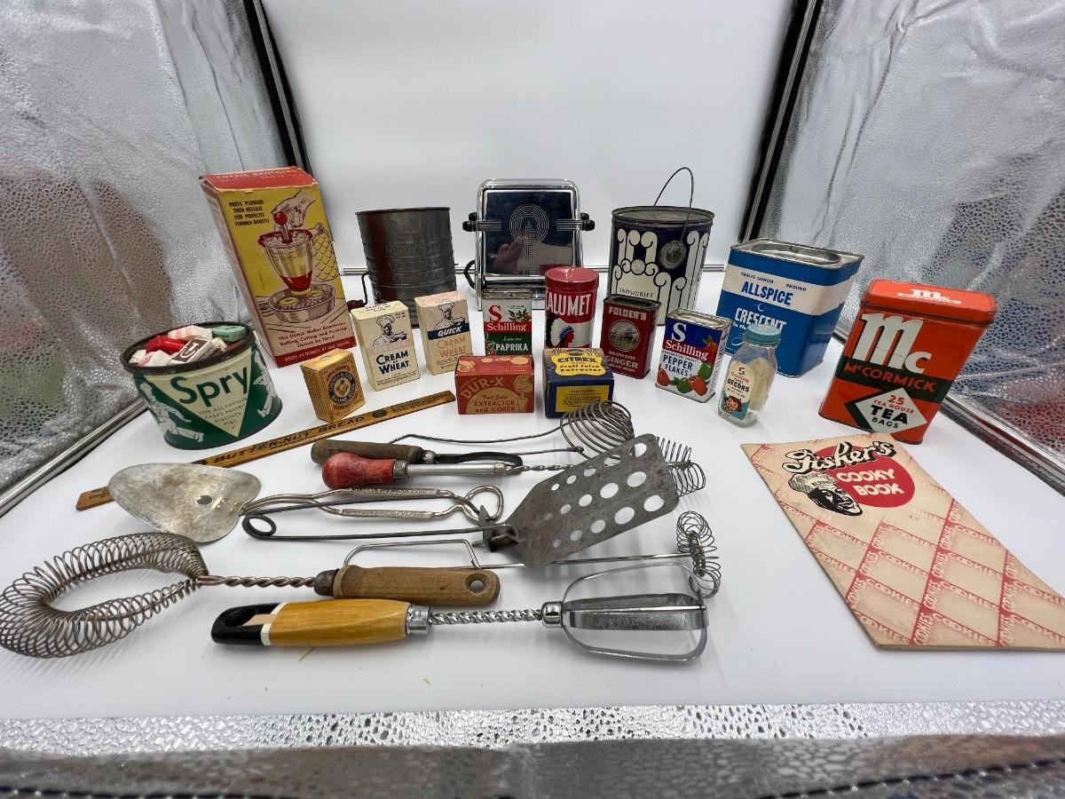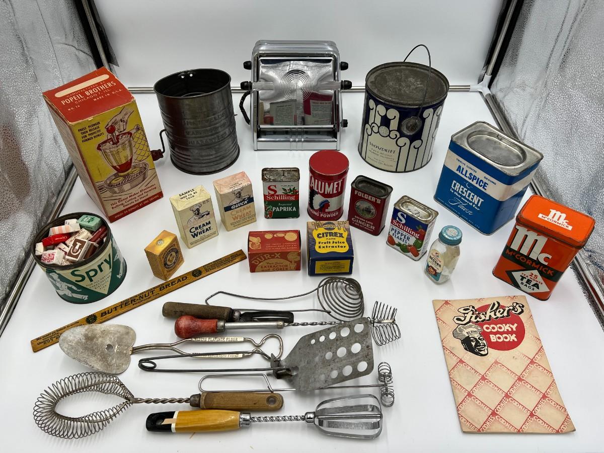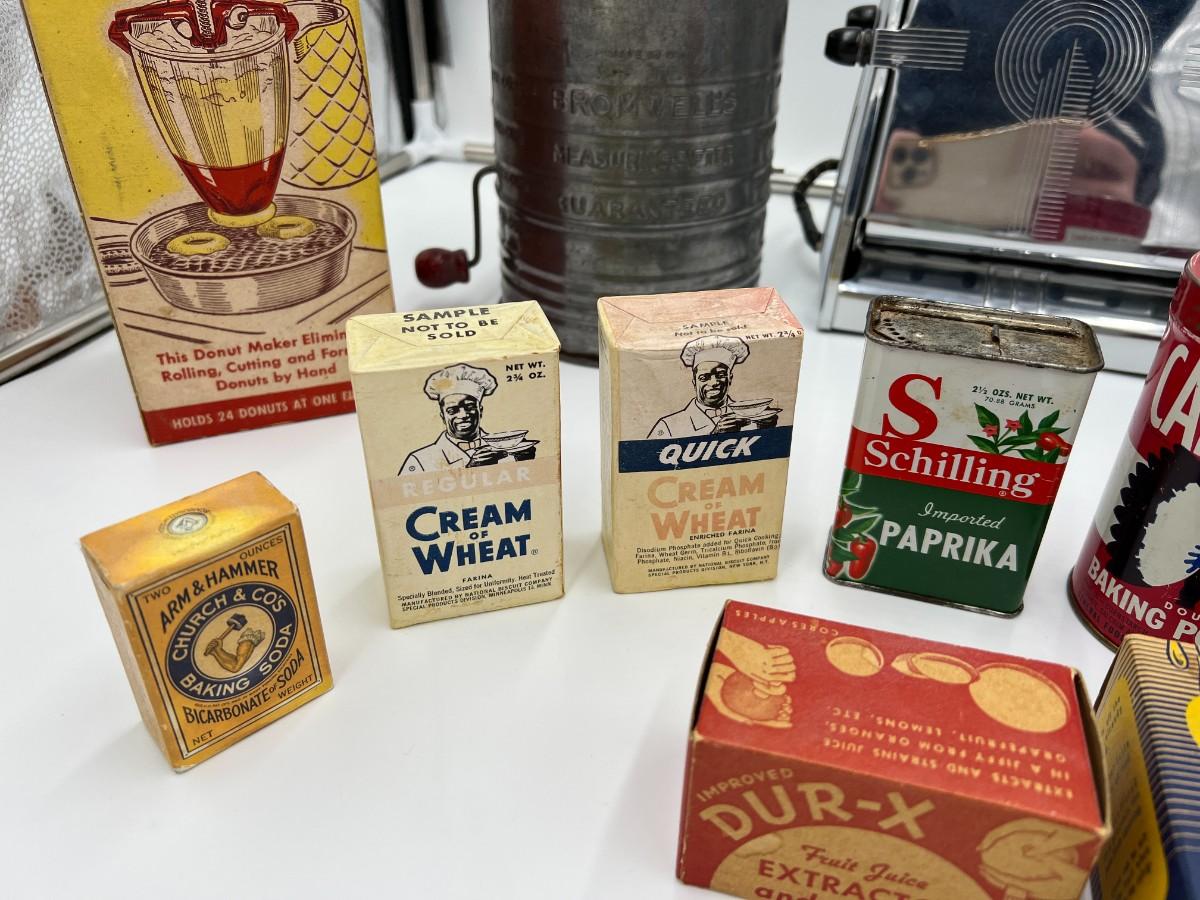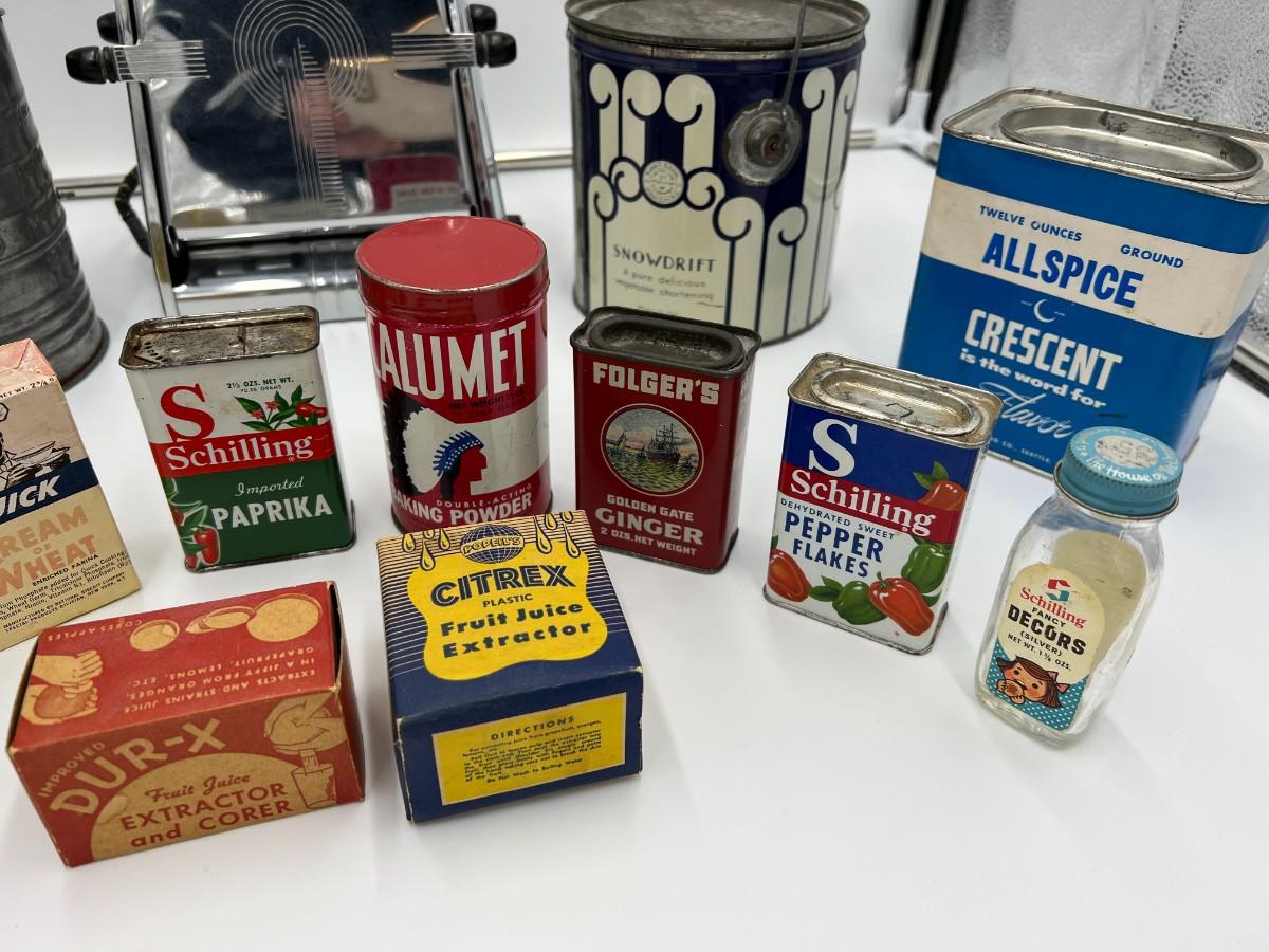 Large Lot of Antique Baking Related Ephemera, Boxes, Tins, Spices, Toaster, and Tools