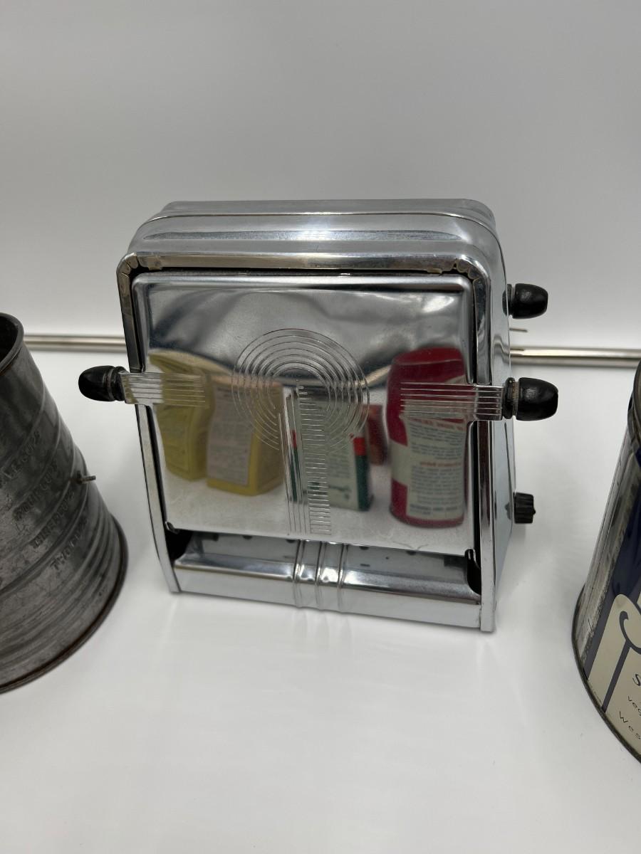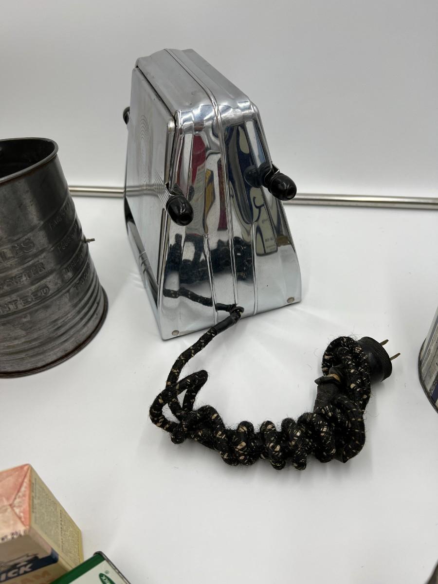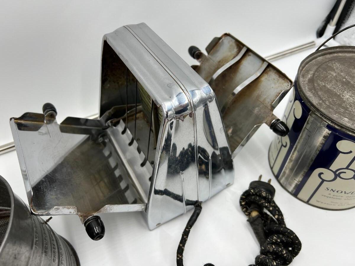 Fantastic large lot of baking-related ephemera and collectibles. Includes; 1940s Westinghous Cat No T LA-4 500 Watt toaster, 1960s Calumet Baking Powder Can, rare antique Folger's Golden Gate Ginger Tin 2 oz, Unopened vintage 2 oz Arm & Hammer Bicarbonate of soda, Unopened 1950s Cream of Wheat Sample Boxes, Bromwells Sifter, Vintage Snowdrift shortening tin, Spry tin, Popeil Brother's Donut Maker, assorted Schilling spice tins, Butternut Bread ruler, packets of vintage sugar, Fisher's cooky book, and multiple vintage cooking tools (spatula, whisk, etc). Condition as shown.