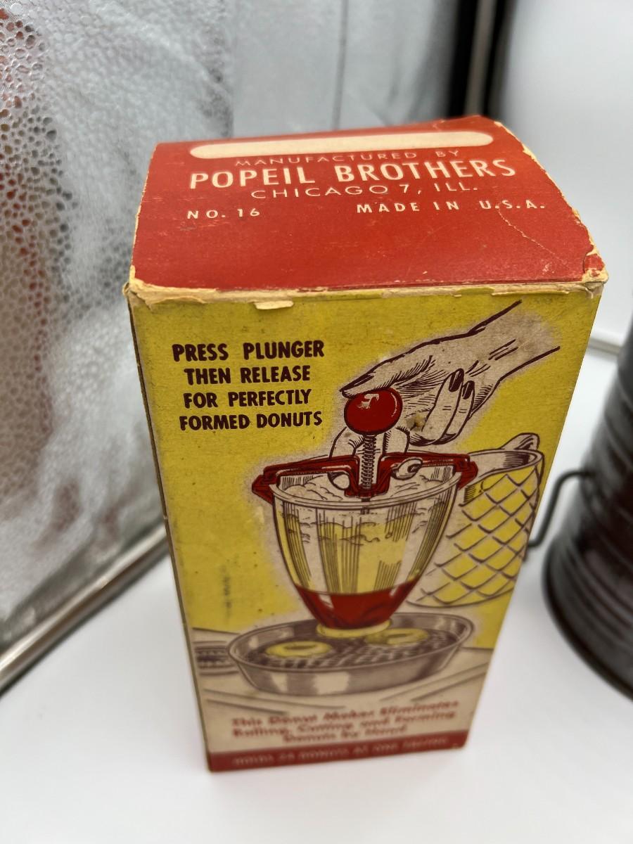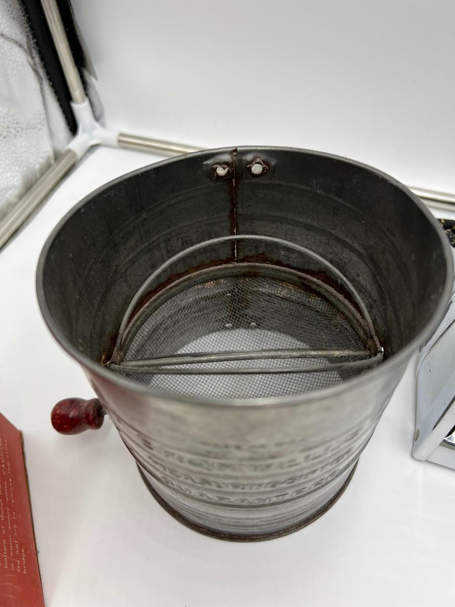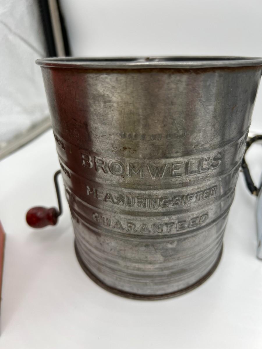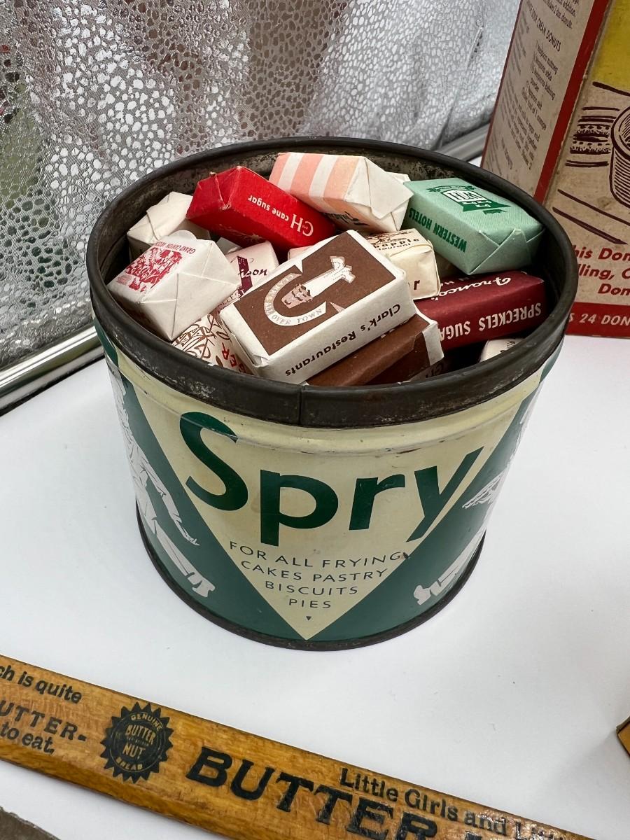 Fantastic large lot of baking-related ephemera and collectibles. Includes; 1940s Westinghous Cat No T LA-4 500 Watt toaster, 1960s Calumet Baking Powder Can, rare antique Folger's Golden Gate Ginger Tin 2 oz, Unopened vintage 2 oz Arm & Hammer Bicarbonate of soda, Unopened 1950s Cream of Wheat Sample Boxes, Bromwells Sifter, Vintage Snowdrift shortening tin, Spry tin, Popeil Brother's Donut Maker, assorted Schilling spice tins, Butternut Bread ruler, packets of vintage sugar, Fisher's cooky book, and multiple vintage cooking tools (spatula, whisk, etc). Condition as shown.