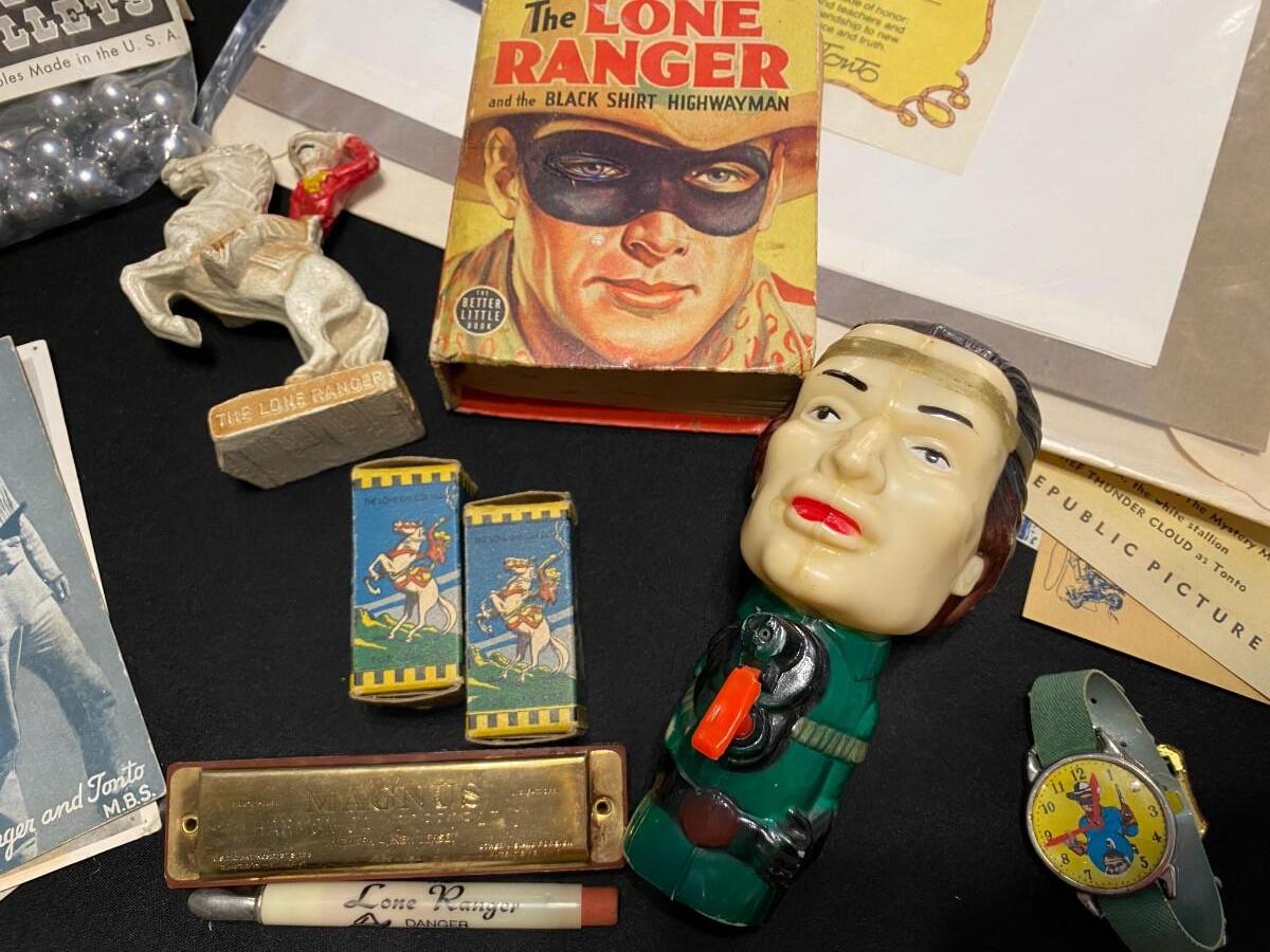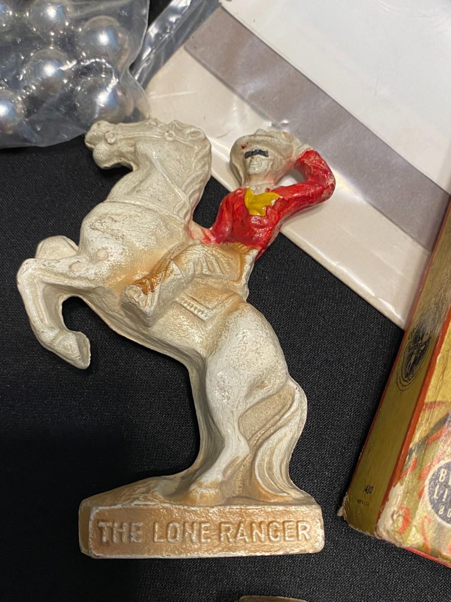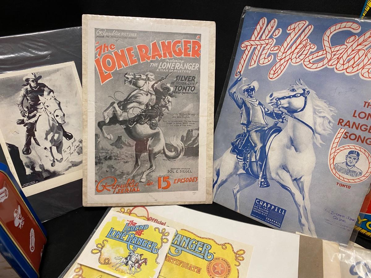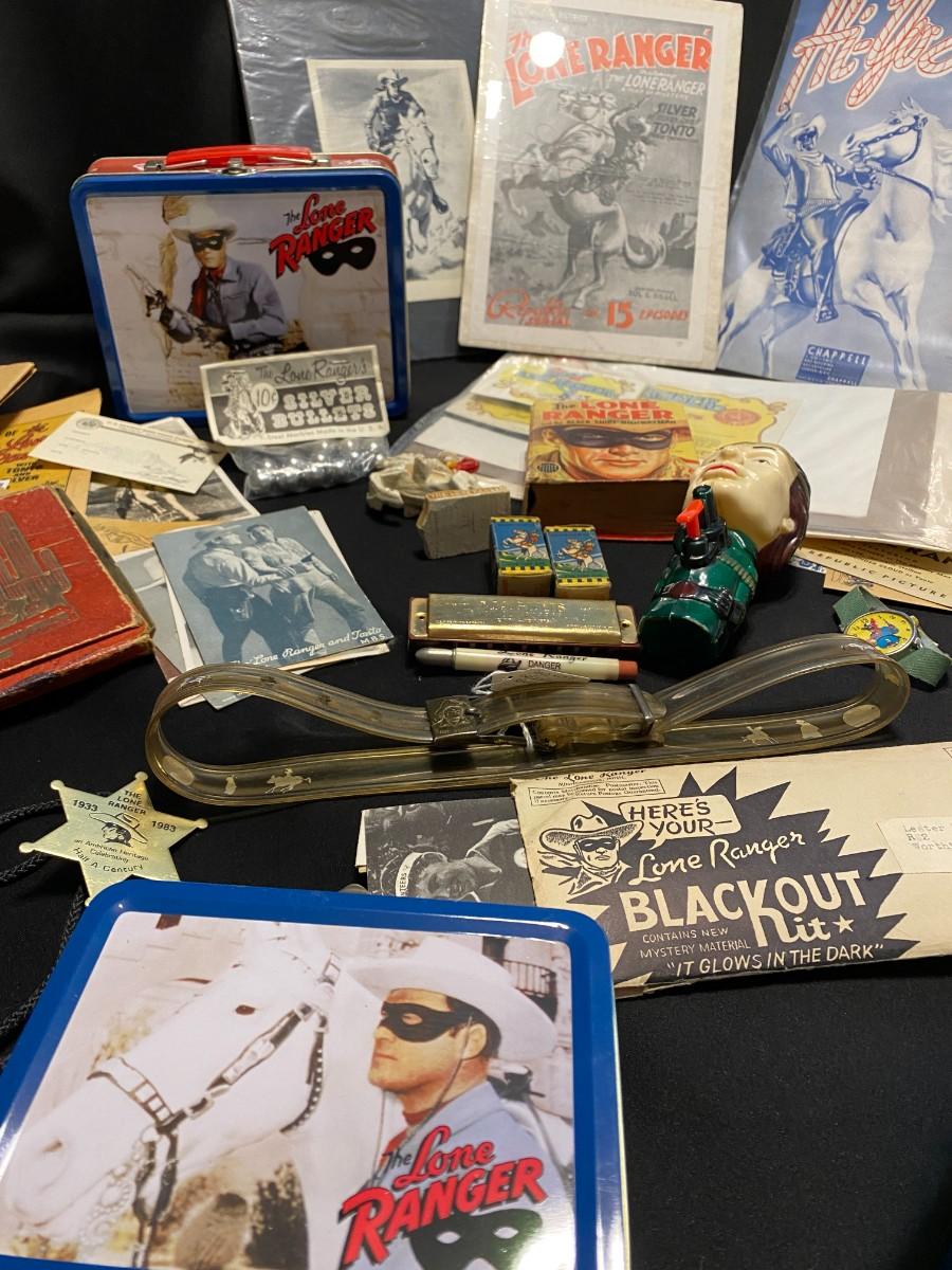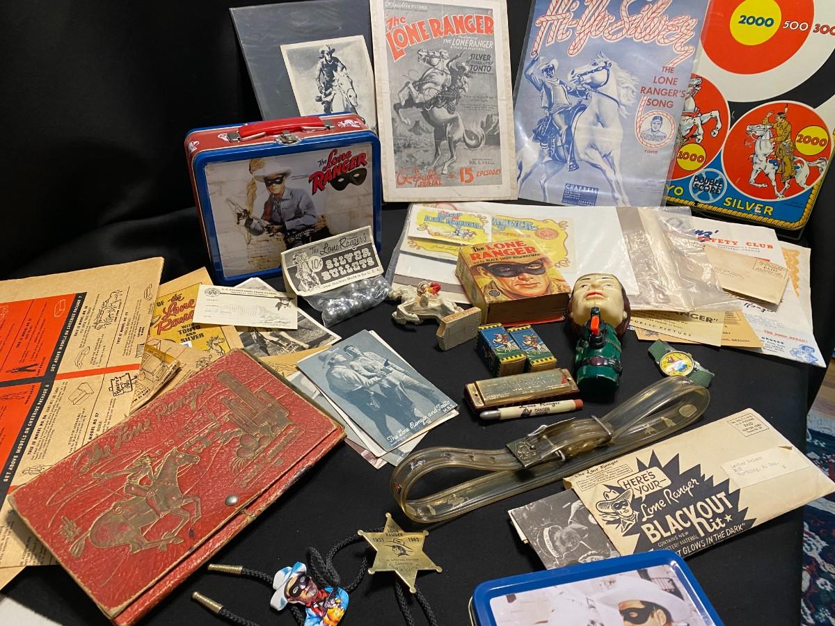 Large Lot of Antique Lone Ranger Collectibles Chalkware Maps Lunchbox Belt Star Badge and Ephemera