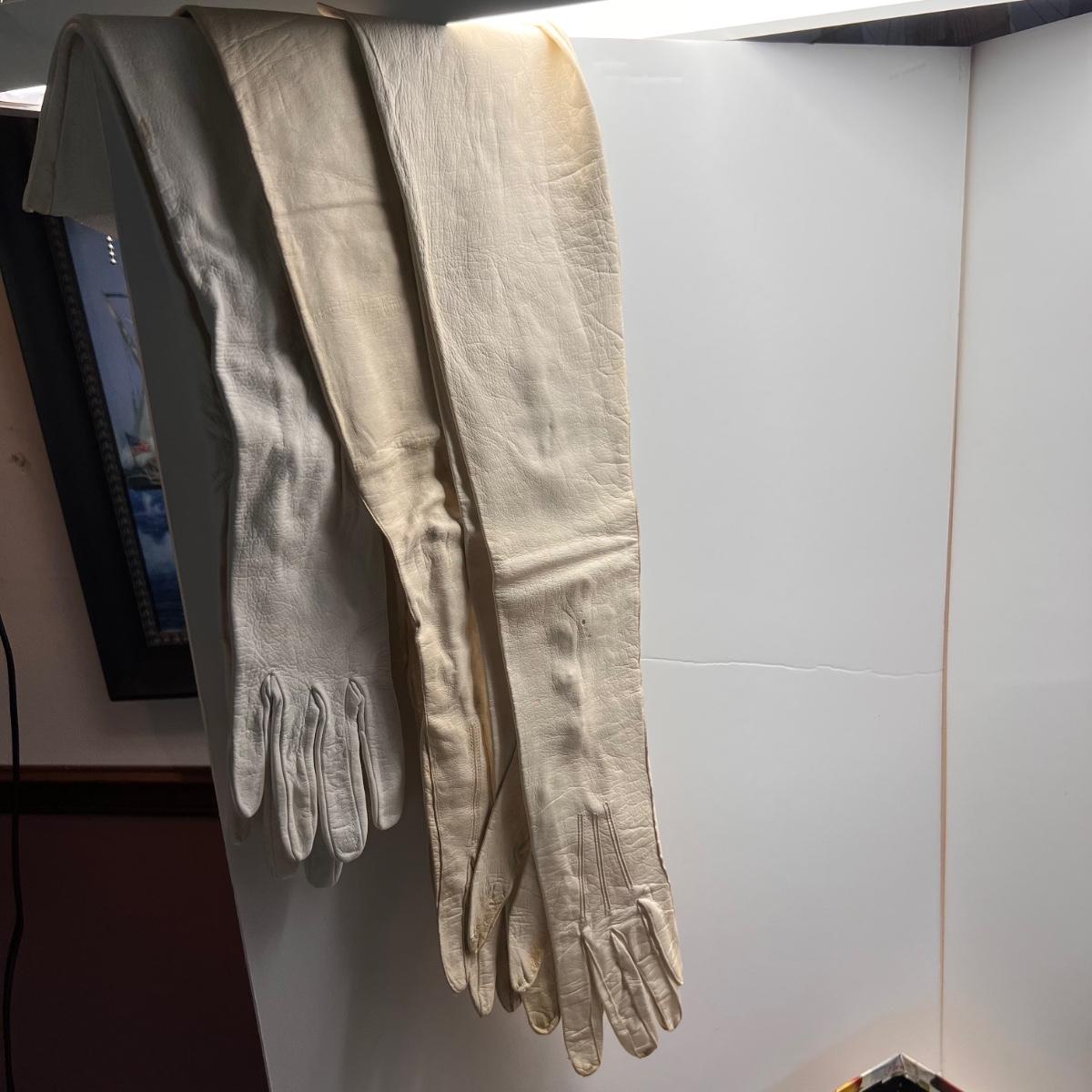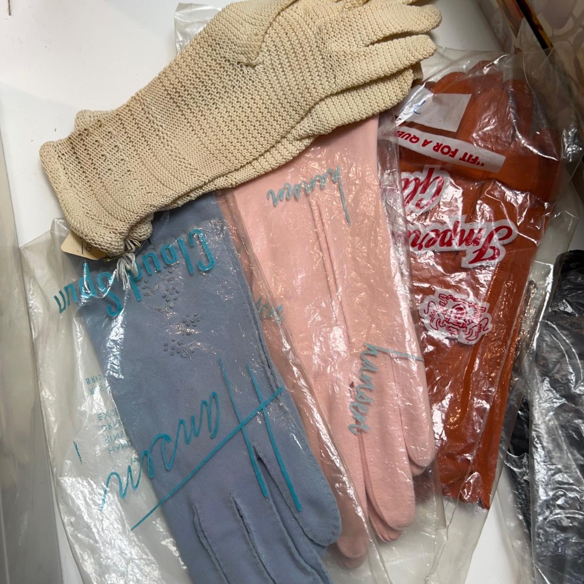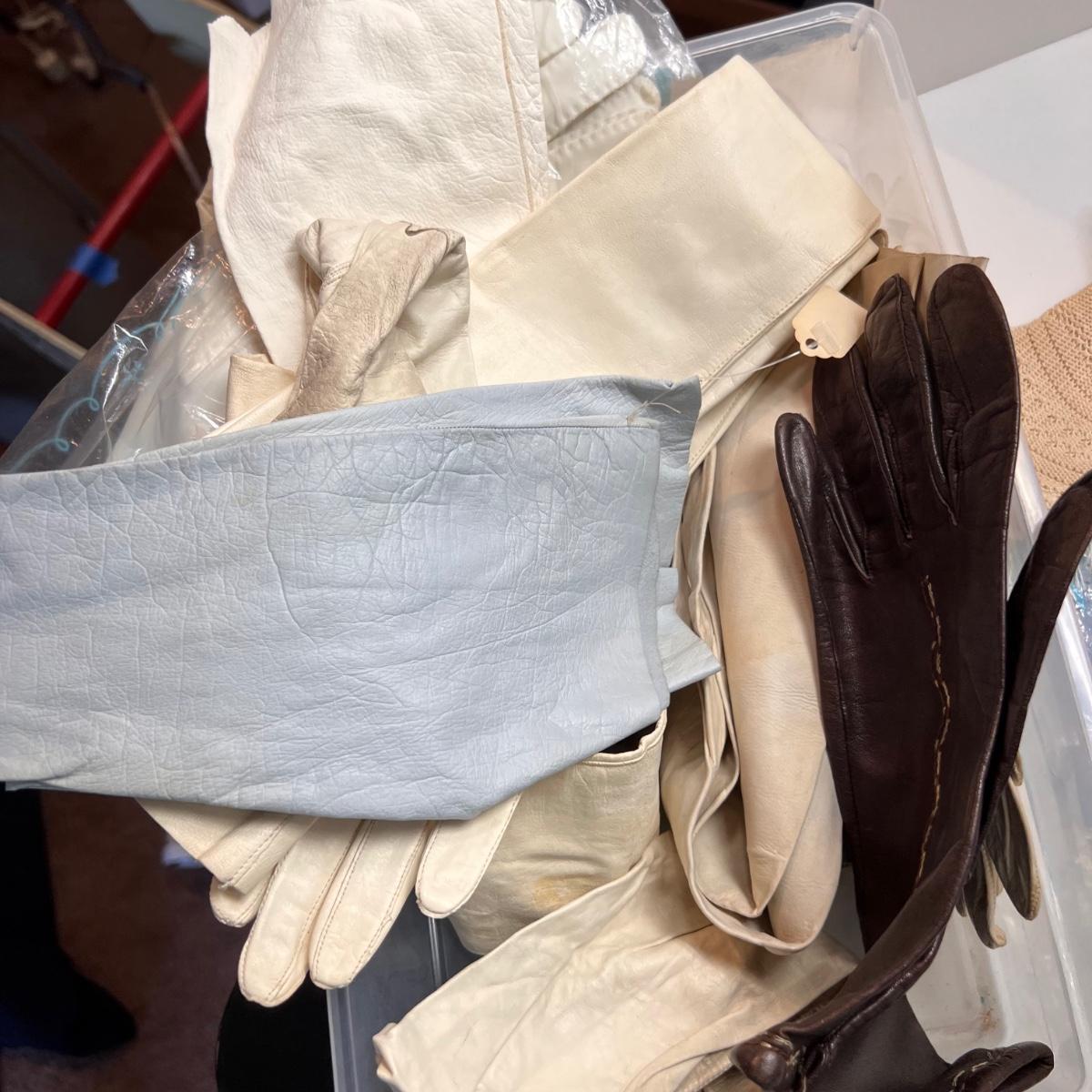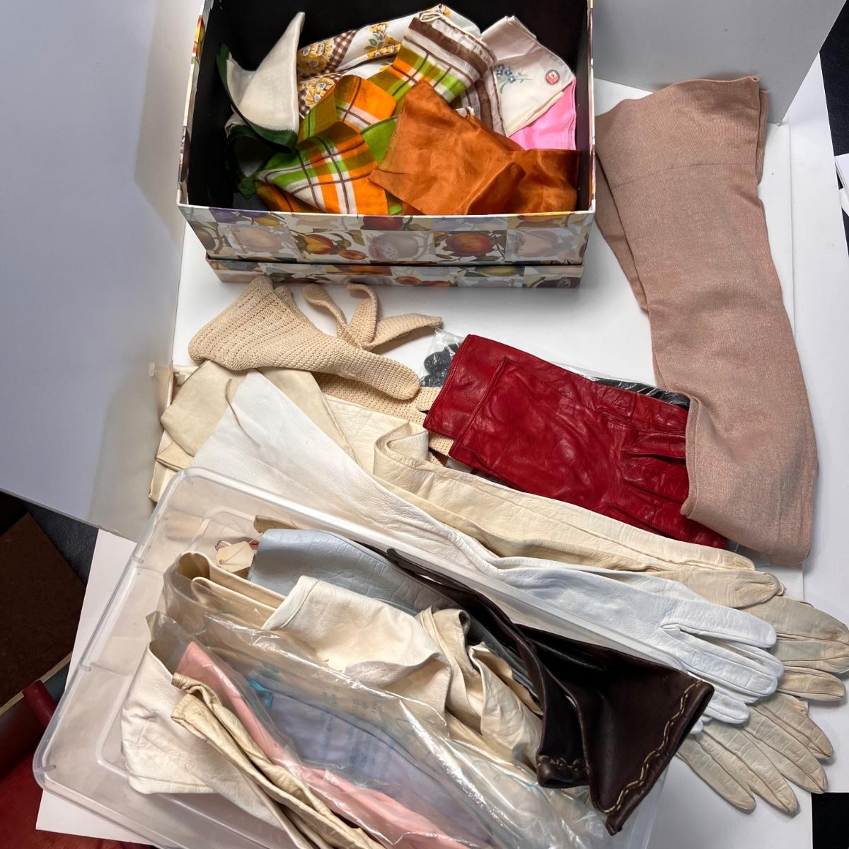Large box of vintage gloves including opera, mid-length and wrist lengths. Various sizes. Leather, cotton, crochet, cotton. 1 pair of thigh-high stockings. Small collection of silk and cotton hankies
