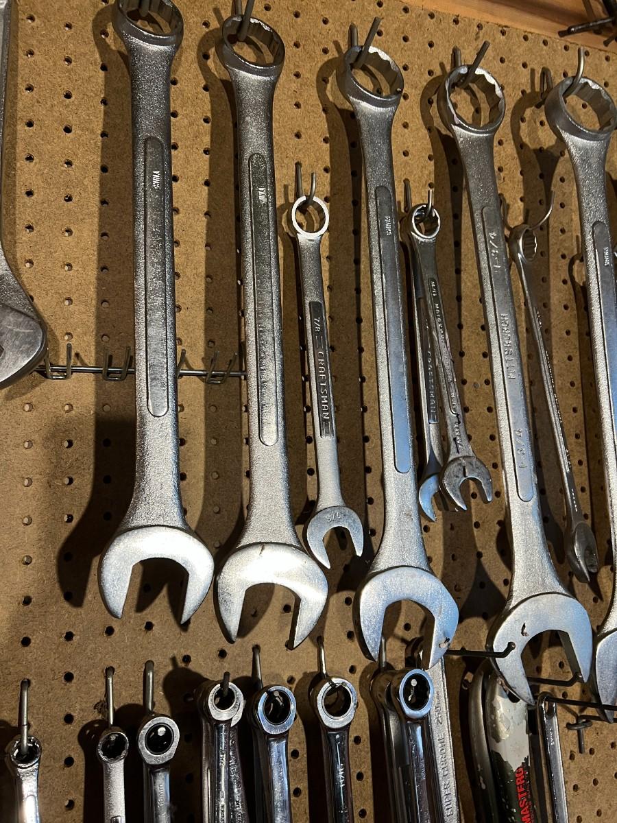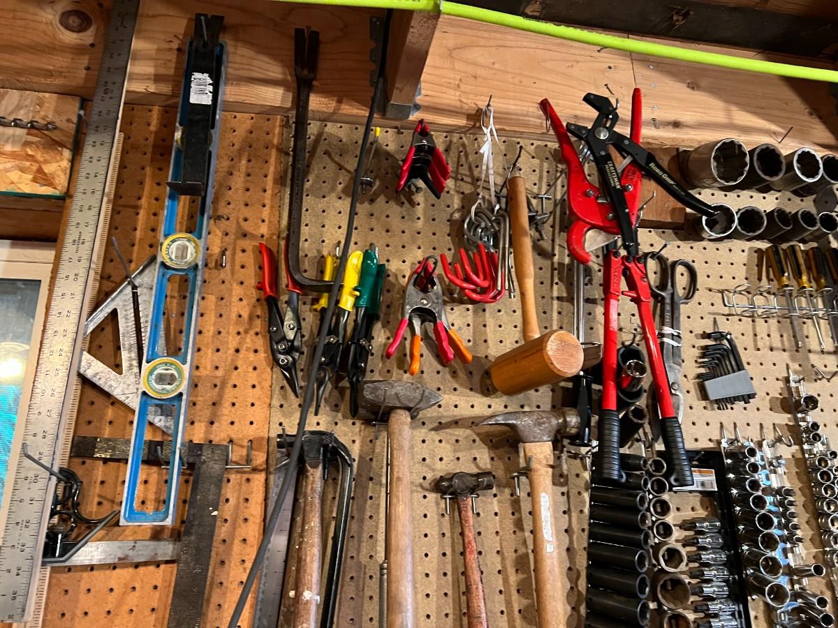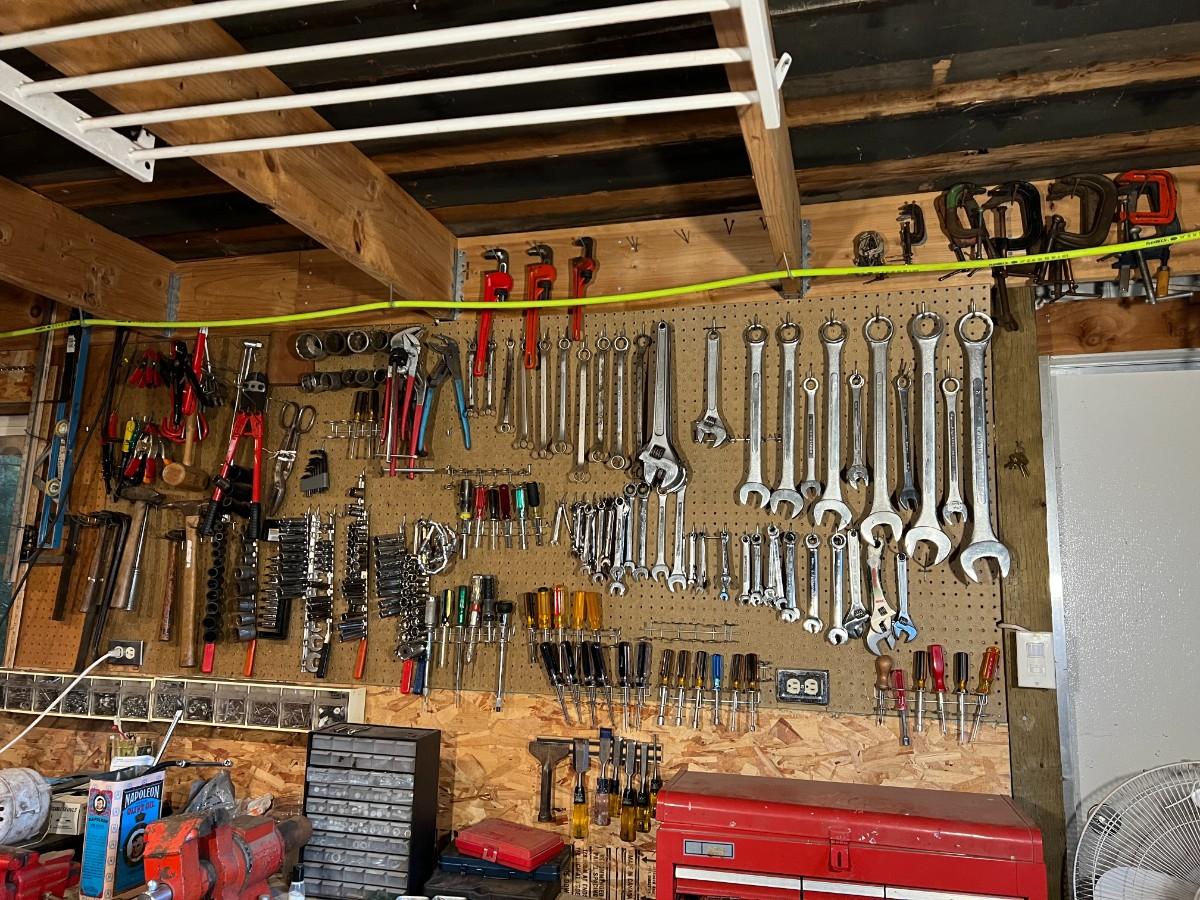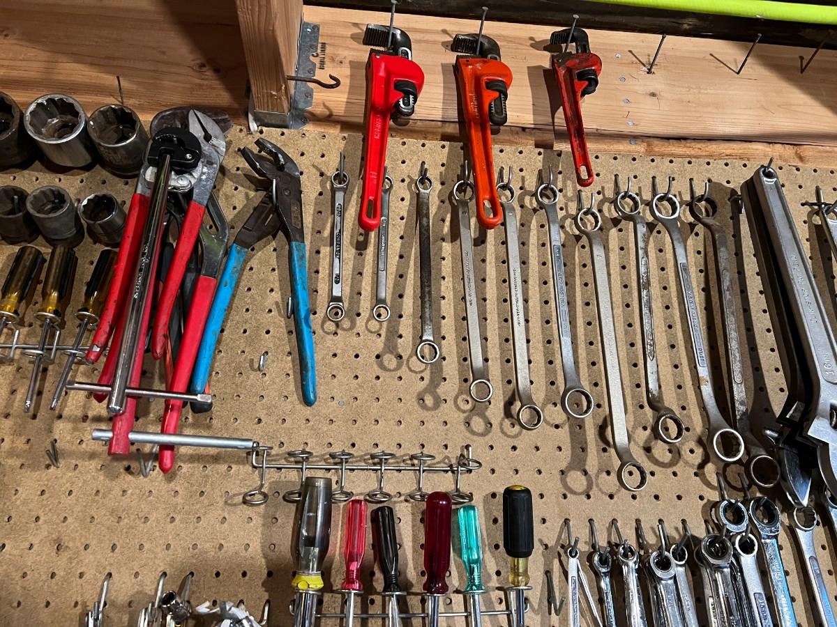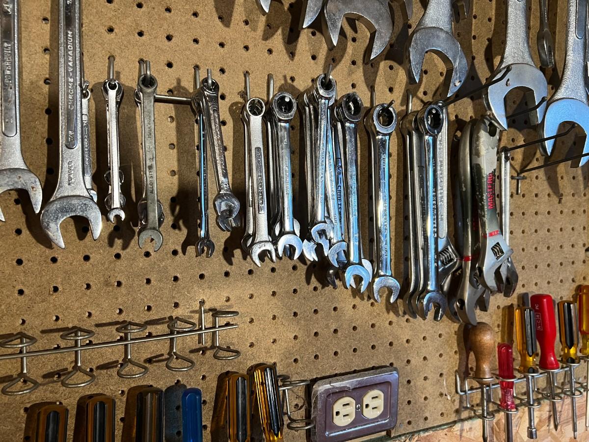 Large Lot of Assorted Tools incl. Wrenches, Screwdrivers, Clamps, Hammers, and More. Includes all tools mounted on the wall within the outlined red area in the first photo. Good used condition, as shown in photos.