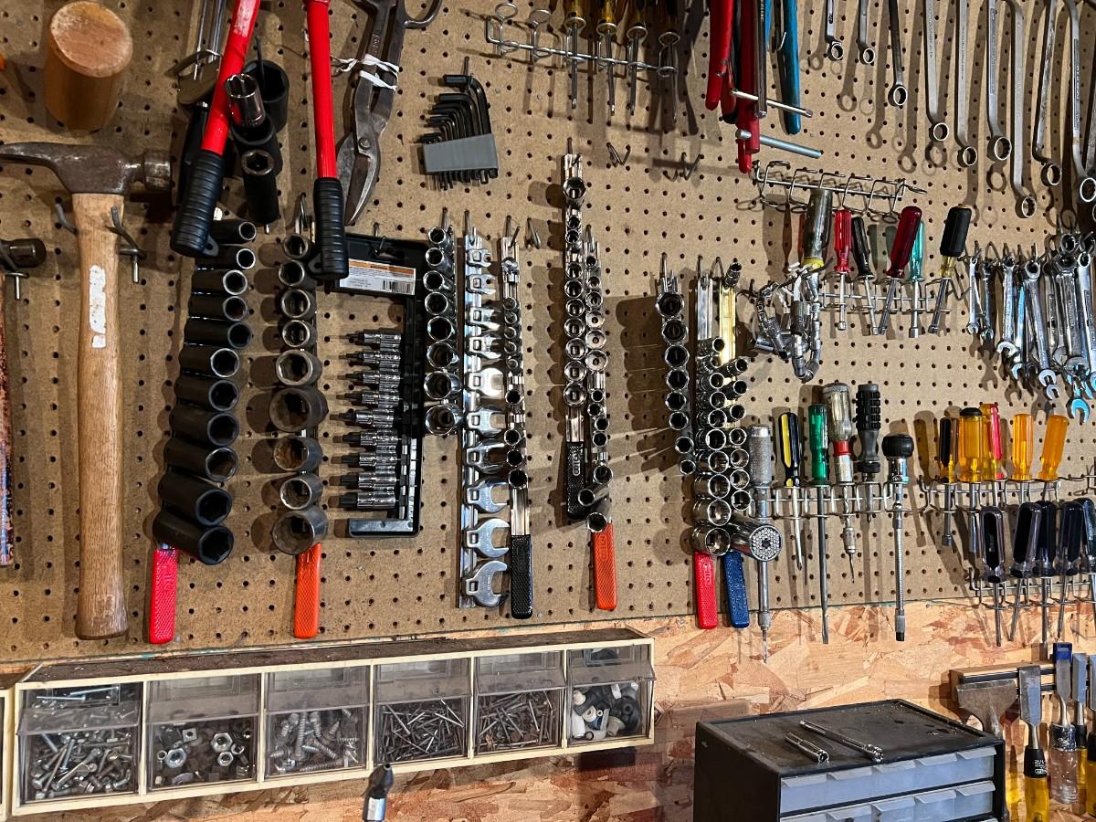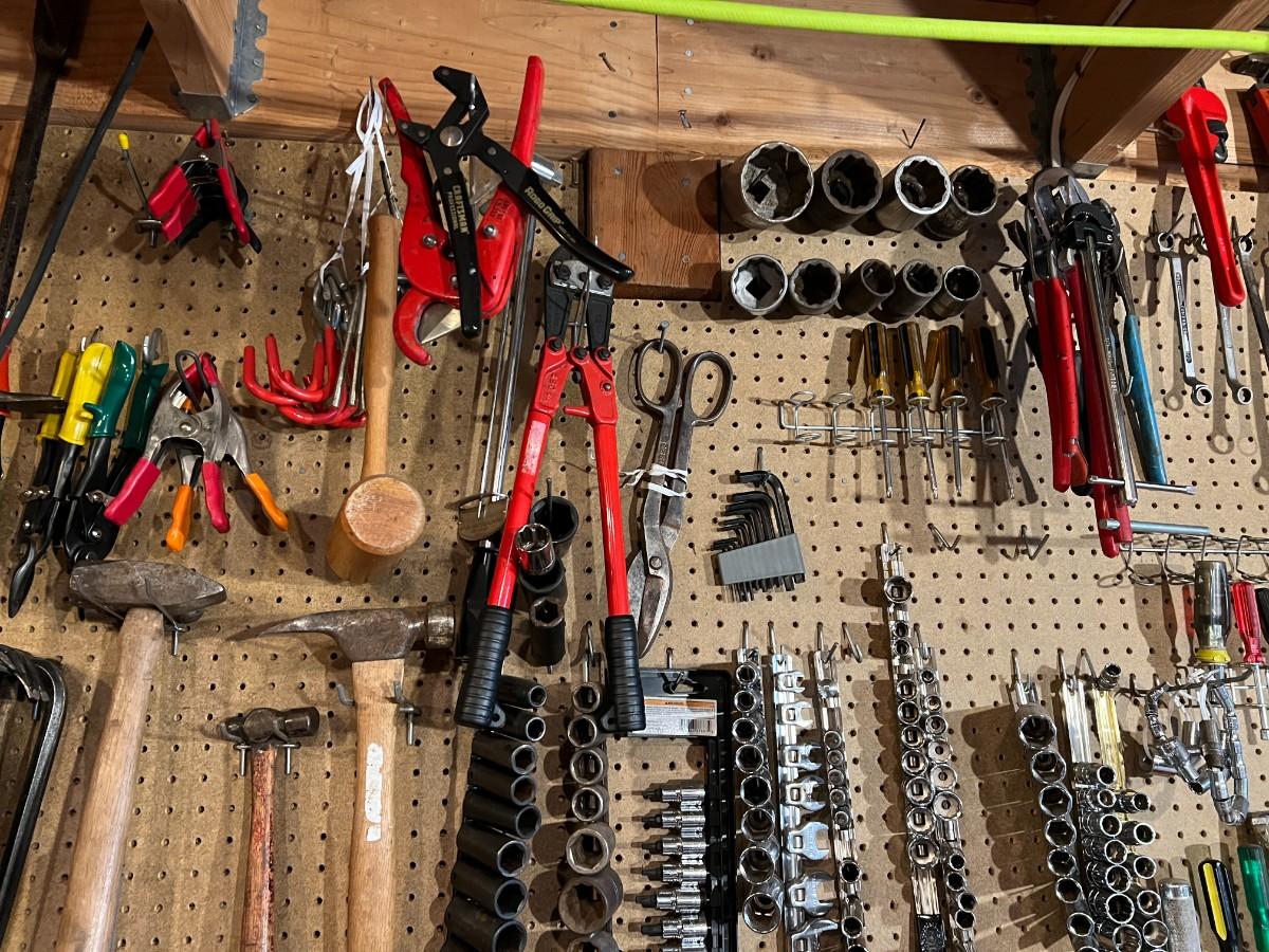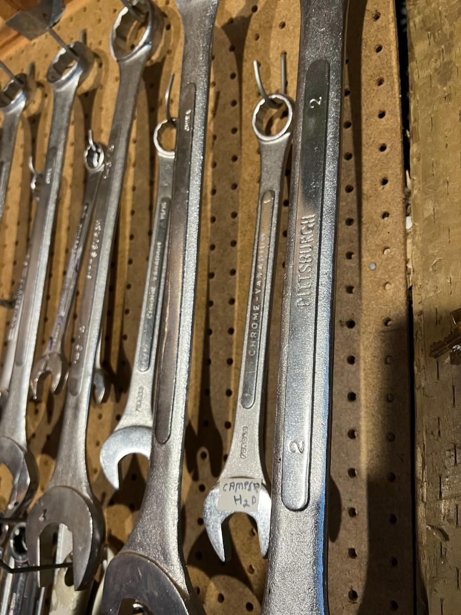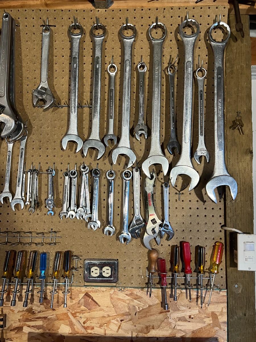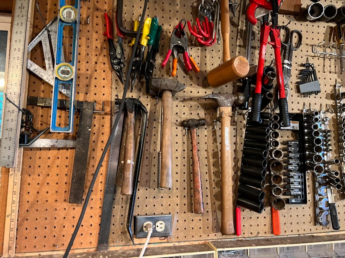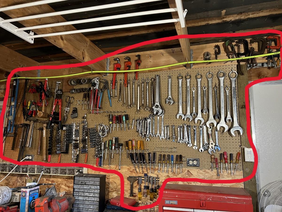 Large Lot of Assorted Tools incl. Wrenches, Screwdrivers, Clamps, Hammers, and More. Includes all tools mounted on the wall within the outlined red area in the first photo. Good used condition, as shown in photos.