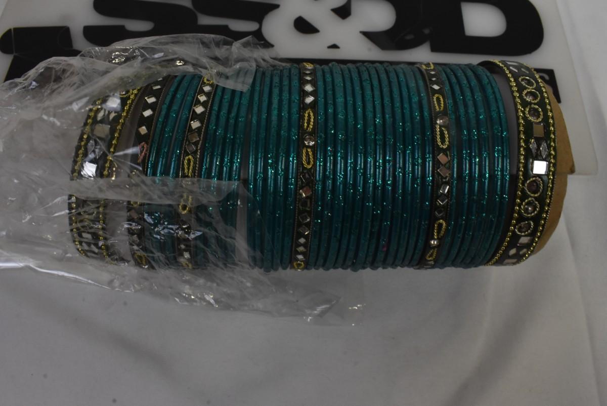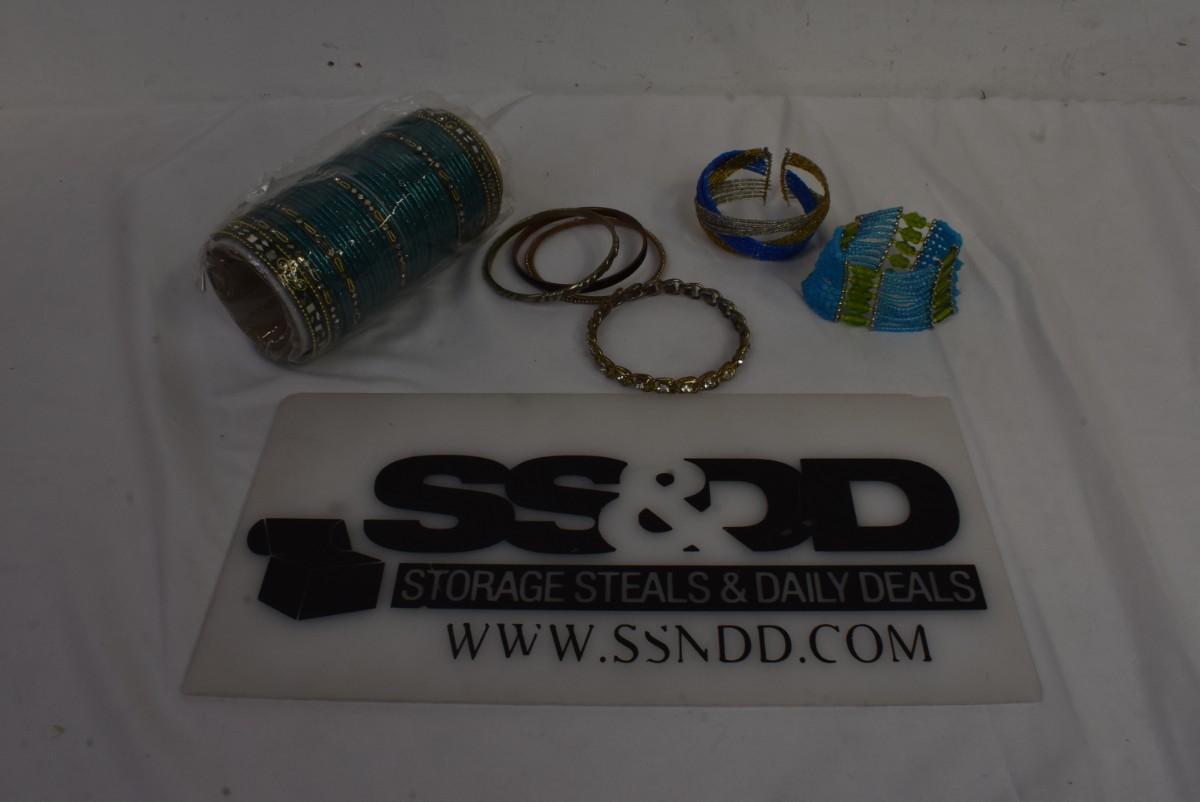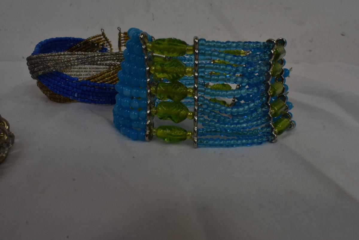 Large lot of Bangles & Beaded Bracelets: multi colors: blues, green, brown, silver, gold 1 w/ rhinestones