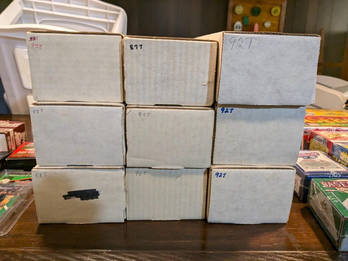 Boxes on left have been opened, middle opened but show no wear, and right are unopened