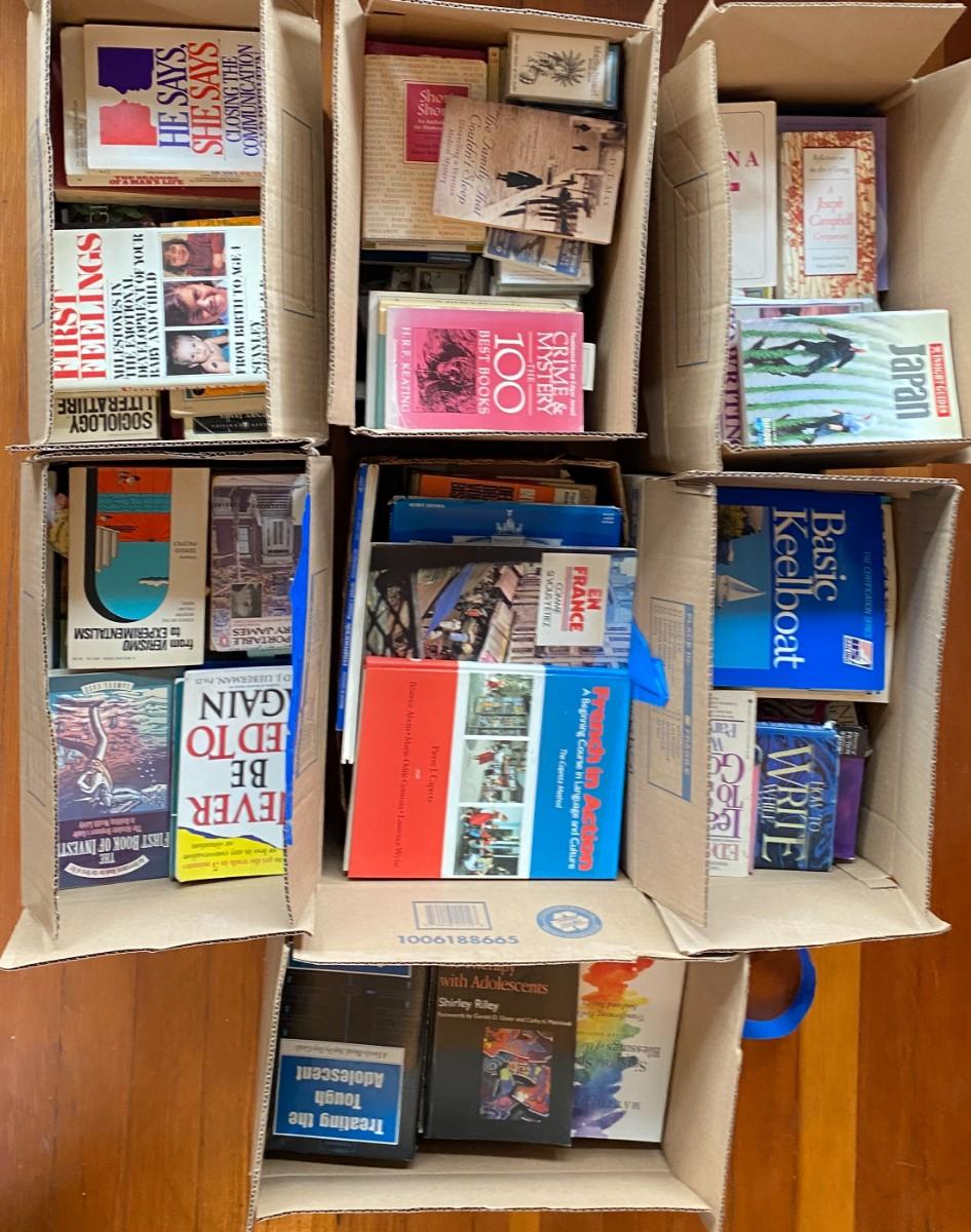 7 boxes of vintage books from the 1960's and nerwer along with cassette tapes and cd's, qty