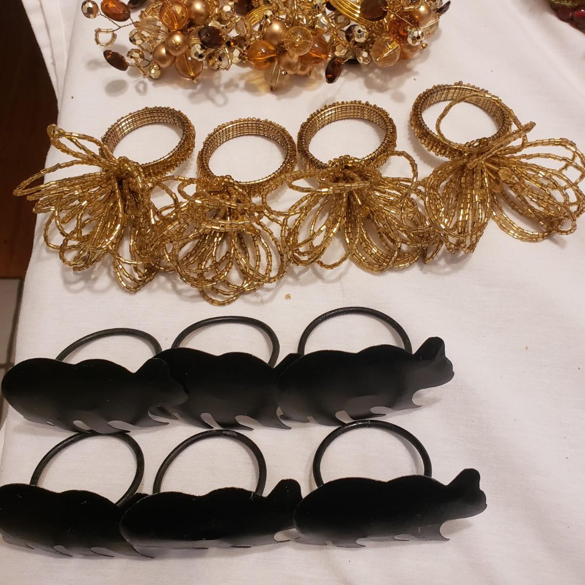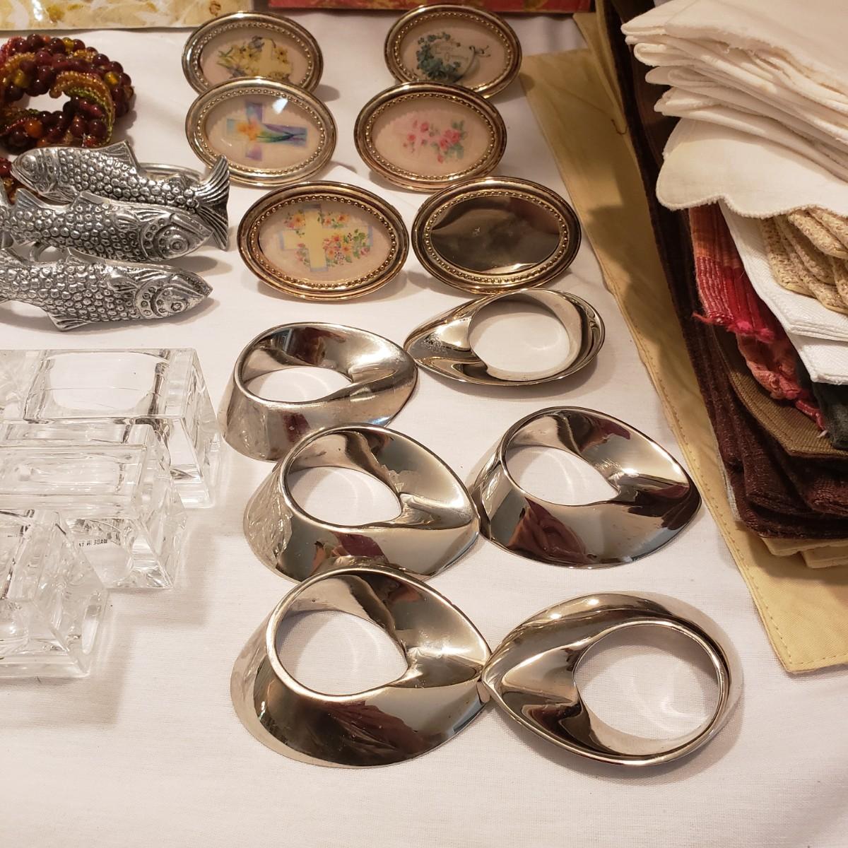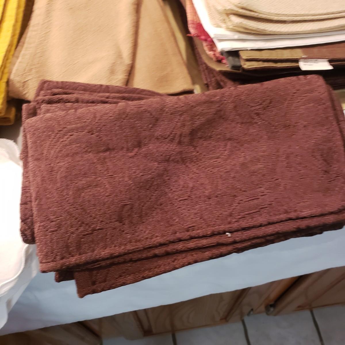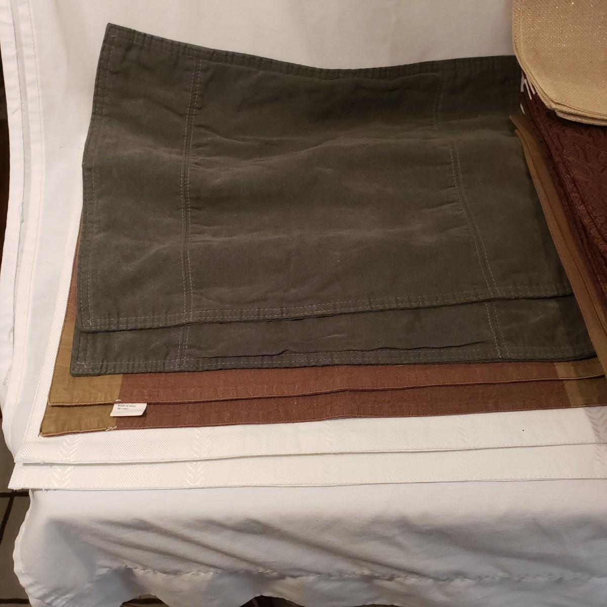 This is a large lot of cloth napkins and rings, table cloths, runners and placemats. See pictures for the details on the napkin rings. The cloth napkins have a wide variety of patterns and amounts of each. The two table runners in floral and rabbit patterns are both 6 feet long. The 8 sets of placemats also come in a variety of patterns and amounts. See pictures. The seven table cloths range in sizes from 63"x80" to 55"x72". The are all rectangular, except for the white/black/red flowered, it is oval and made of polyester. The majority of the linens are a linen and cotton blend.
