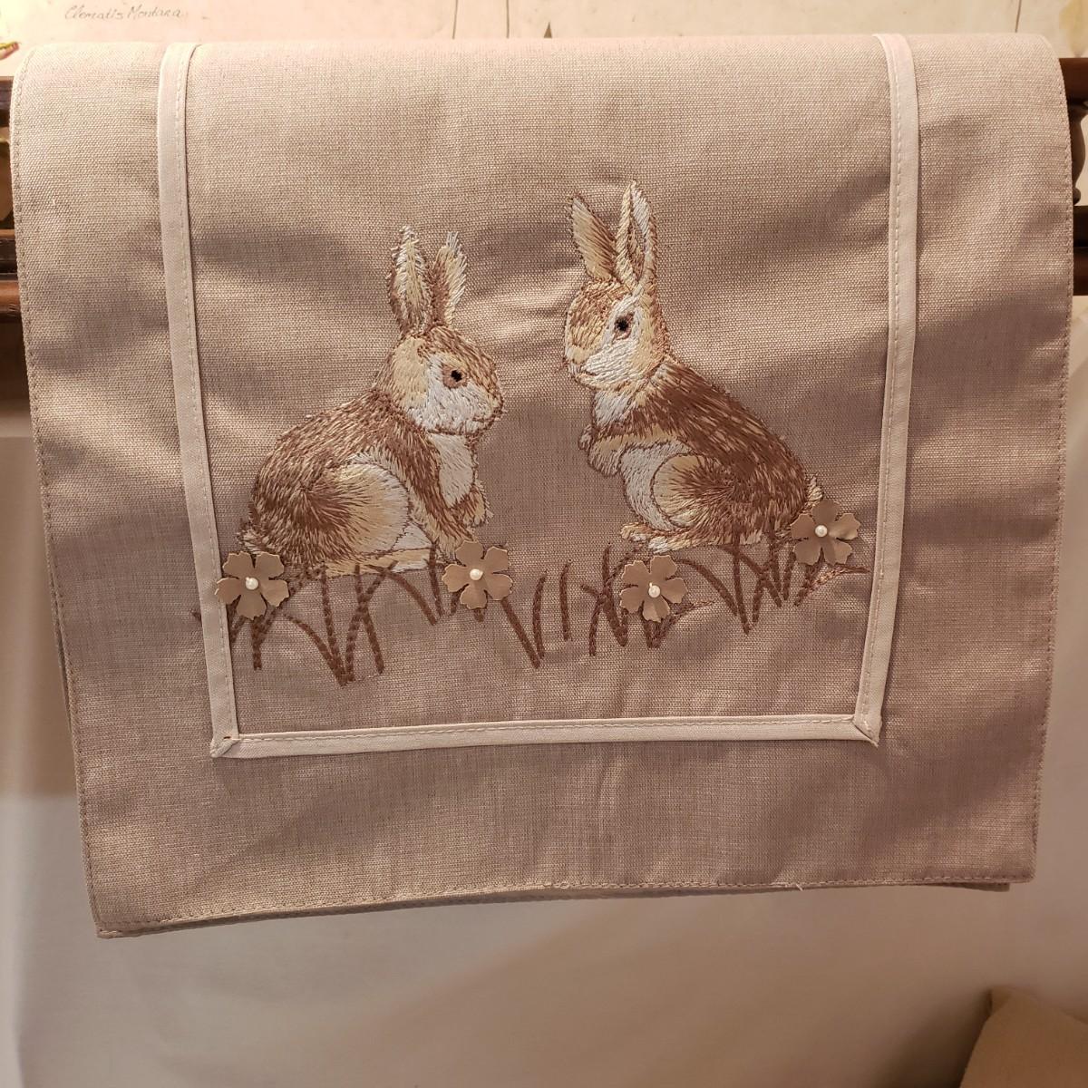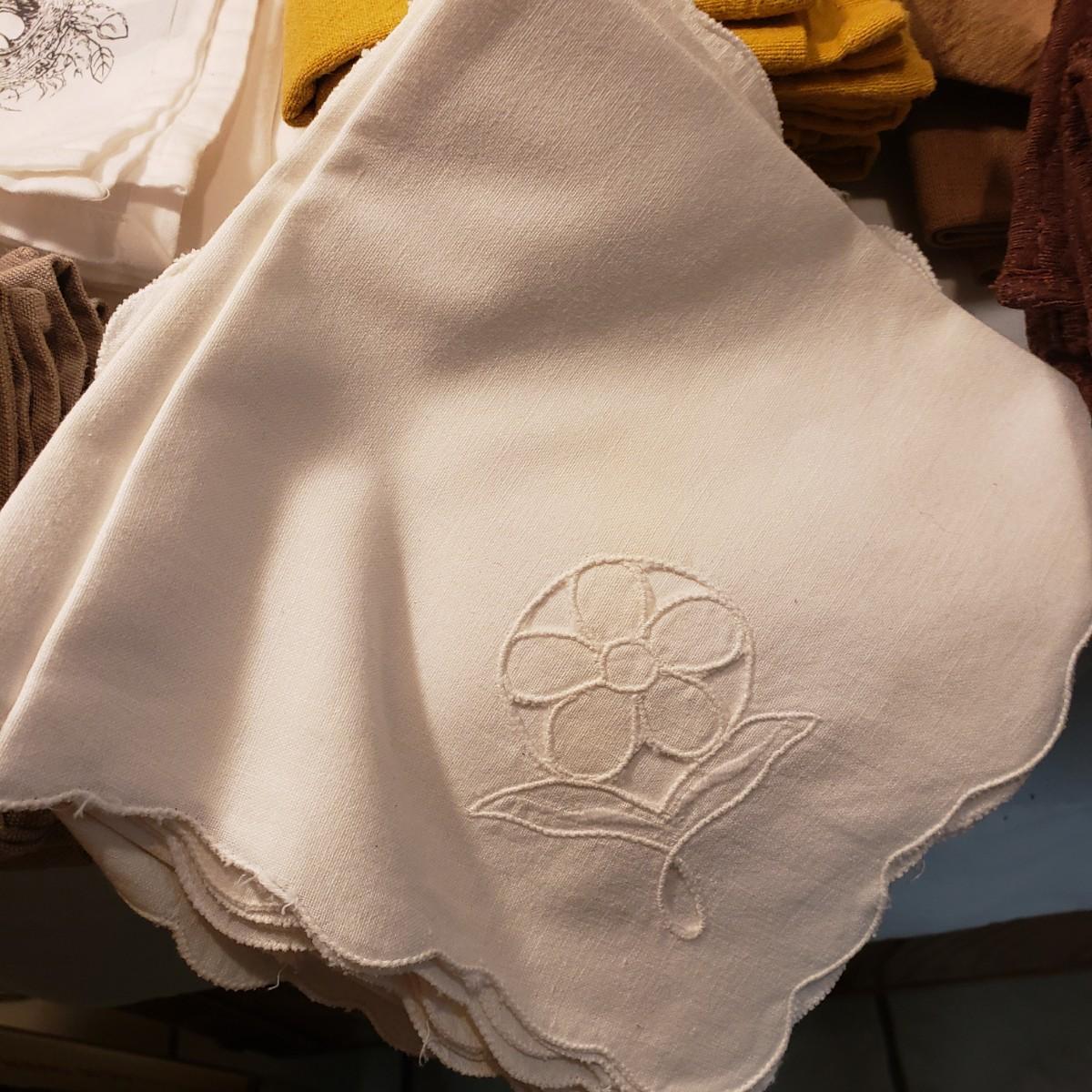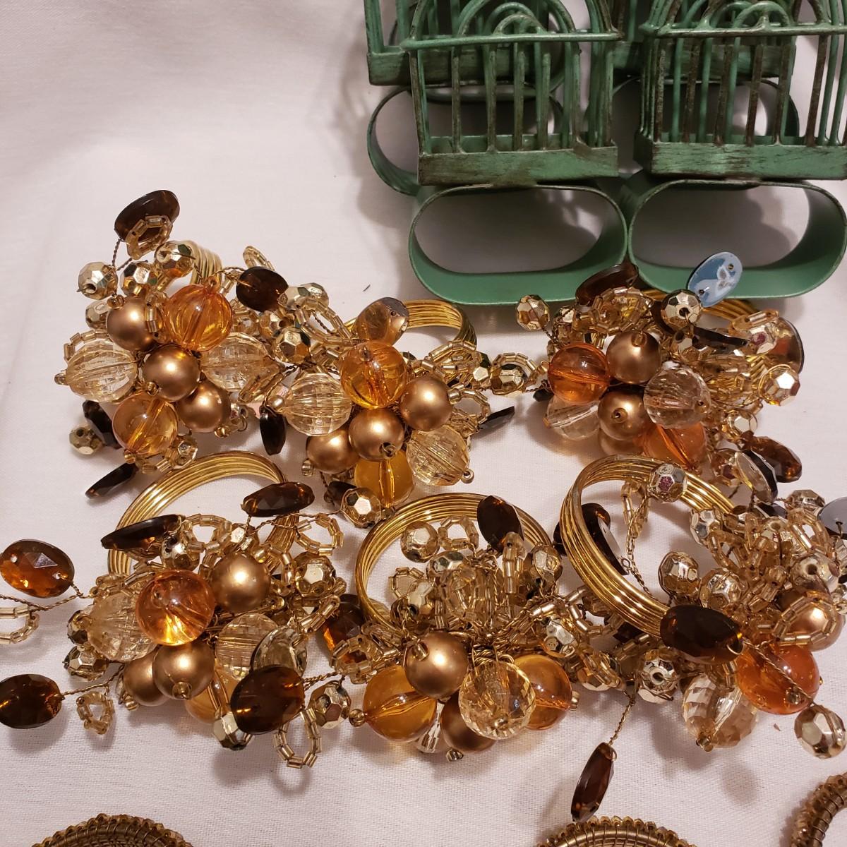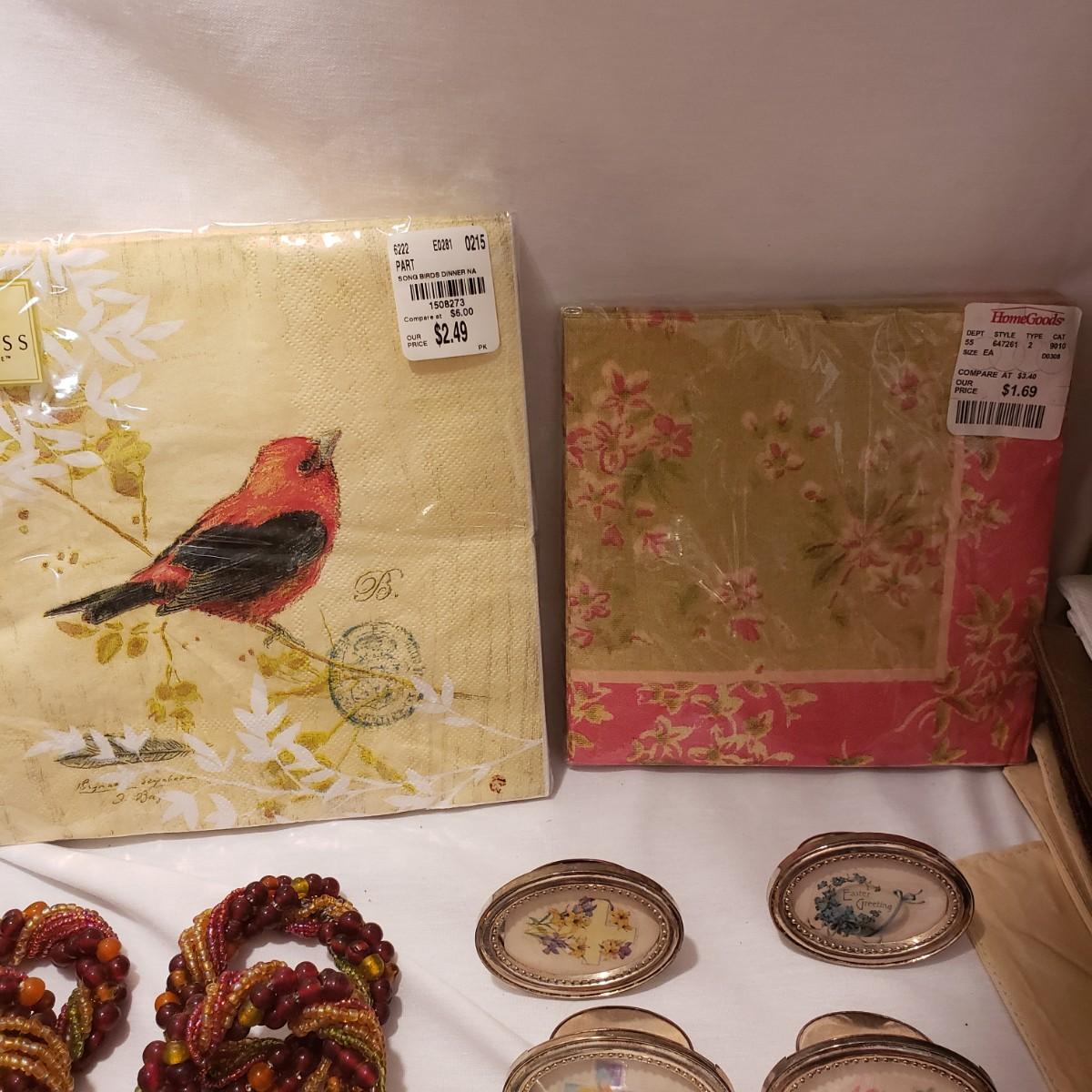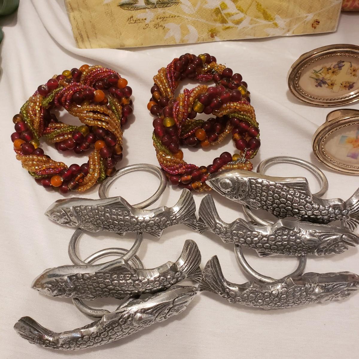This is a large lot of cloth napkins and rings, table cloths, runners and placemats. See pictures for the details on the napkin rings. The cloth napkins have a wide variety of patterns and amounts of each. The two table runners in floral and rabbit patterns are both 6 feet long. The 8 sets of placemats also come in a variety of patterns and amounts. See pictures. The seven table cloths range in sizes from 63"x80" to 55"x72". The are all rectangular, except for the white/black/red flowered, it is oval and made of polyester. The majority of the linens are a linen and cotton blend.