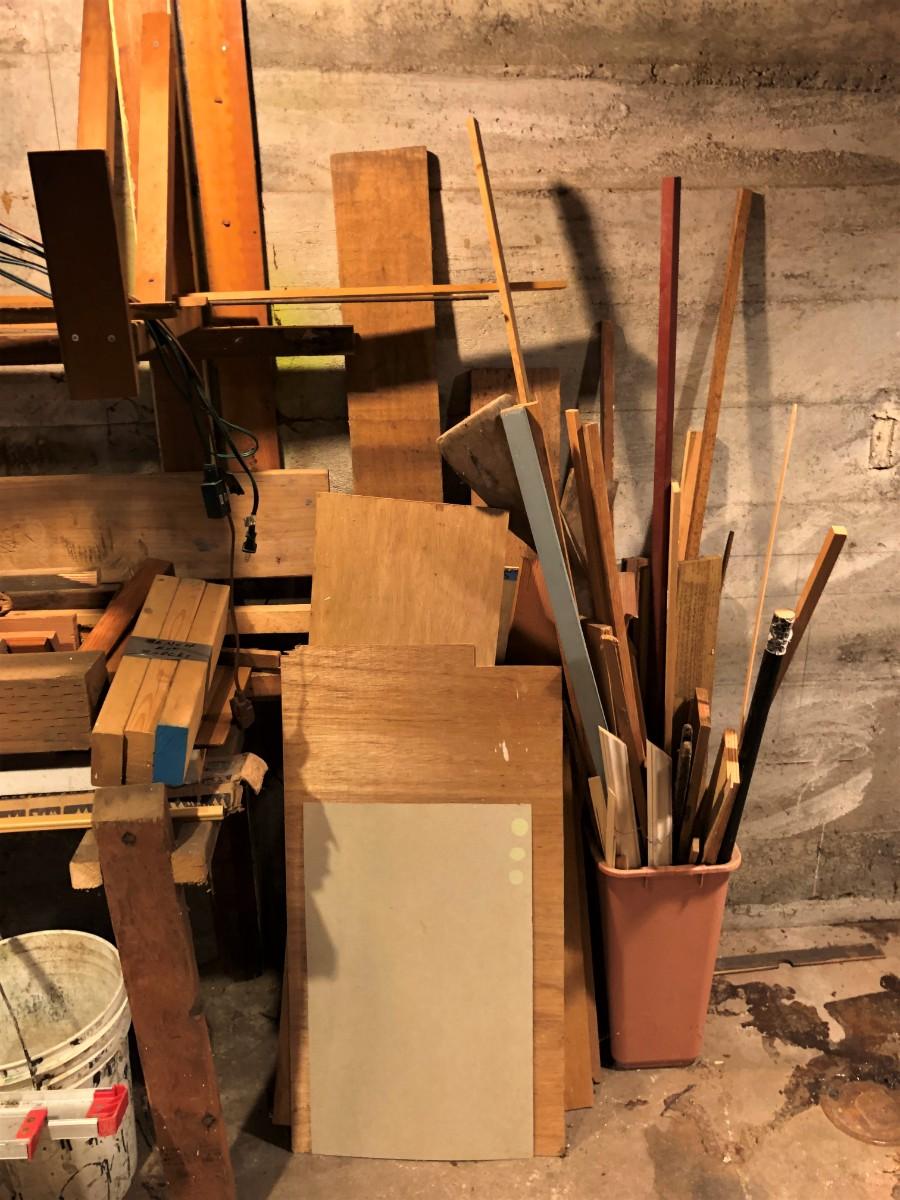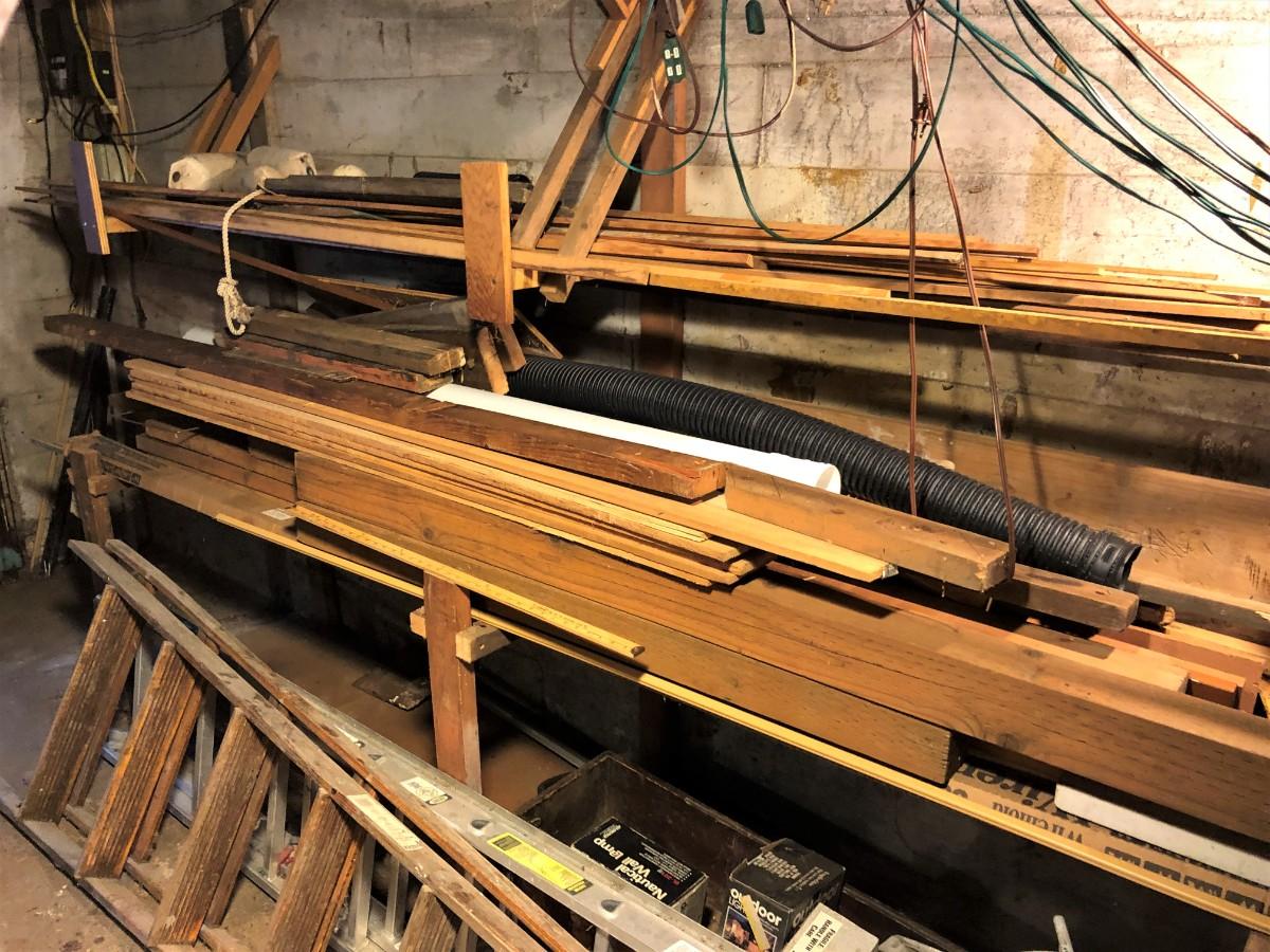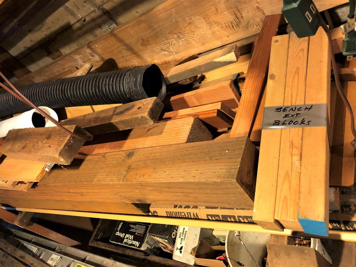 Large lot of various types of wood for construction projects around the house- was from an estate's workshop. Includes wood beams, planks, and scraps of various sizes. Includes all the wood pieces on the shelves and in the bucket next to the shelves (not the shelves themselves). Condition as shown.