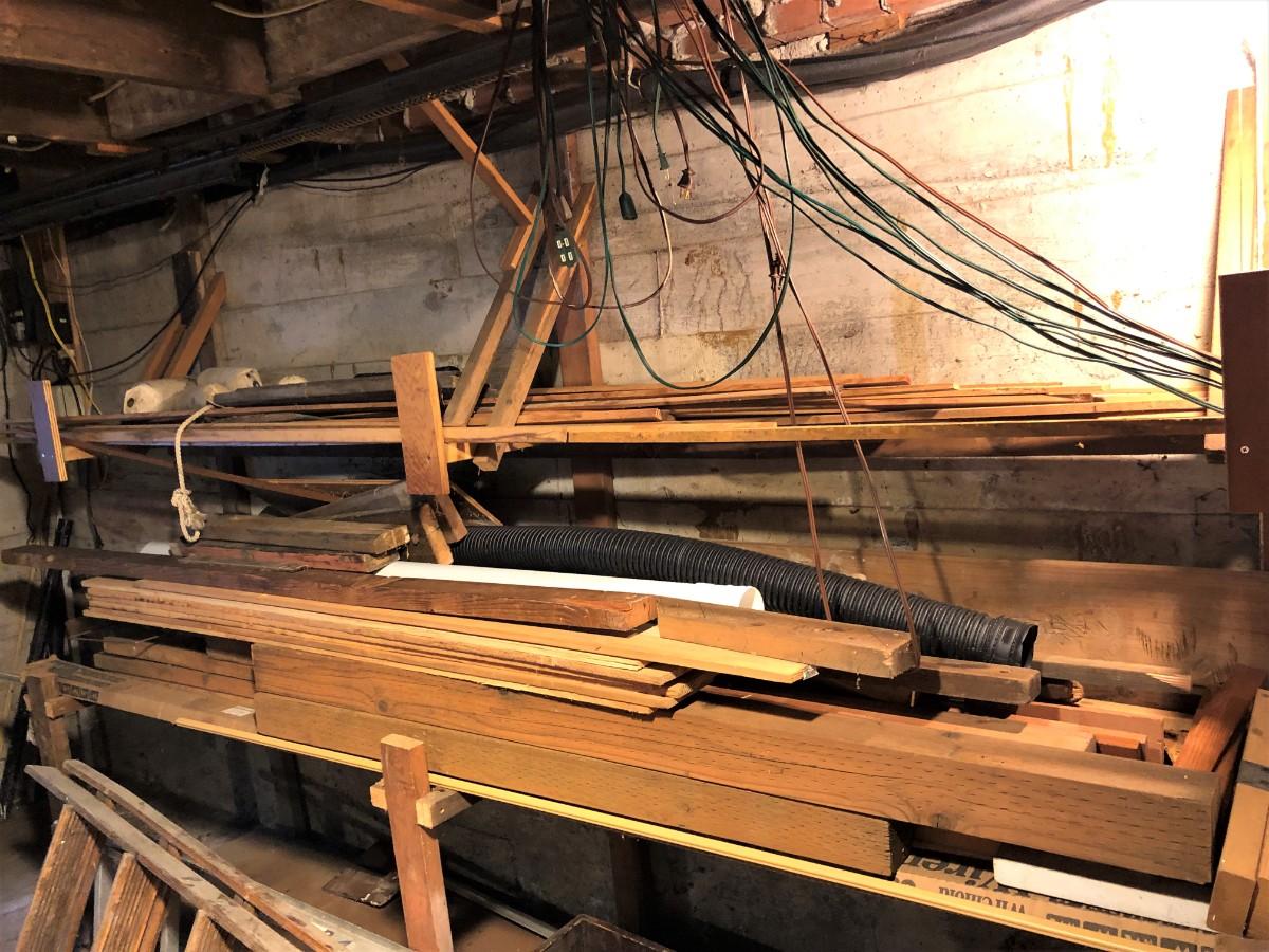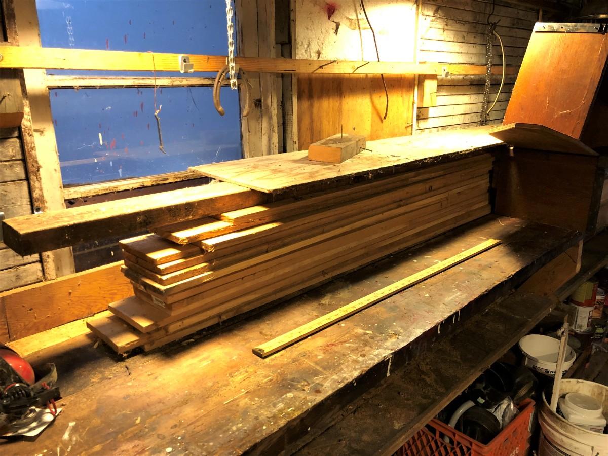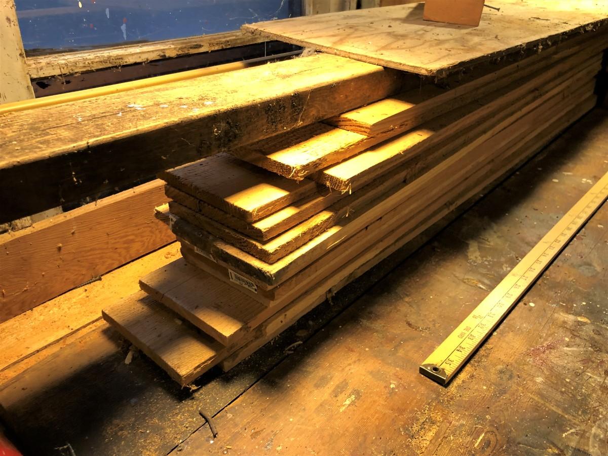 Large lot of various types of wood for construction projects around the house- was from an estate's workshop. Includes wood beams, planks, and scraps of various sizes. Includes all the wood pieces on the shelves and in the bucket next to the shelves (not the shelves themselves). Condition as shown.