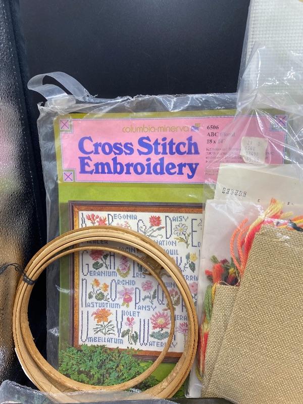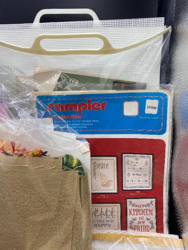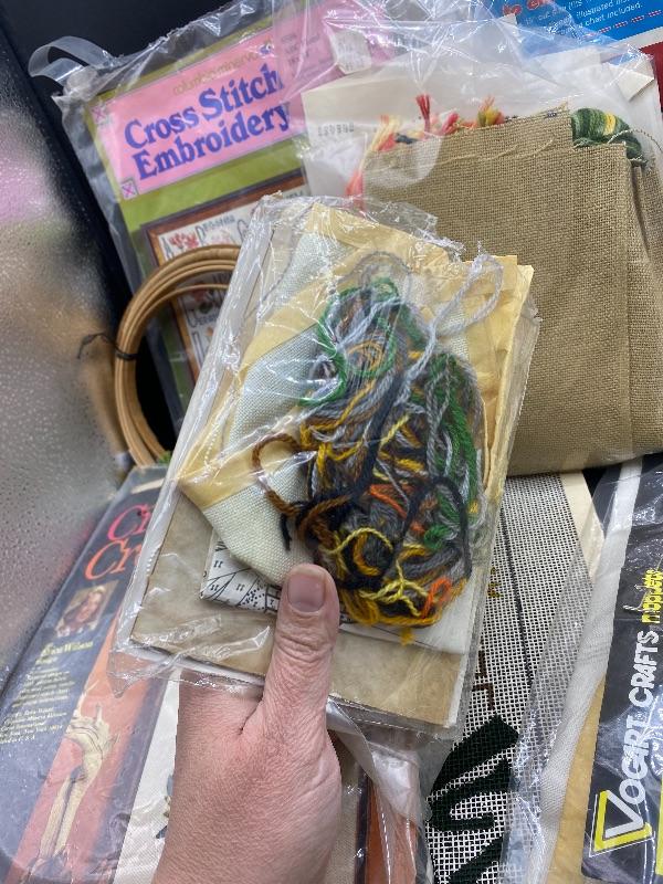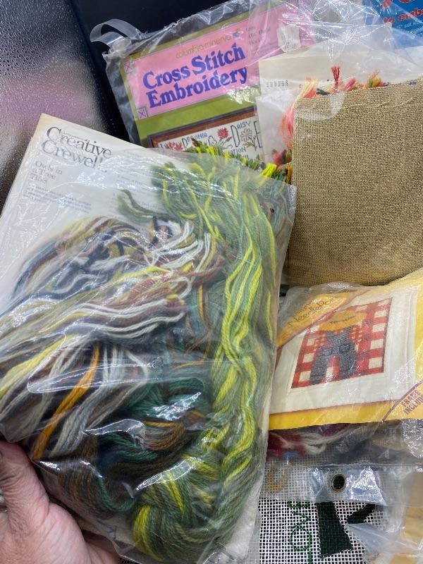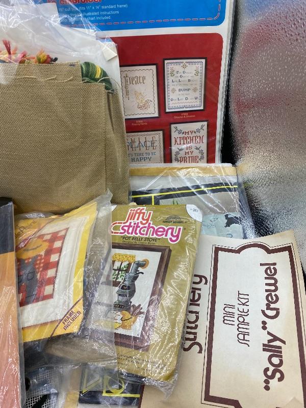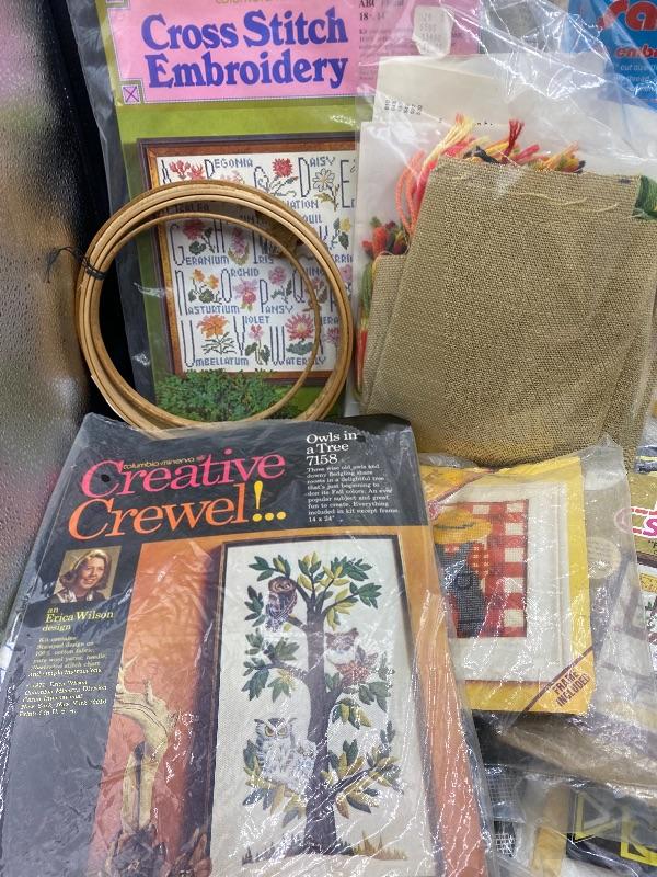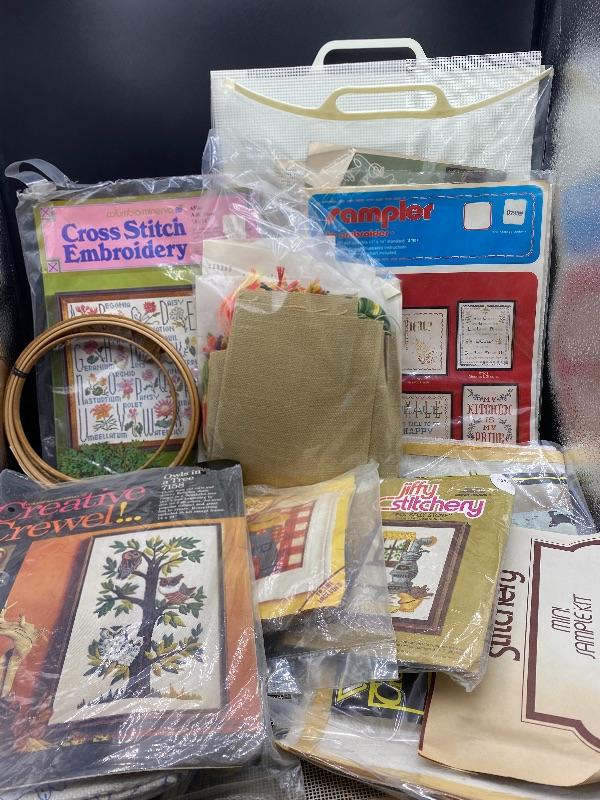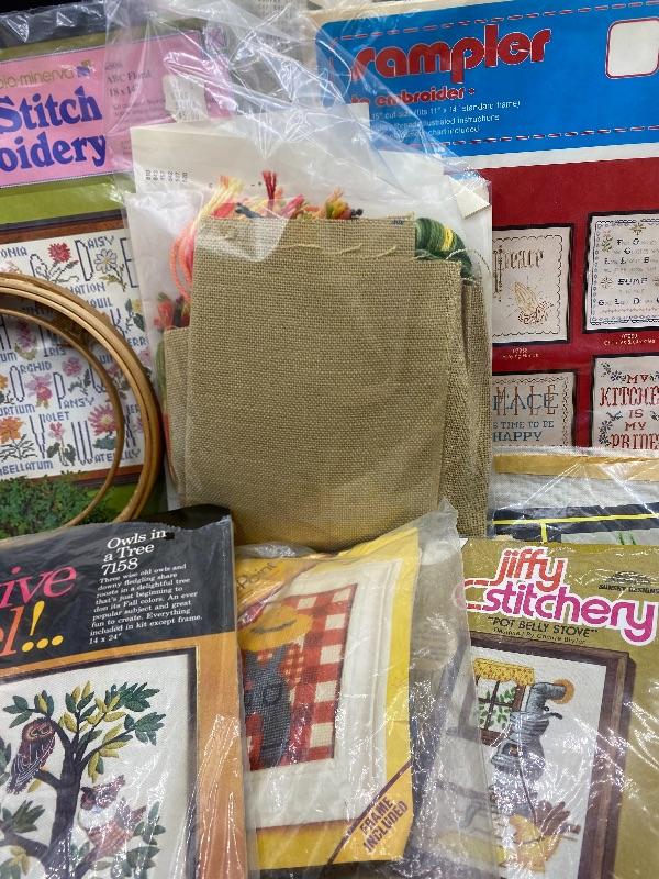 Large mixed lot of cross stitch needle craft kits. All are opened. Some of the sets look complete, some were started but never finished. All are vintage.
