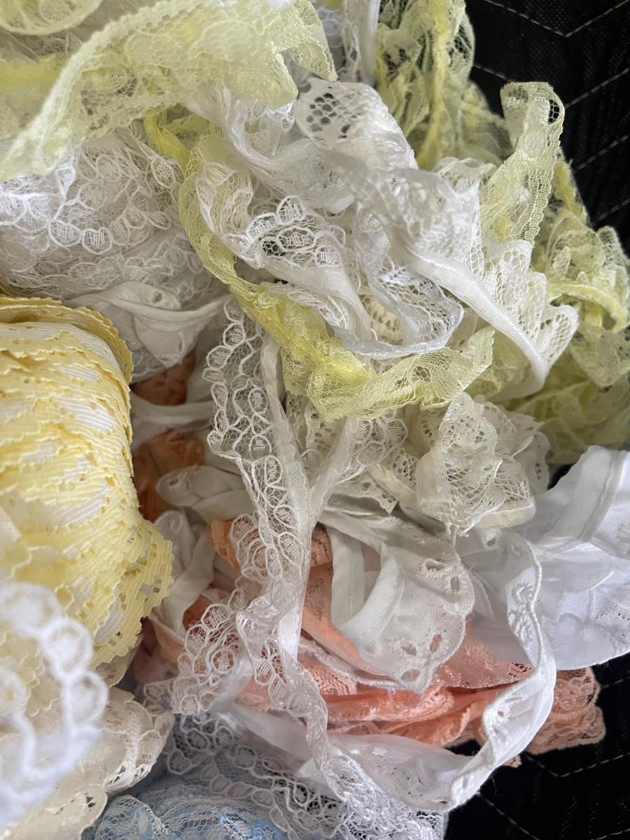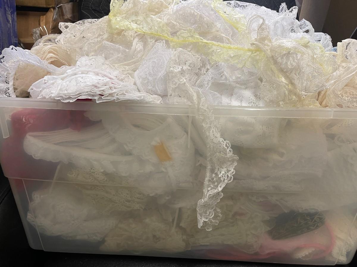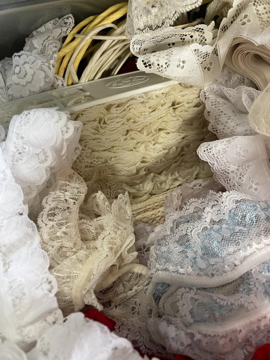 Lot of edging lace/trim. Tons of different patterns, mostly white and ivory, also some blue and red.