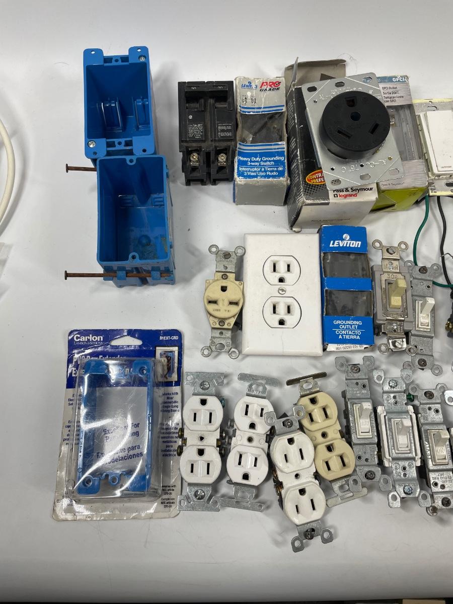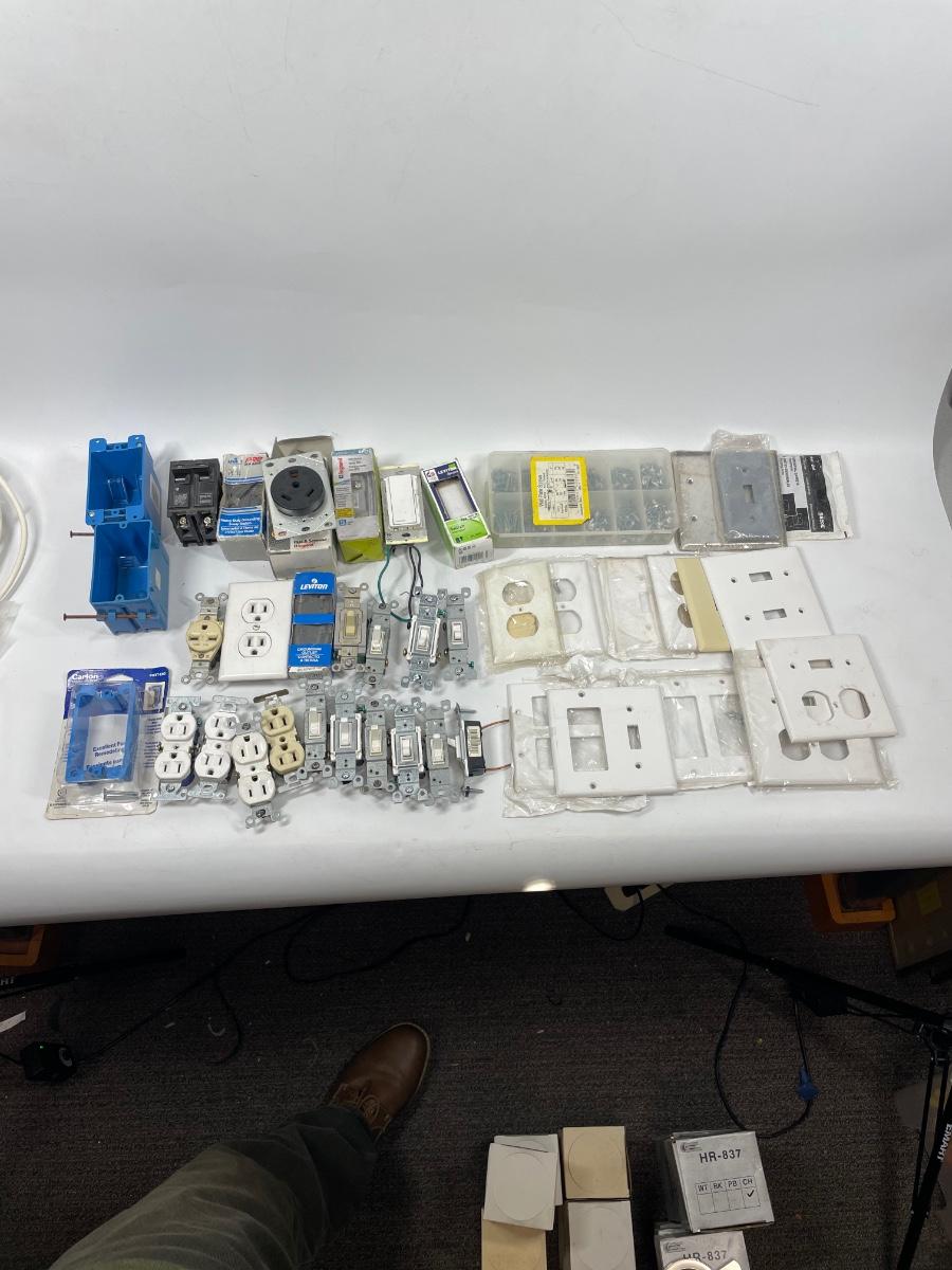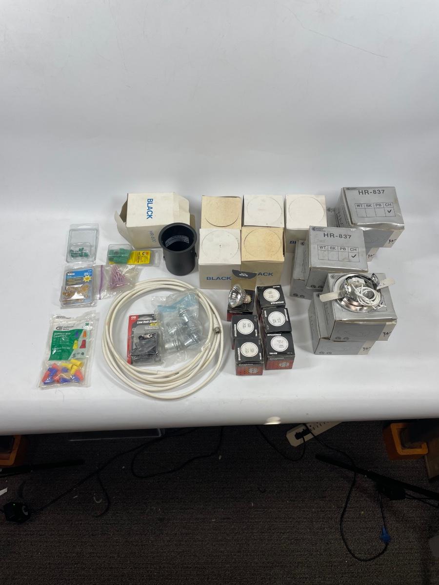 Lot includes wall plugs, switch plate covers, wall switches, wire nuts, lights, and more. See photos for what’s included.