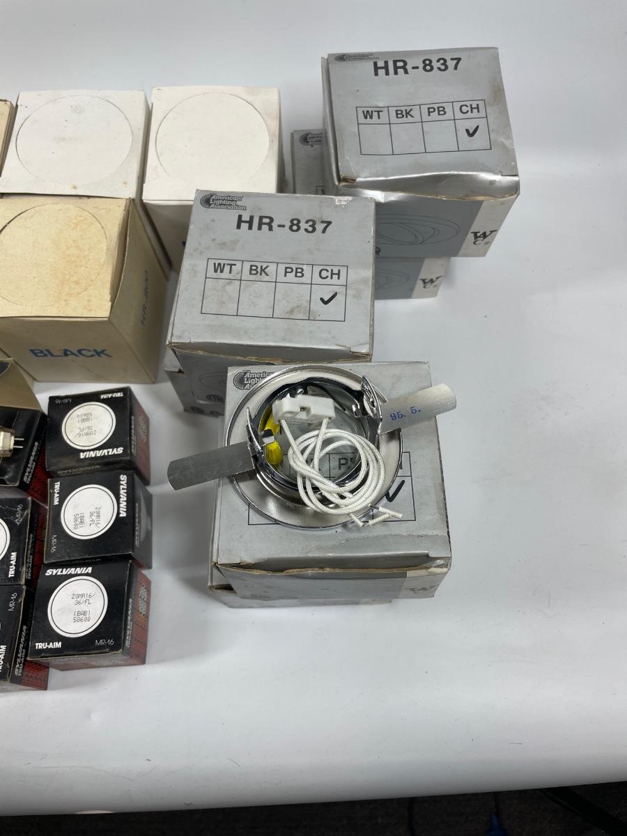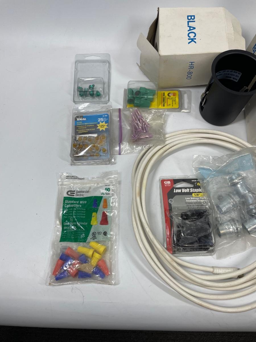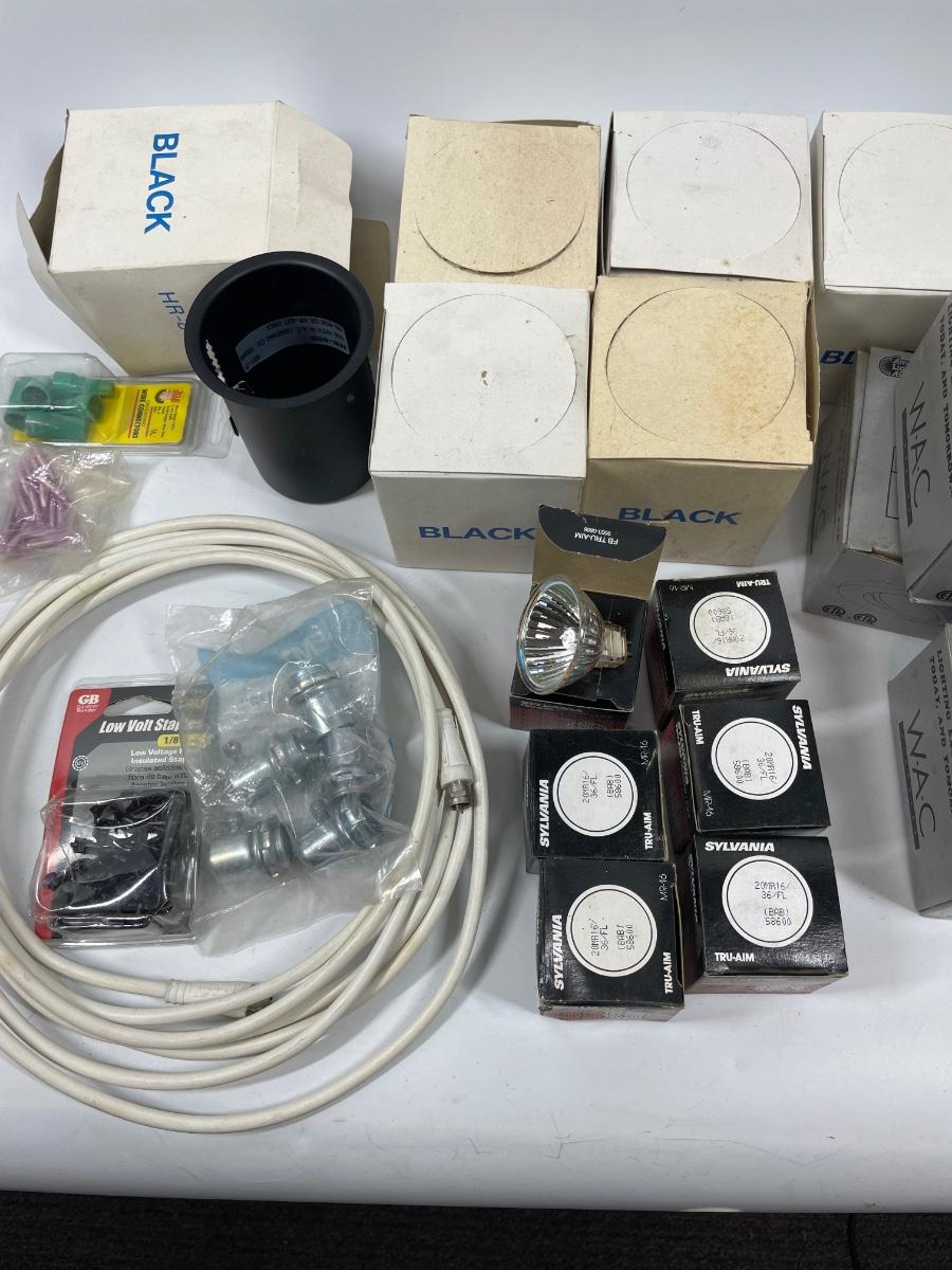 Lot includes wall plugs, switch plate covers, wall switches, wire nuts, lights, and more. See photos for what’s included.