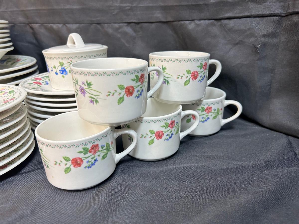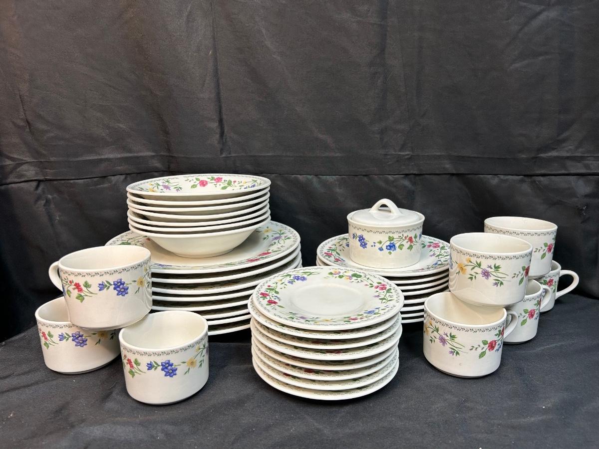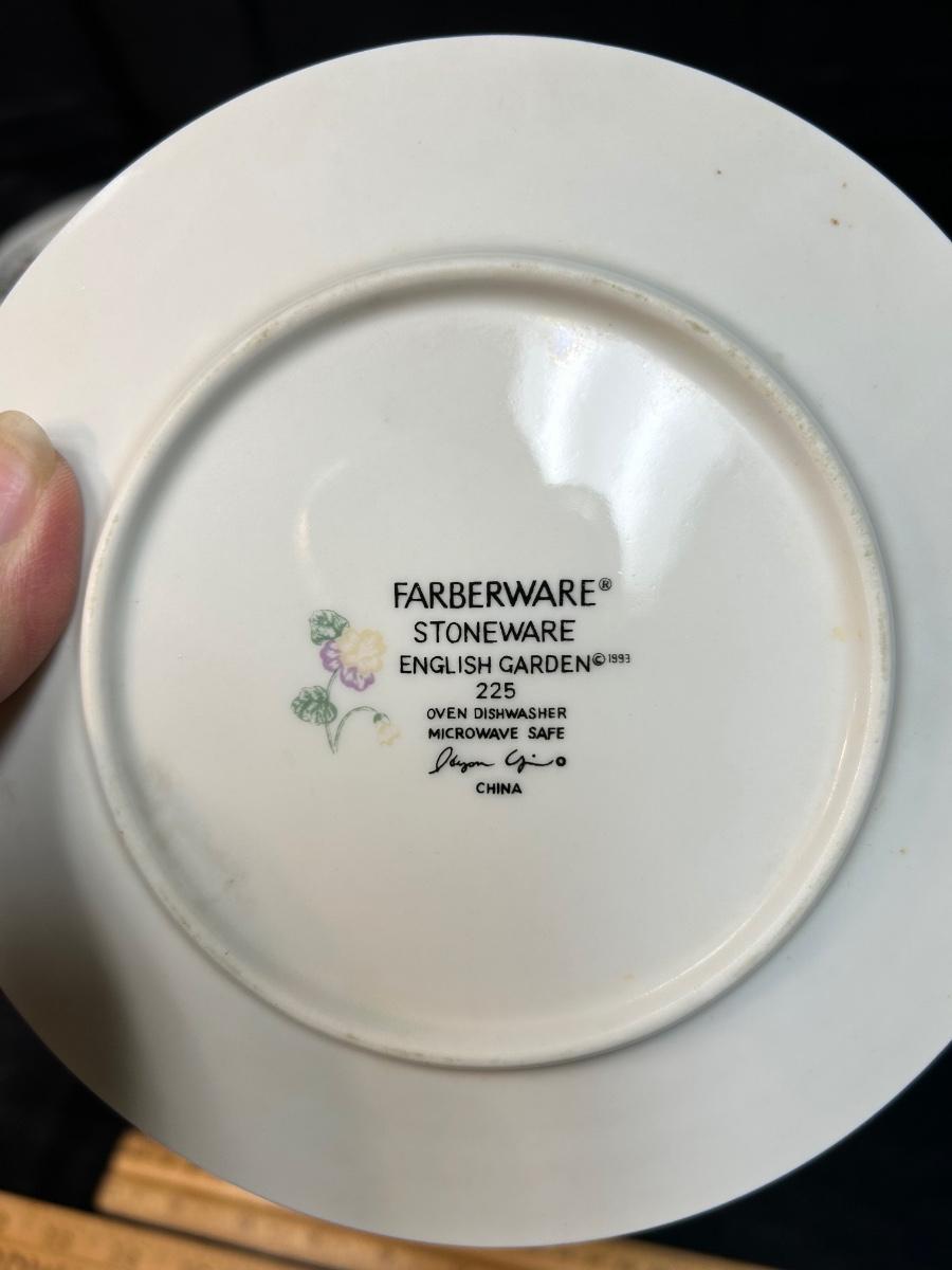 Large Lot of Farberware English Garden 225 Flower Pattern Dish Set. Service for 6 with extras. Dinner plate, salad plate, cup and saucer, and cereal bowls plus a lidded sugar bowl. In good used condition. May have a flea bite chip or two but no major chips or damage was noticed.