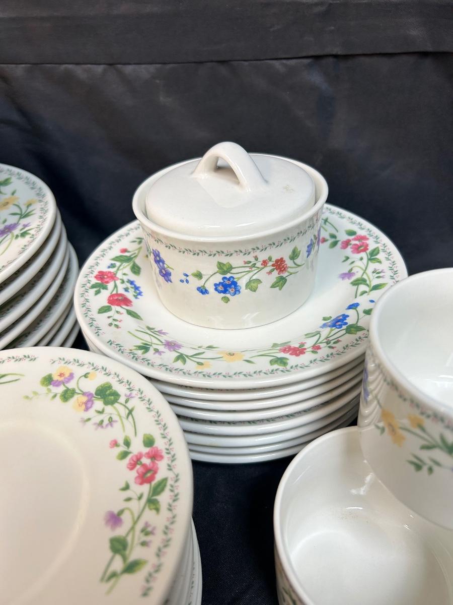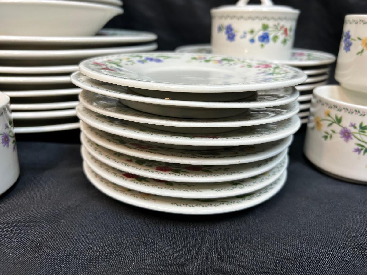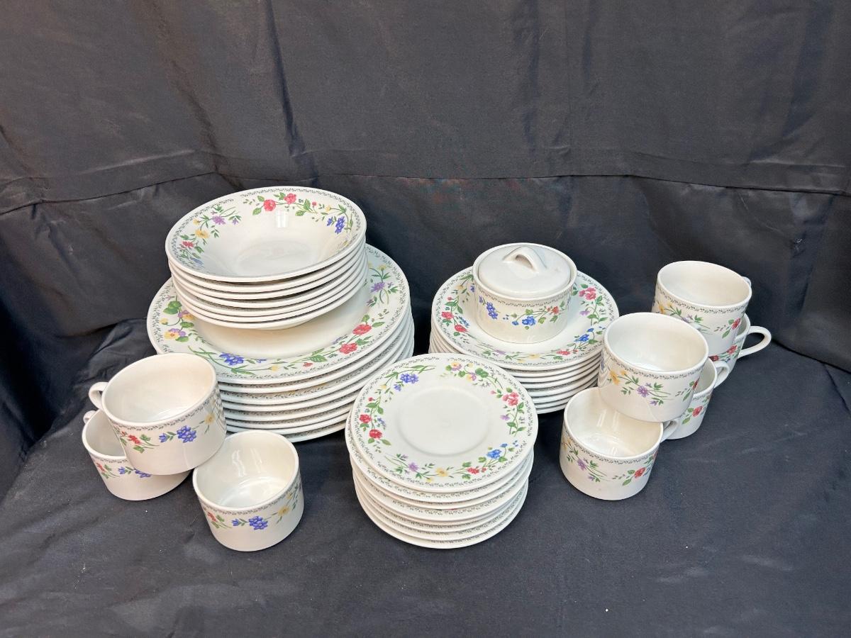 Large Lot of Farberware English Garden 225 Flower Pattern Dish Set. Service for 6 with extras. Dinner plate, salad plate, cup and saucer, and cereal bowls plus a lidded sugar bowl. In good used condition. May have a flea bite chip or two but no major chips or damage was noticed.