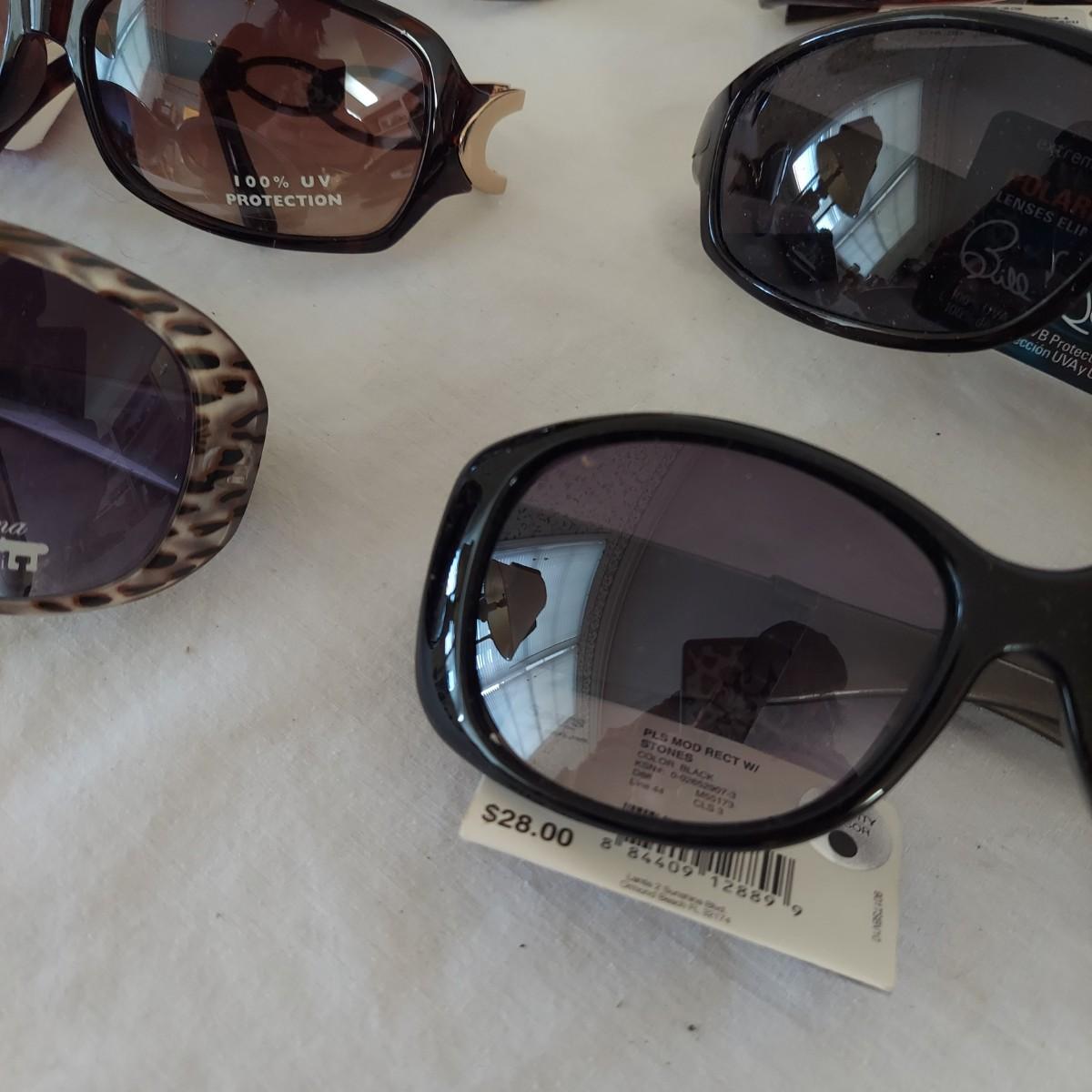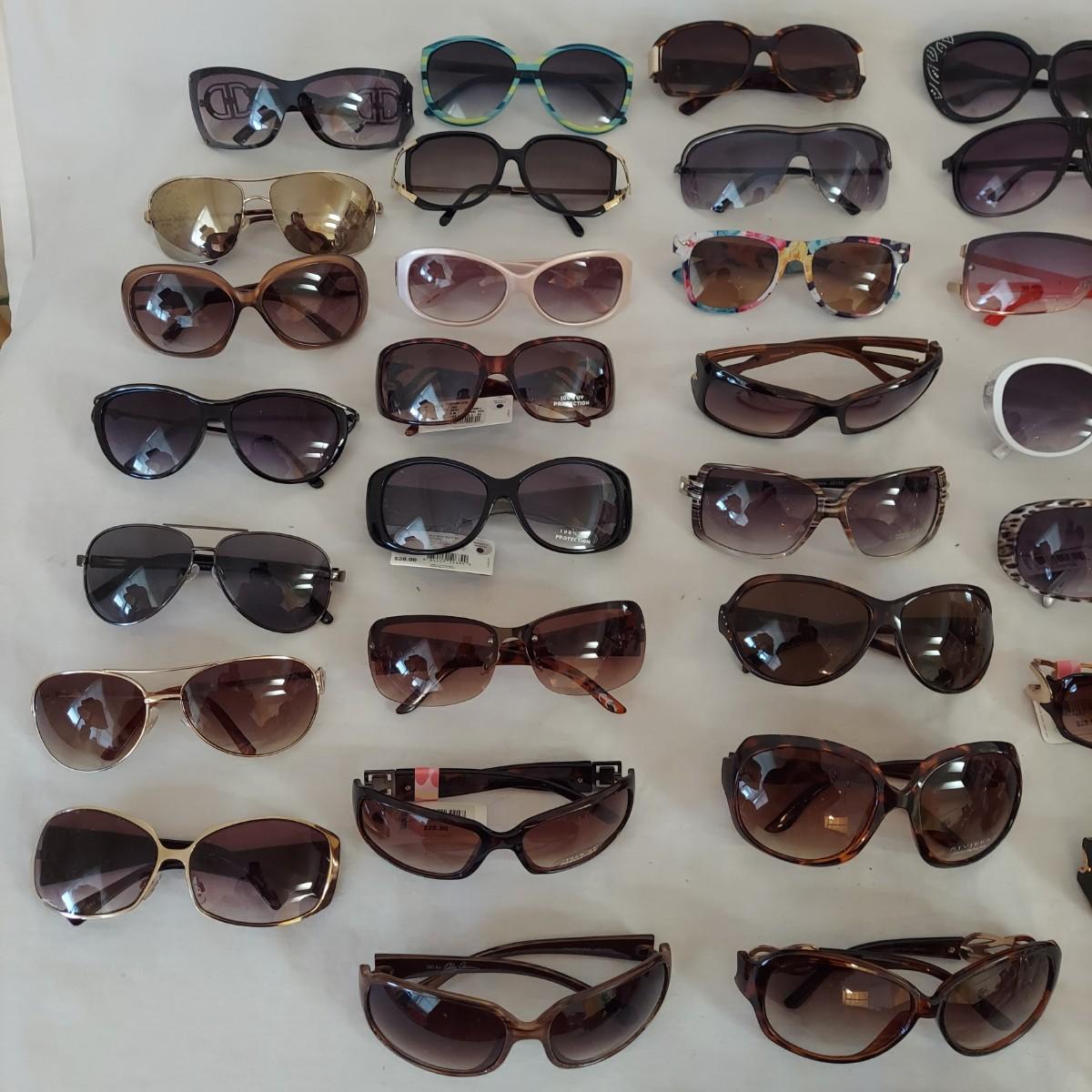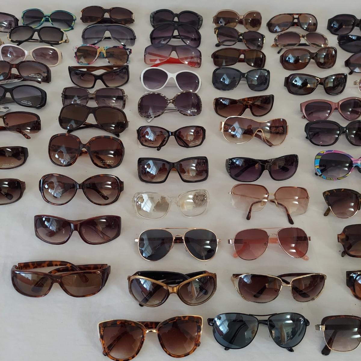 This is a large lot of plastic fashion sunglasses. Some are new with tags. Most are in used condition. Please see photos for details. Shipping available