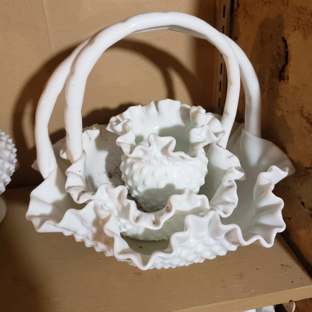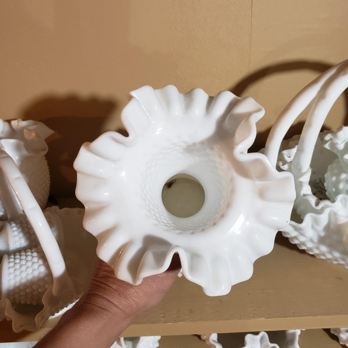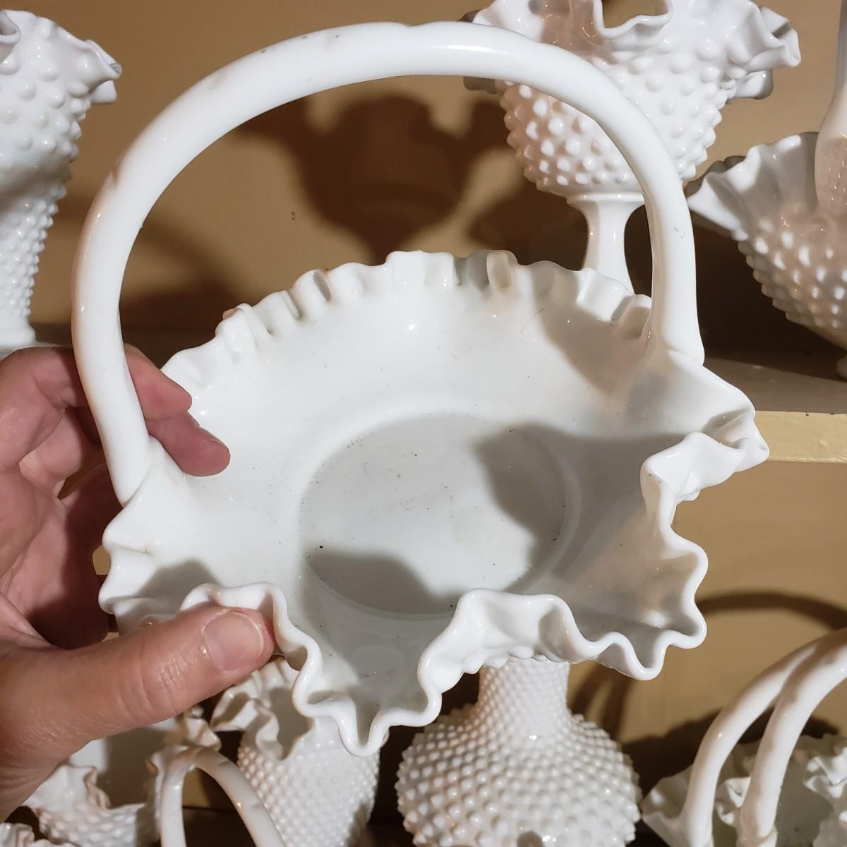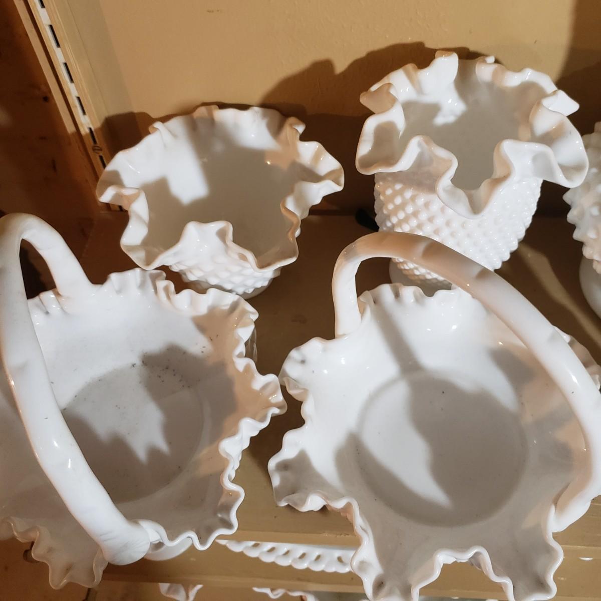 30 pieces of Fenton and other milk glass hobnail styled white glassware. All pieces appear to be blemish free. The largest basket measures 10" x 10"H. The tallest vase measures 6" x 12"H.