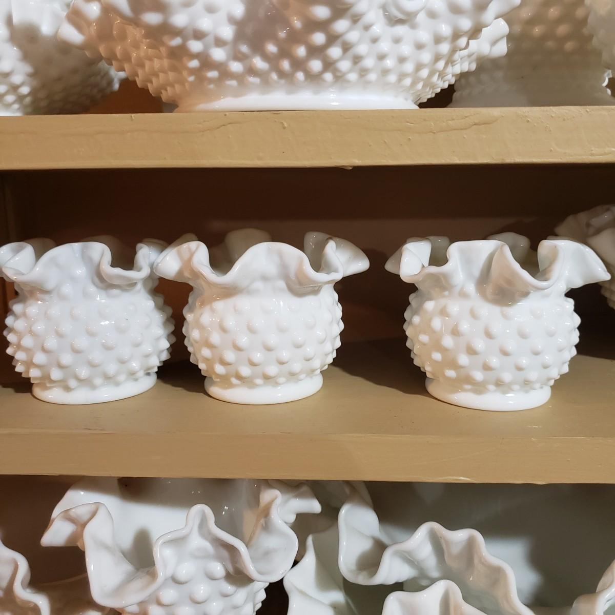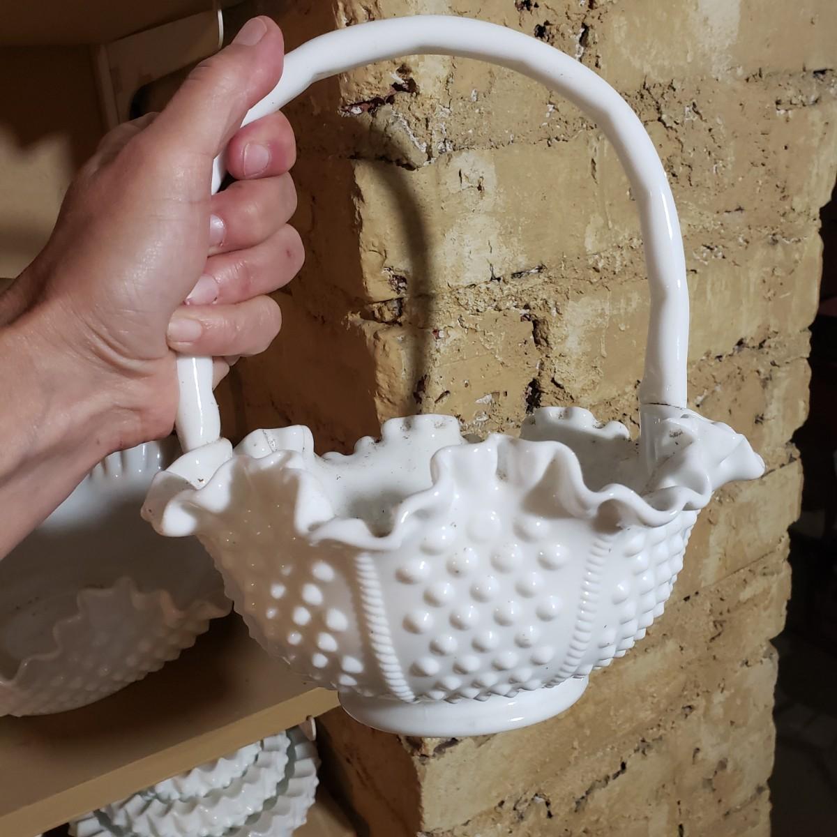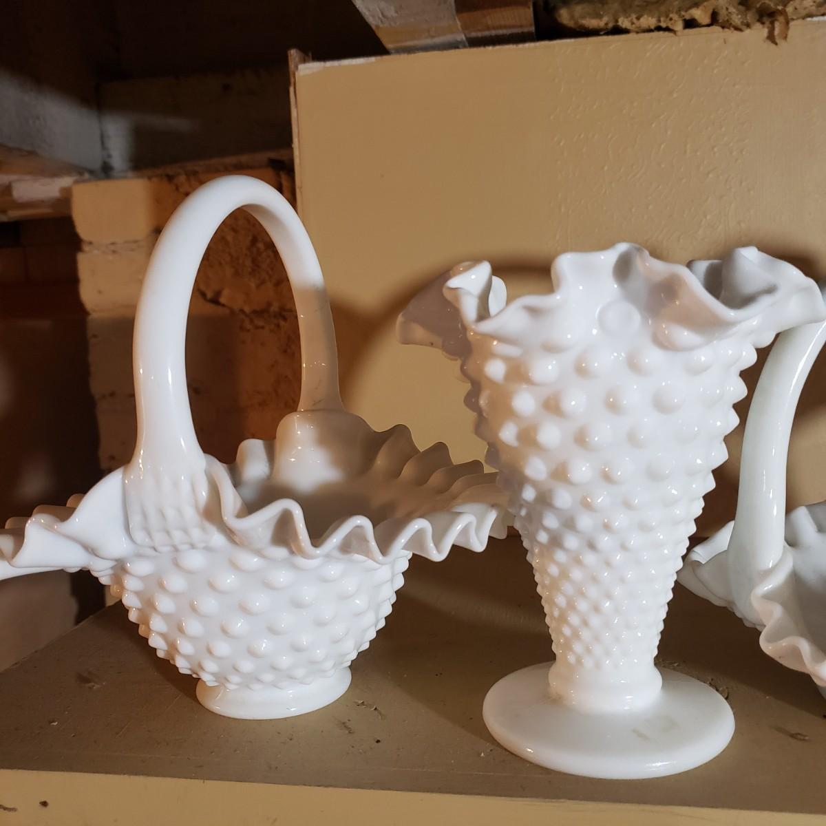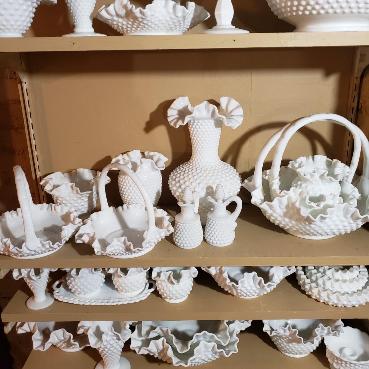 30 pieces of Fenton and other milk glass hobnail styled white glassware. All pieces appear to be blemish free. The largest basket measures 10" x 10"H. The tallest vase measures 6" x 12"H.