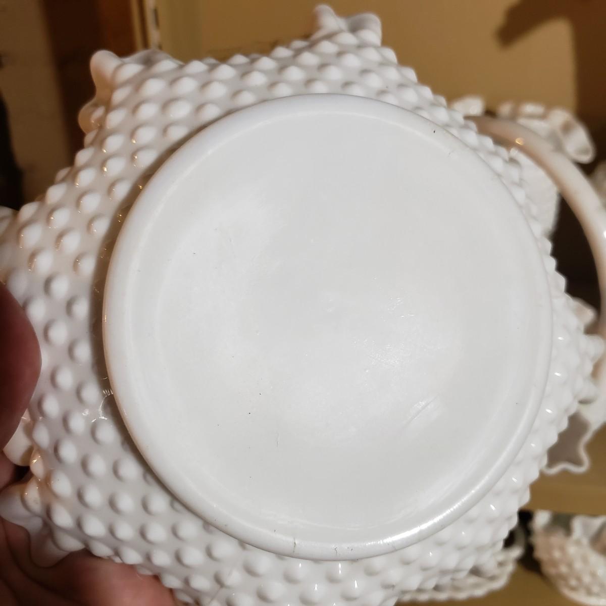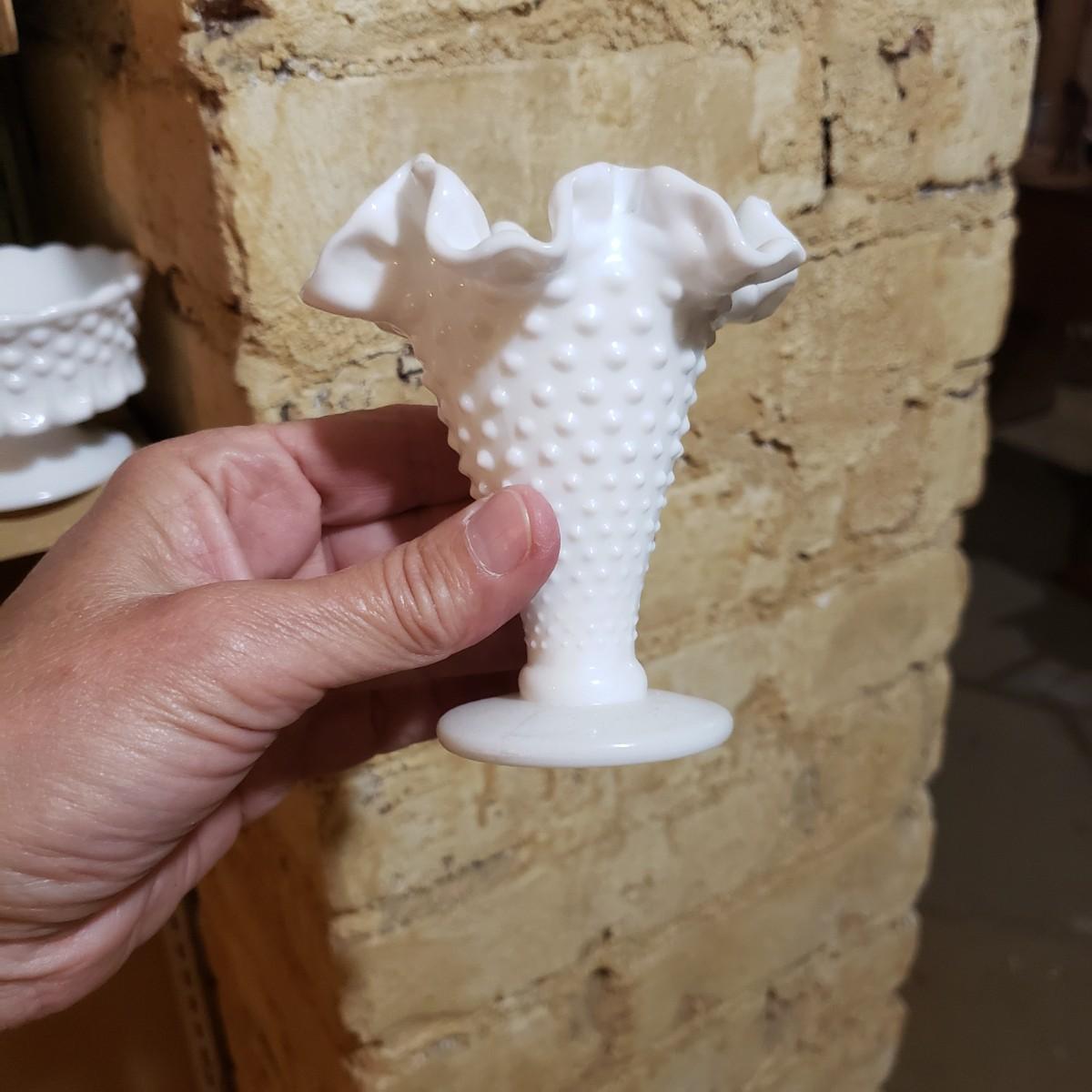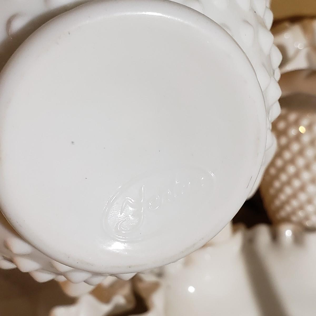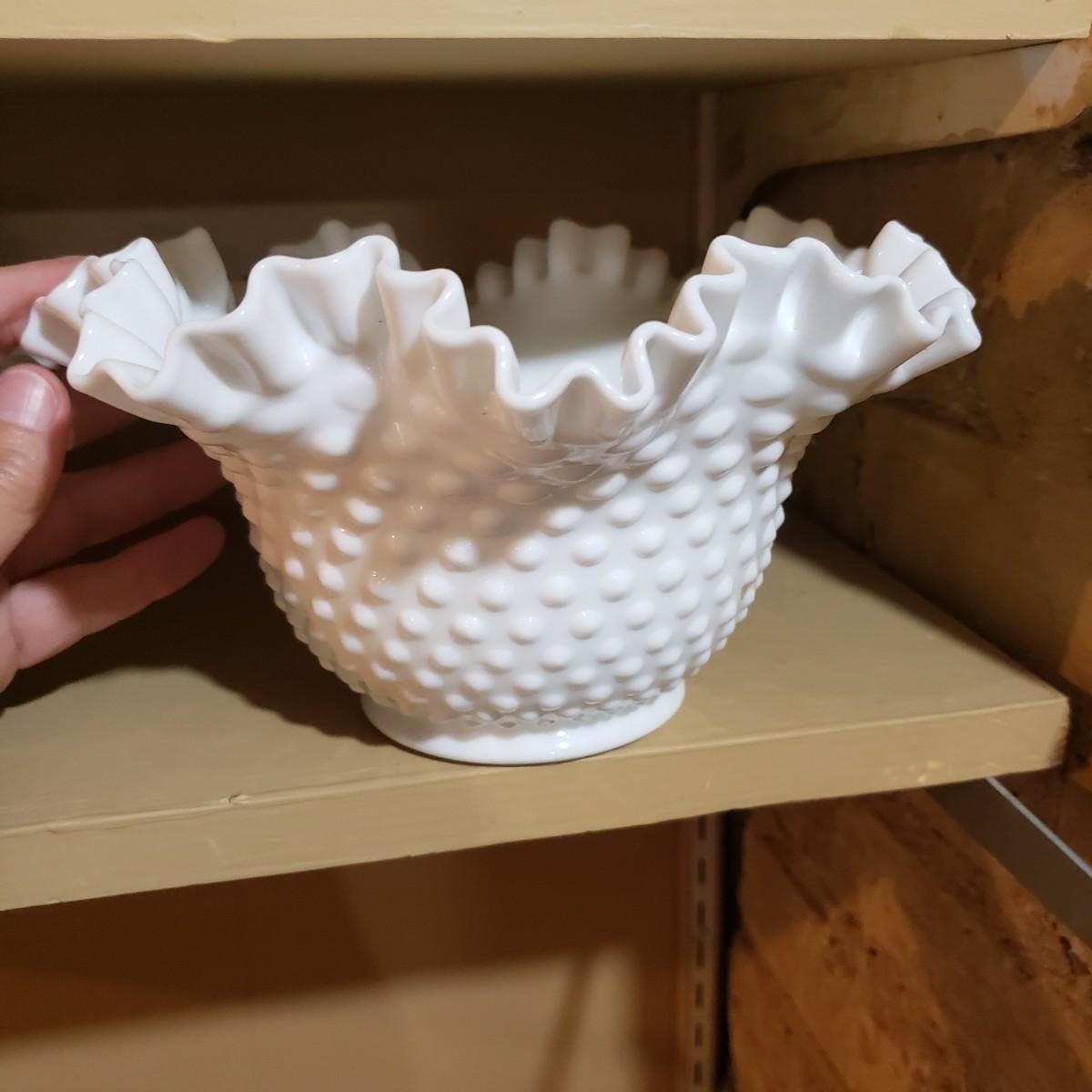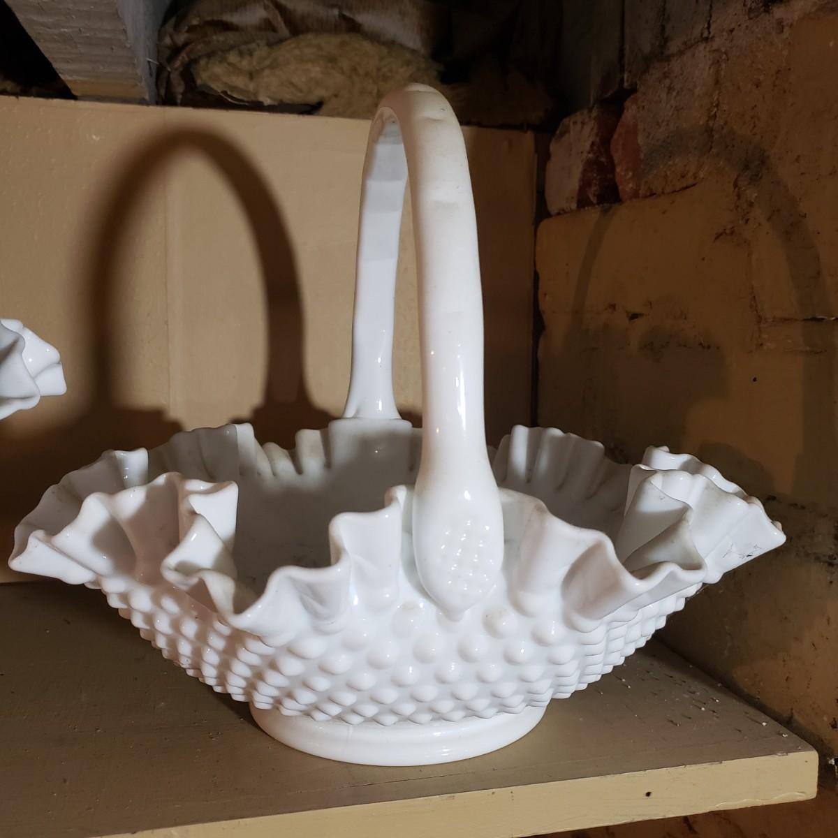 30 pieces of Fenton and other milk glass hobnail styled white glassware. All pieces appear to be blemish free. The largest basket measures 10" x 10"H. The tallest vase measures 6" x 12"H.