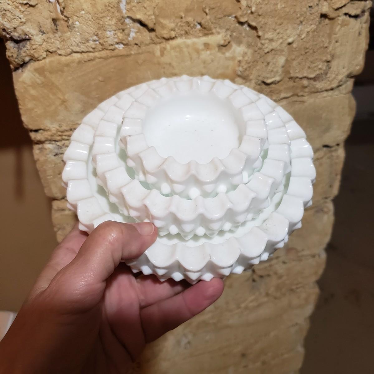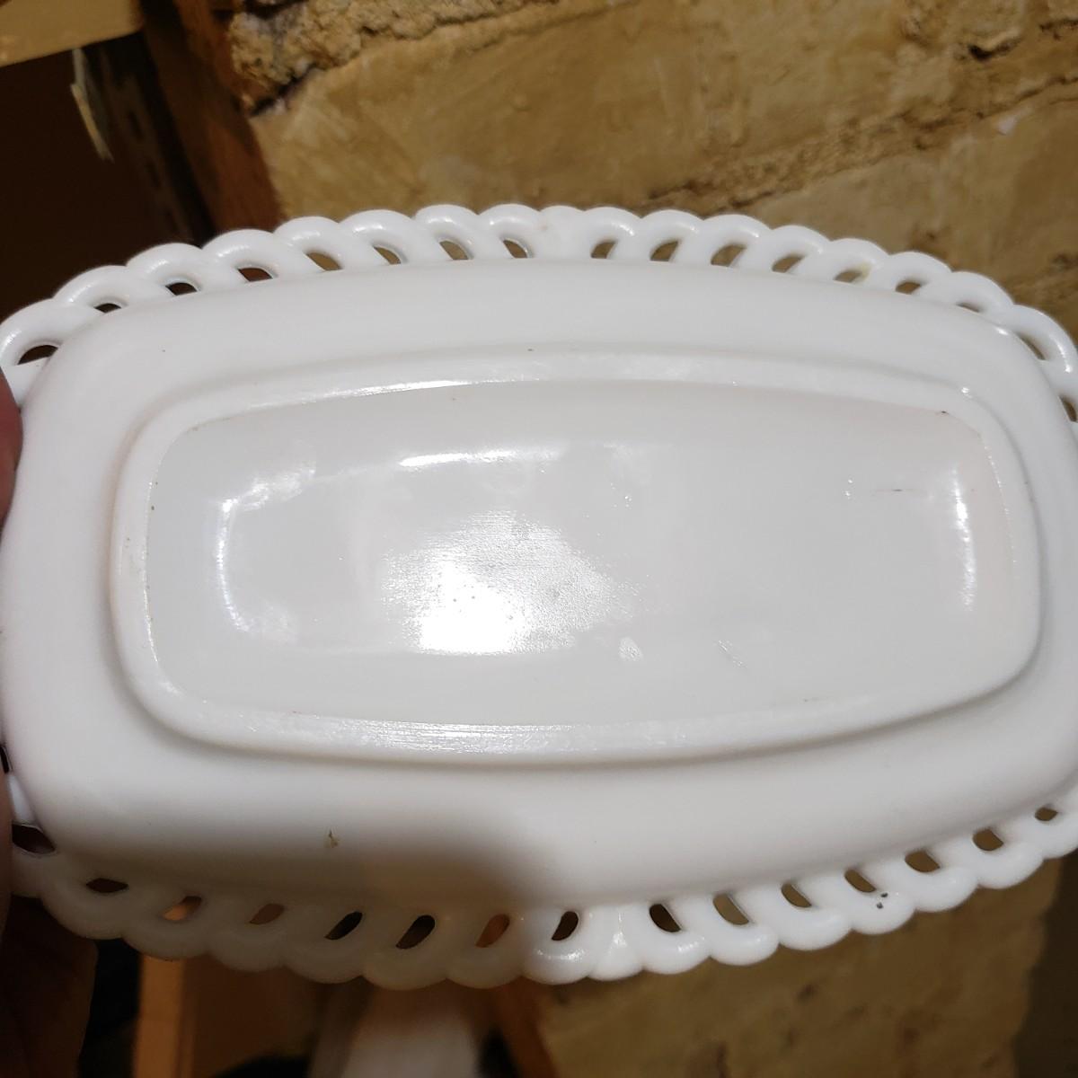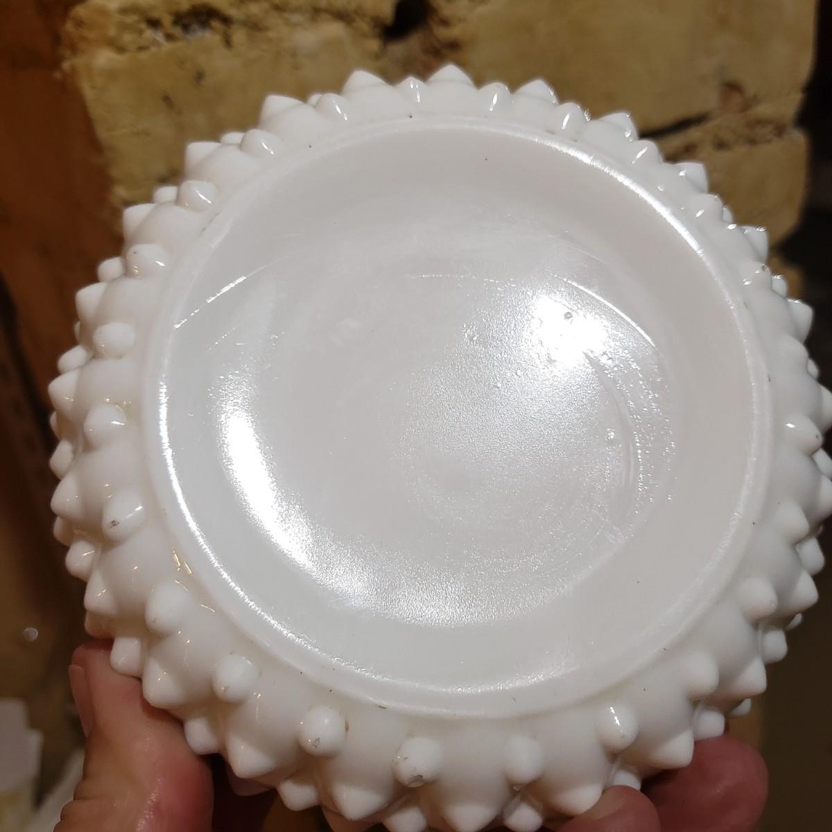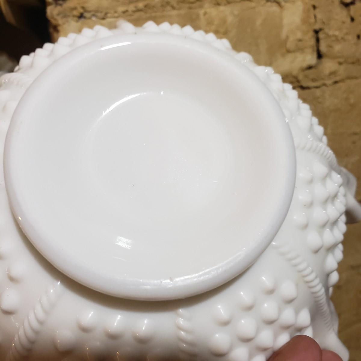 30 pieces of Fenton and other milk glass hobnail styled white glassware. All pieces appear to be blemish free. The largest basket measures 10" x 10"H. The tallest vase measures 6" x 12"H.