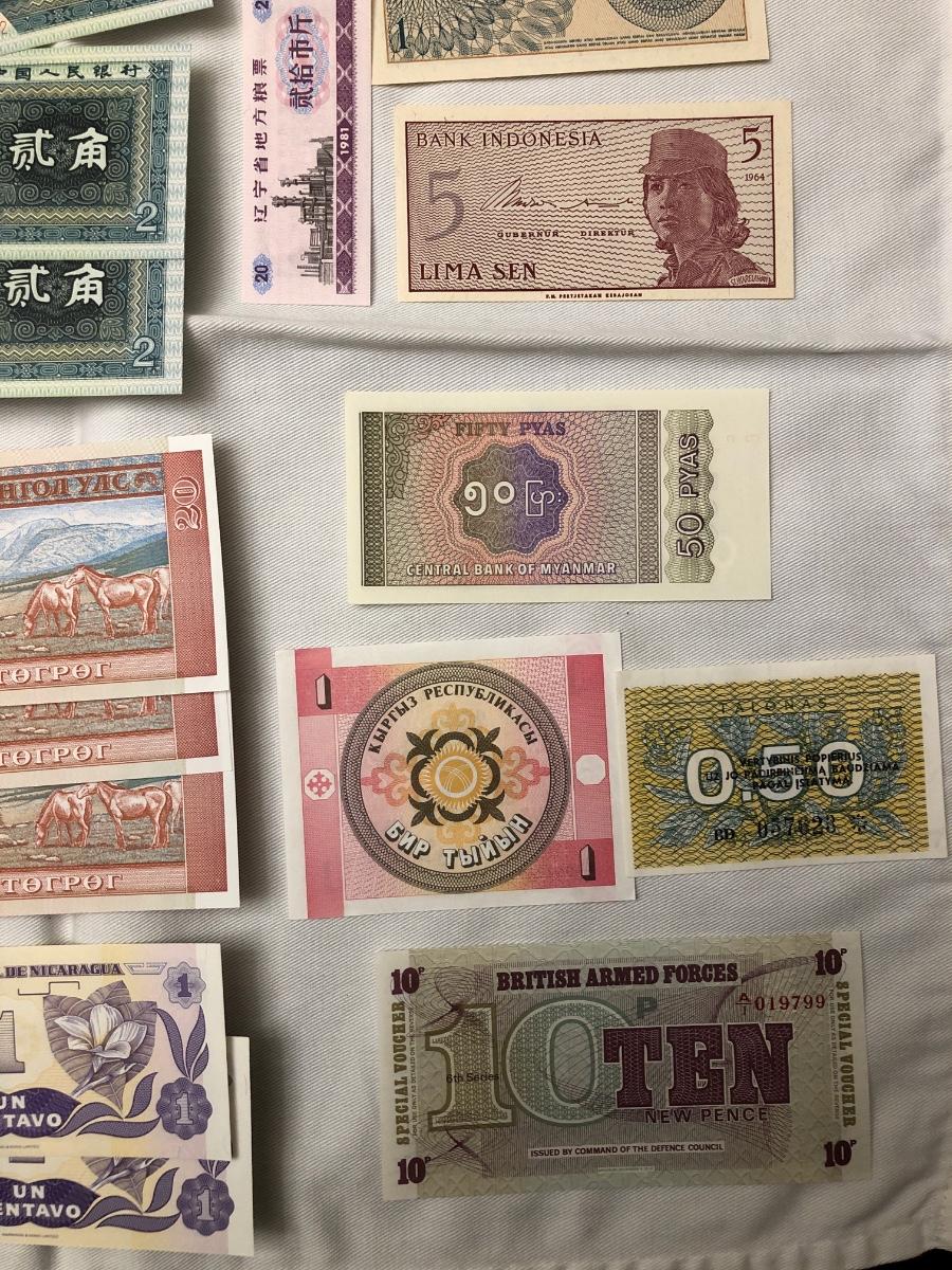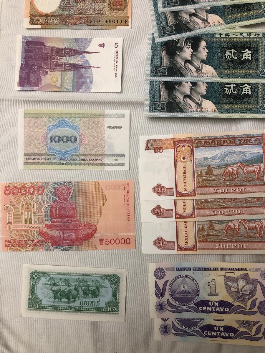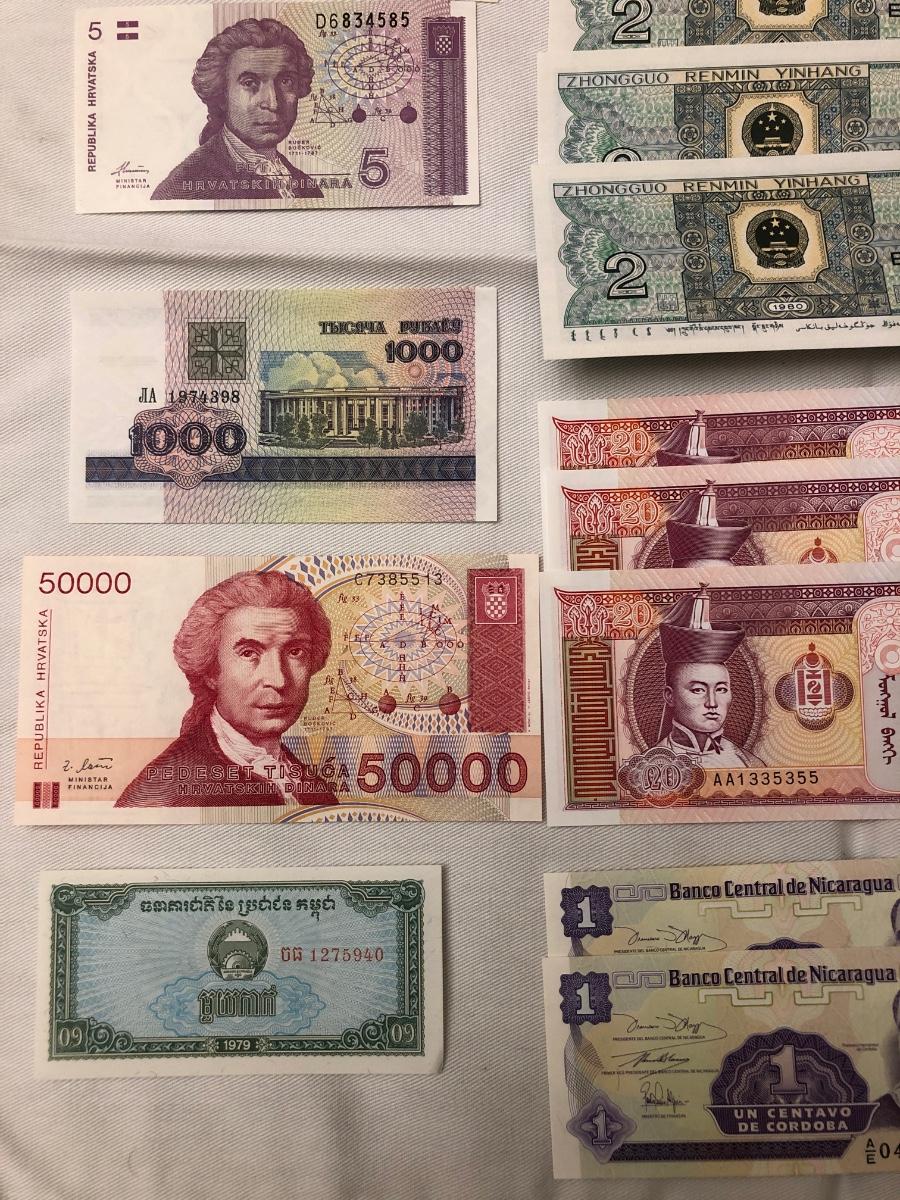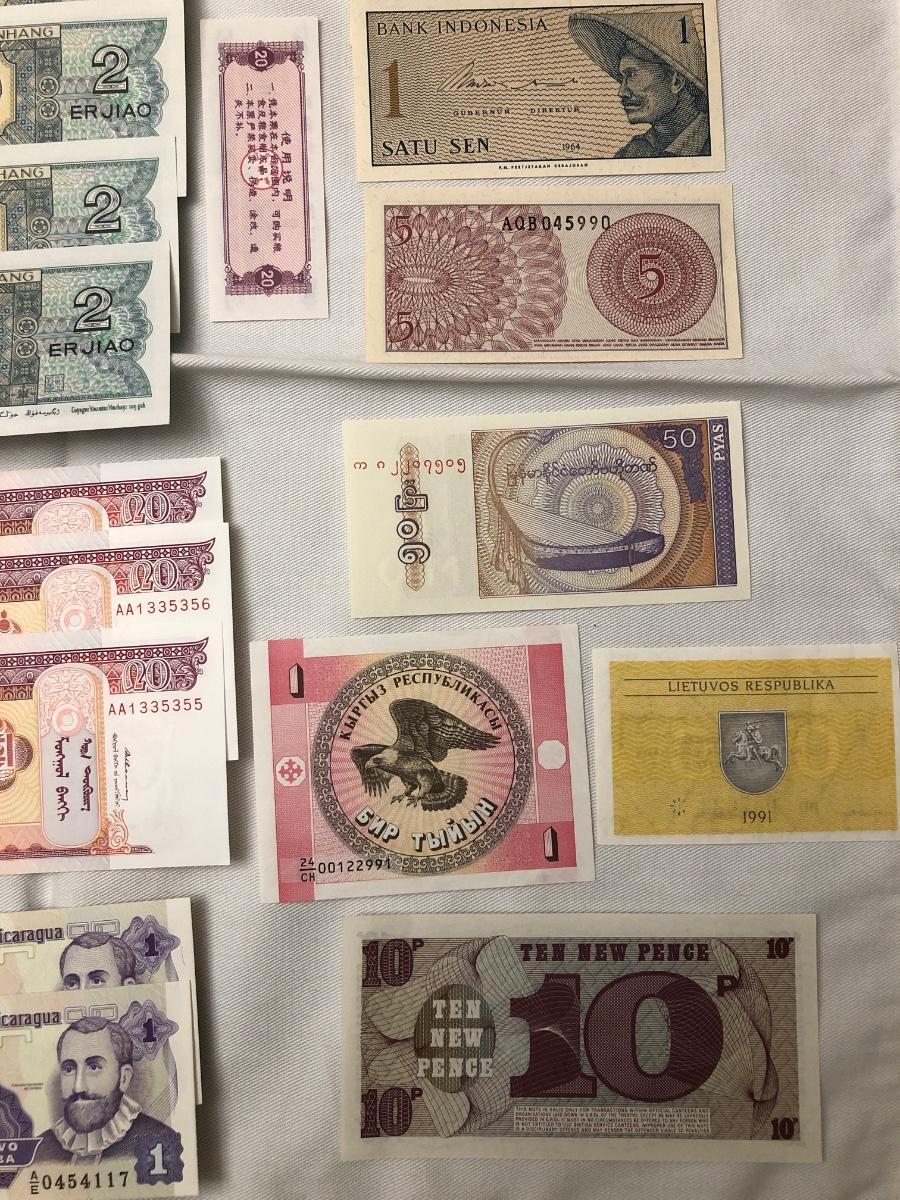 26 individual bills from various countries around the world. All are crisp and uncirculated, minus one. Some with consecutive serial numbers. Please see pictures for condition and details.