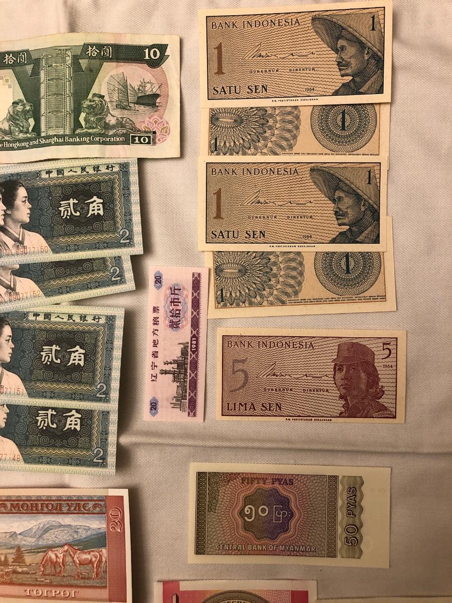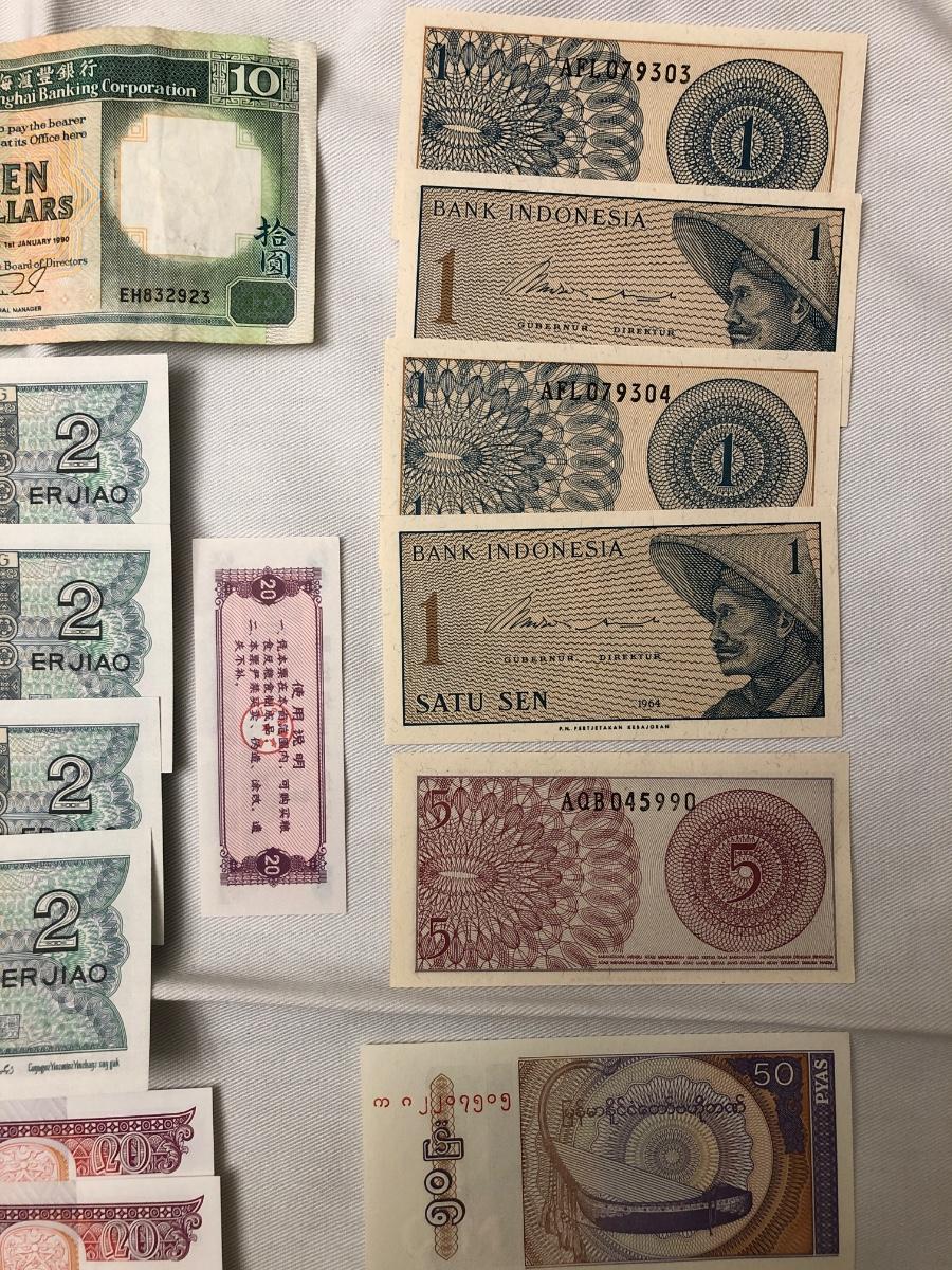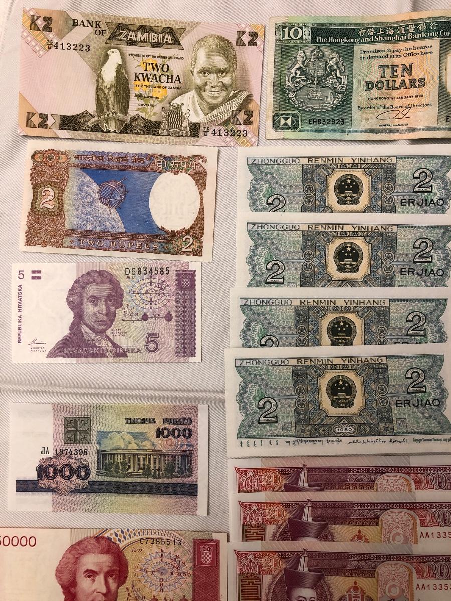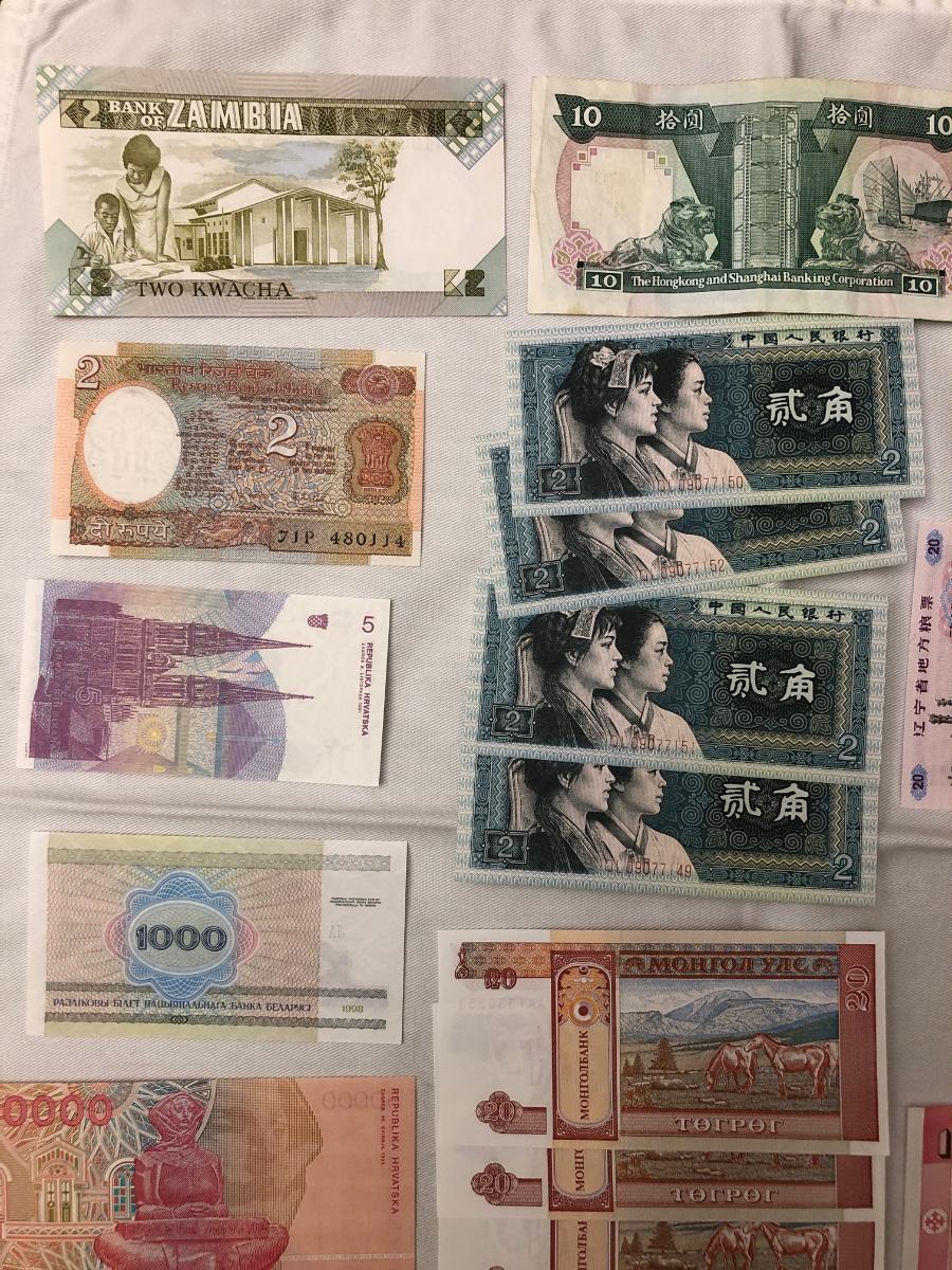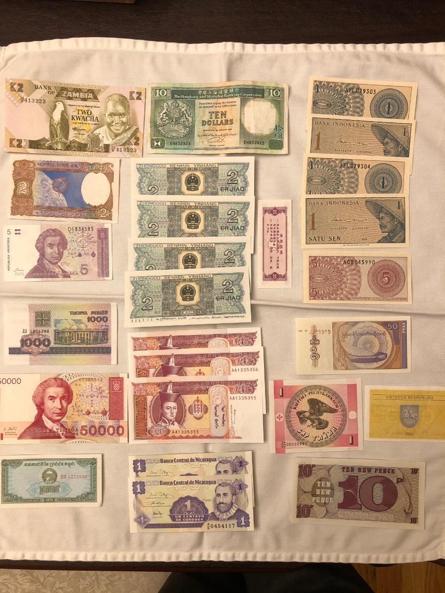 26 individual bills from various countries around the world. All are crisp and uncirculated, minus one. Some with consecutive serial numbers. Please see pictures for condition and details.
