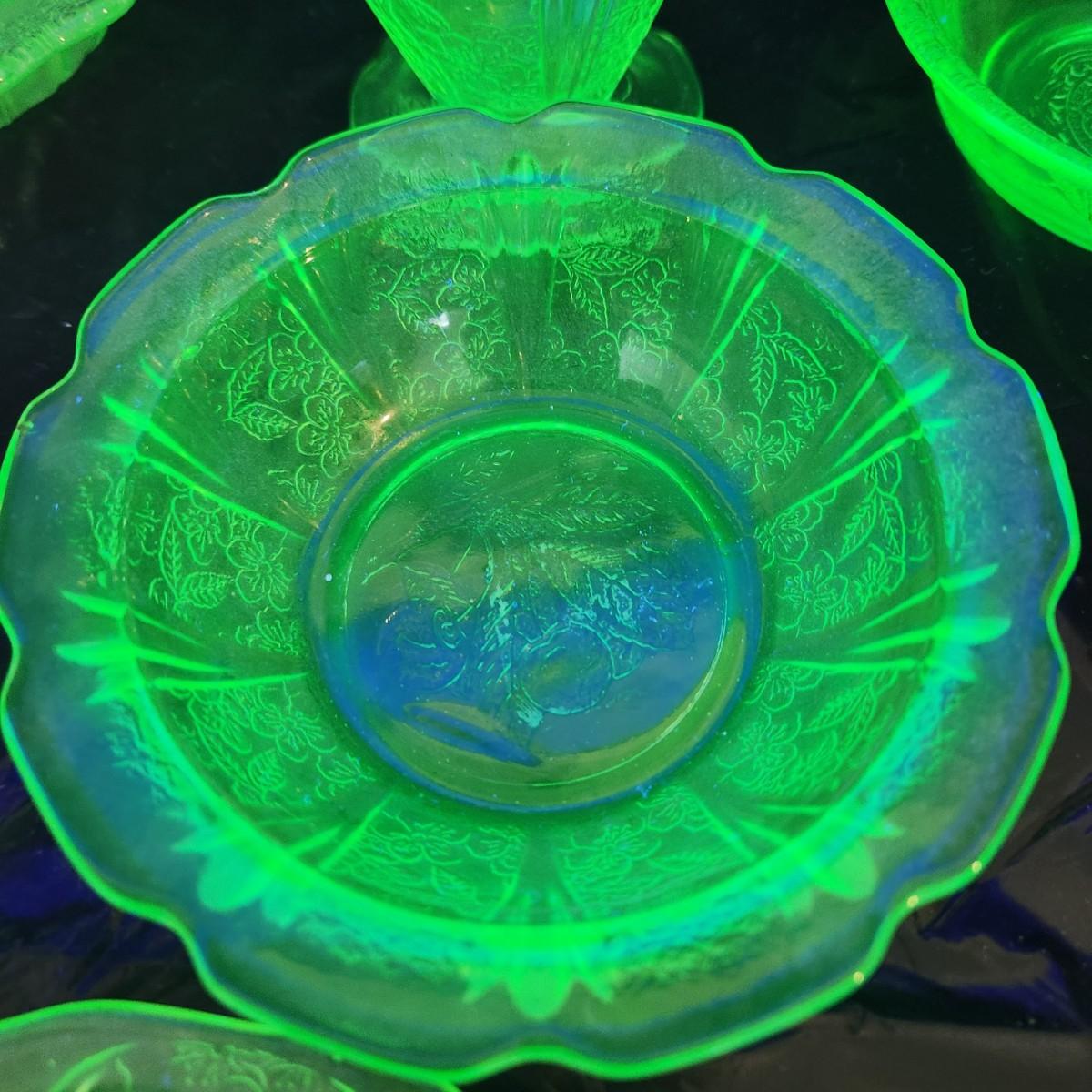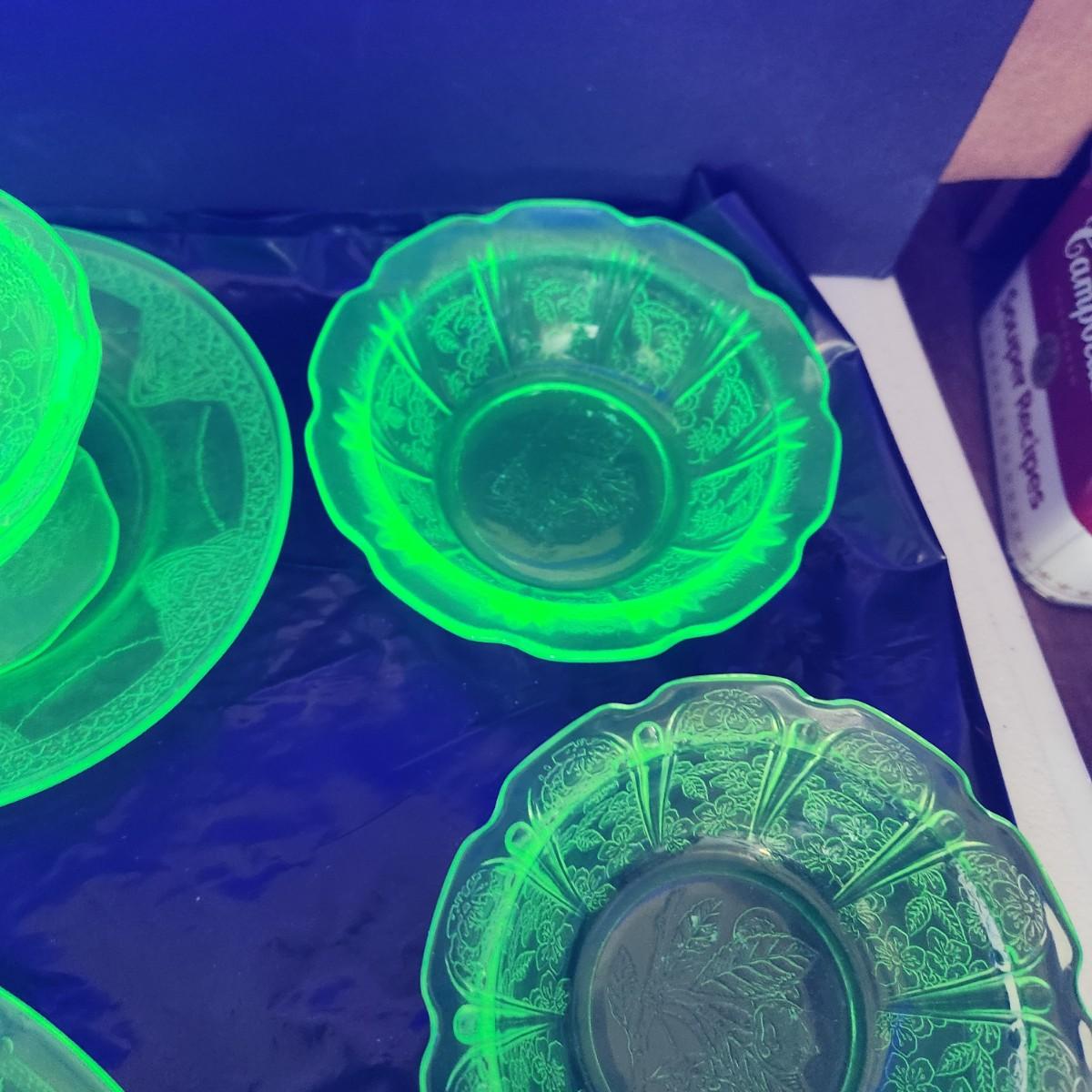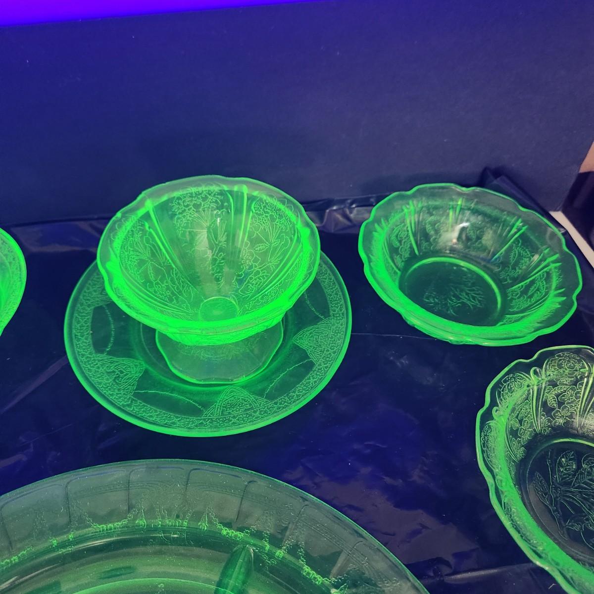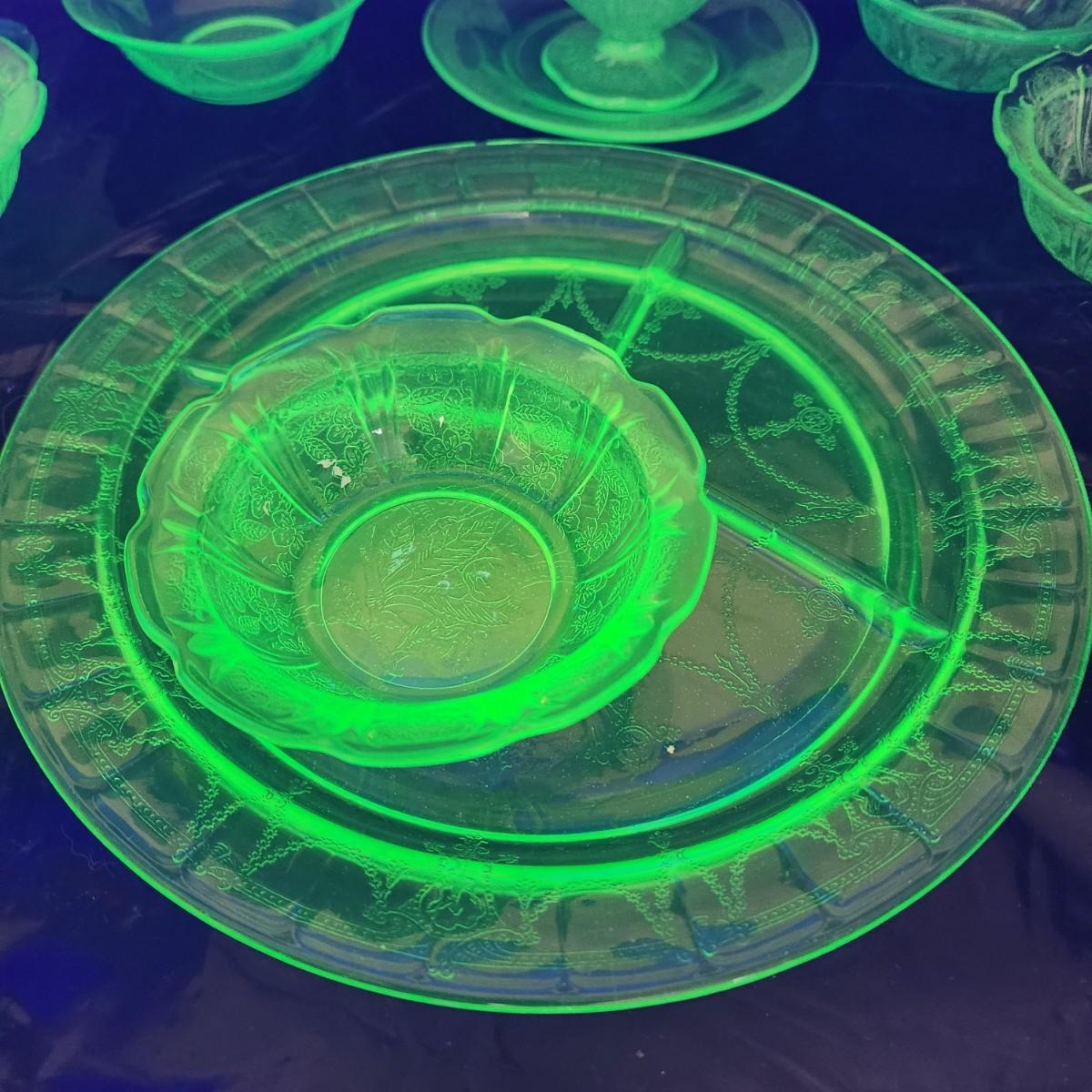 Large Lot of Green Glass Vaseline Uranium Glass Plates, Glass, Bowls
