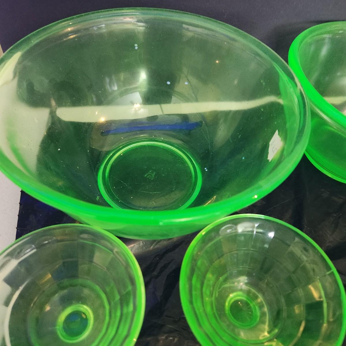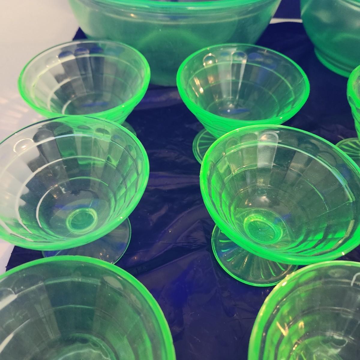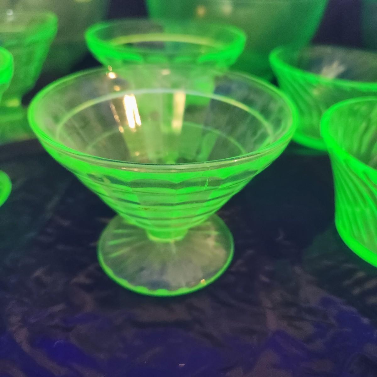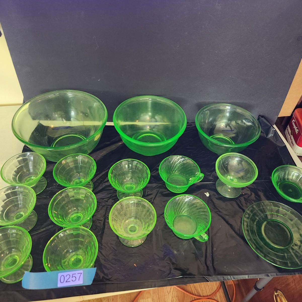 Large Lot of Green Glass Vaseline Uranium Glass Bowls , Cups, Footed Cups