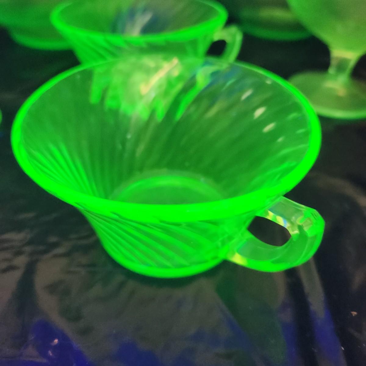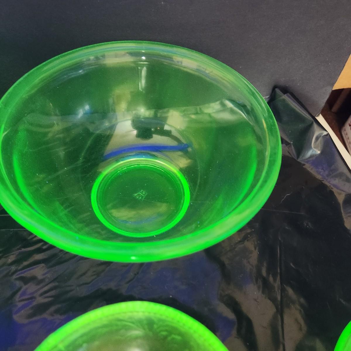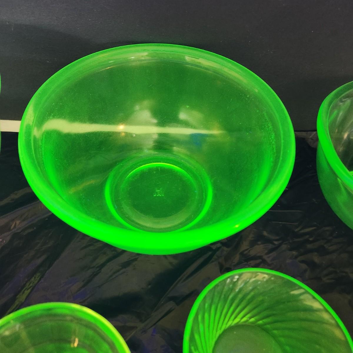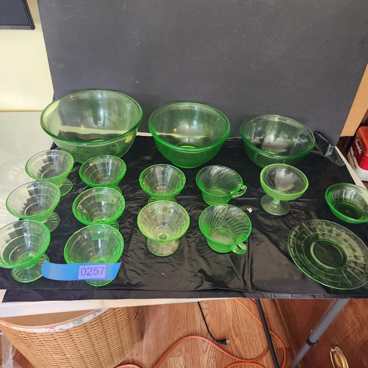 Large Lot of Green Glass Vaseline Uranium Glass Bowls , Cups, Footed Cups