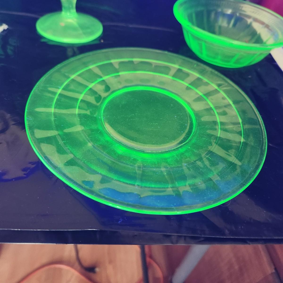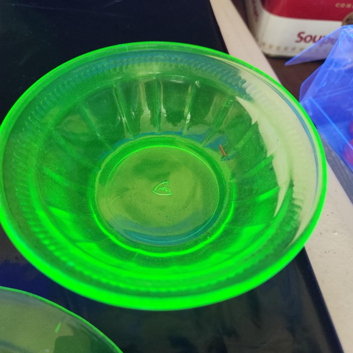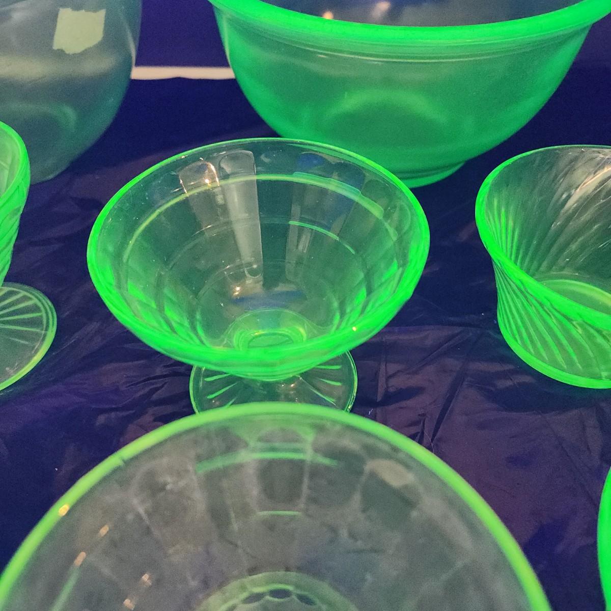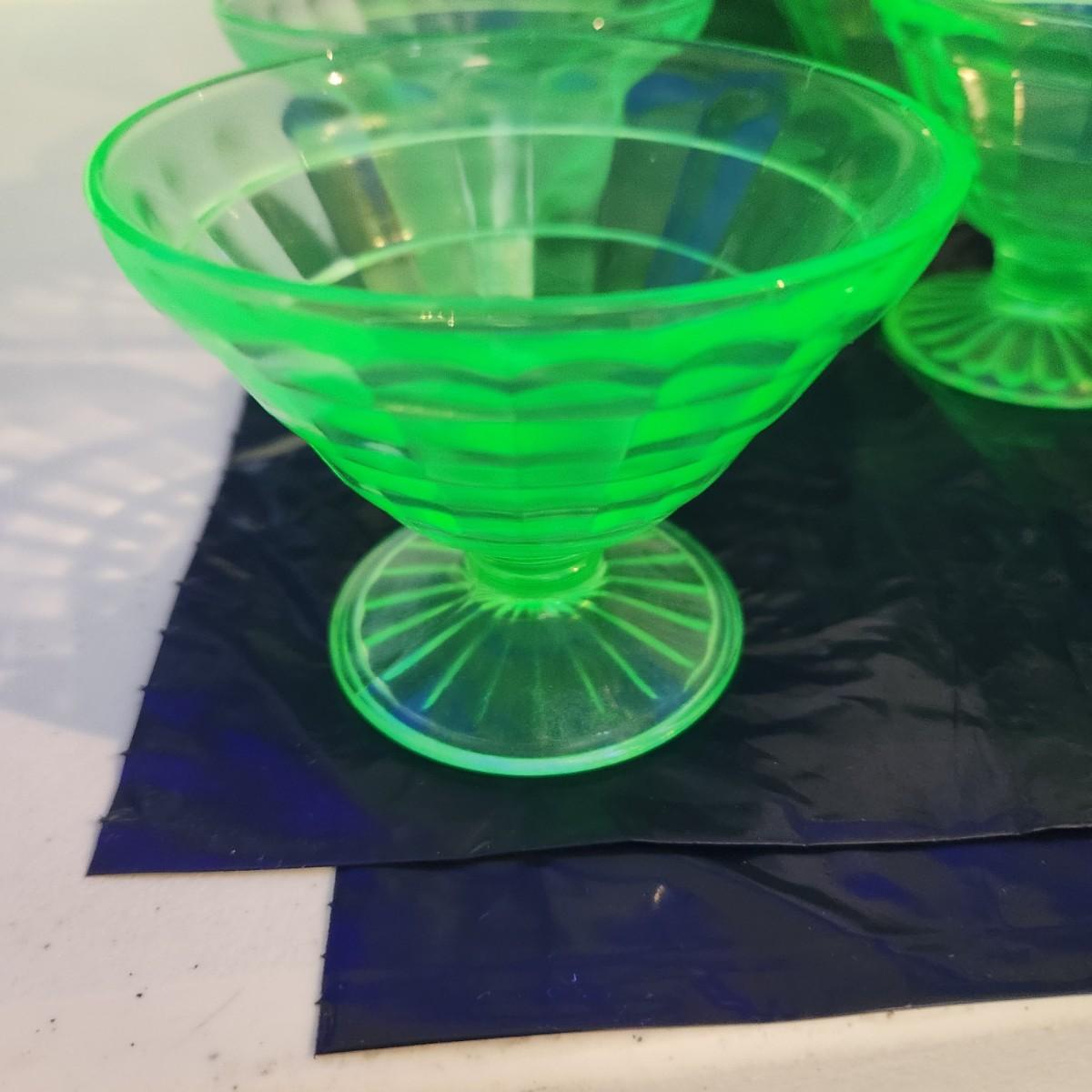 Large Lot of Green Glass Vaseline Uranium Glass Bowls , Cups, Footed Cups