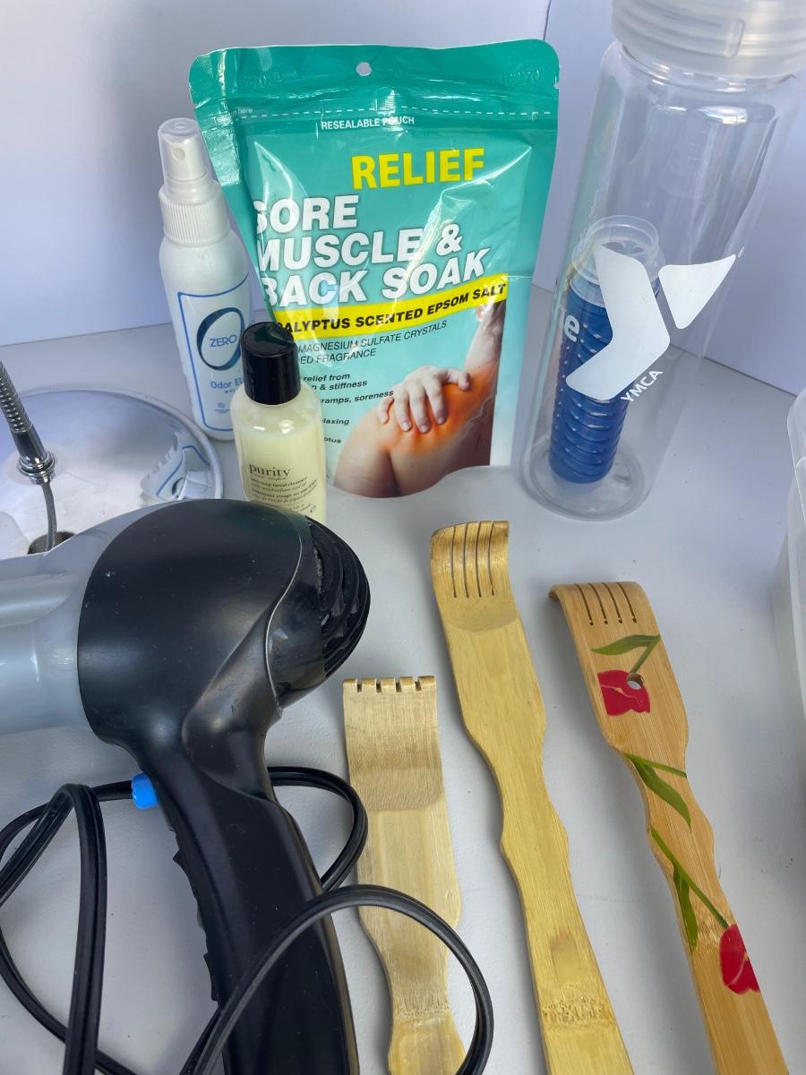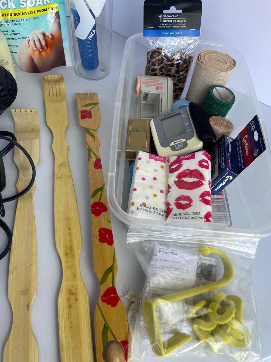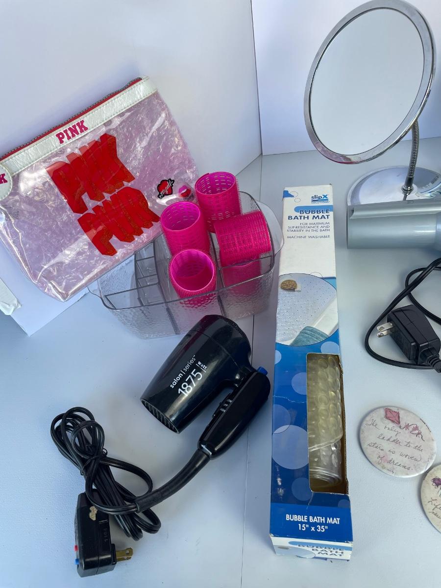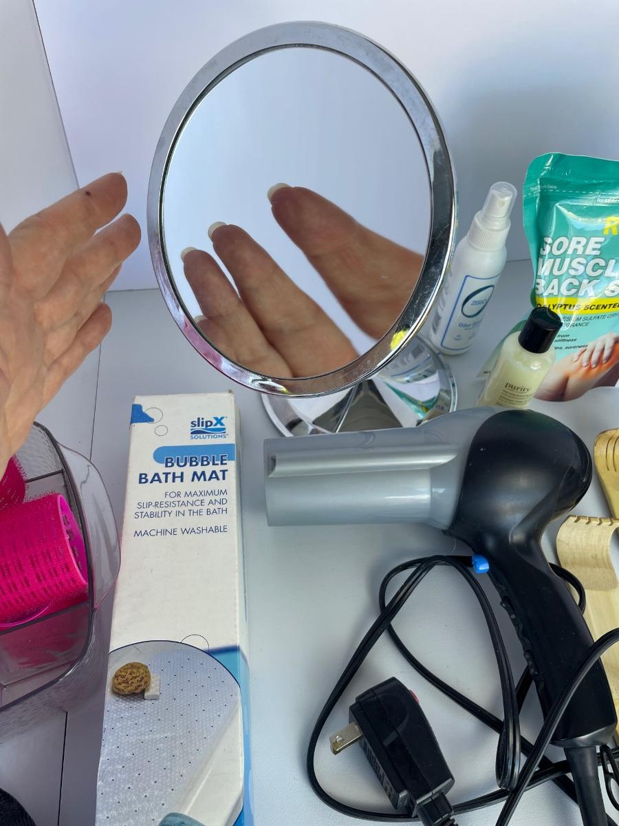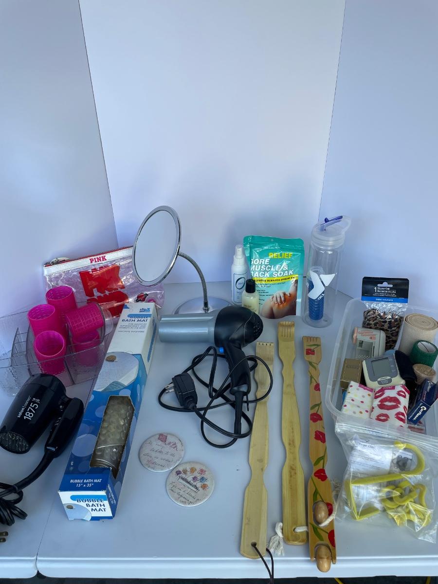 Magnifying mirror, wrist blood pressure cuff, back scratchers, new bath mat, hair dryers etc