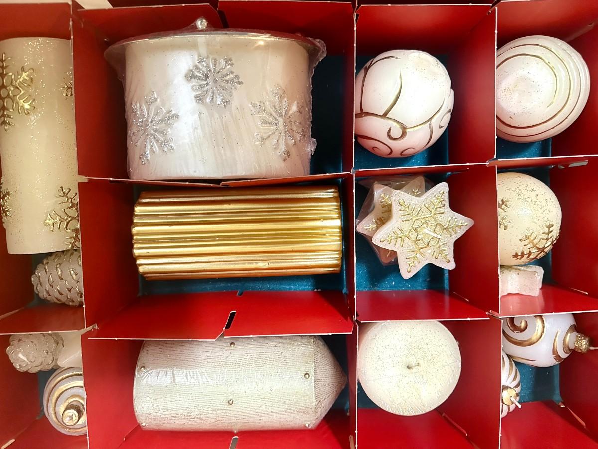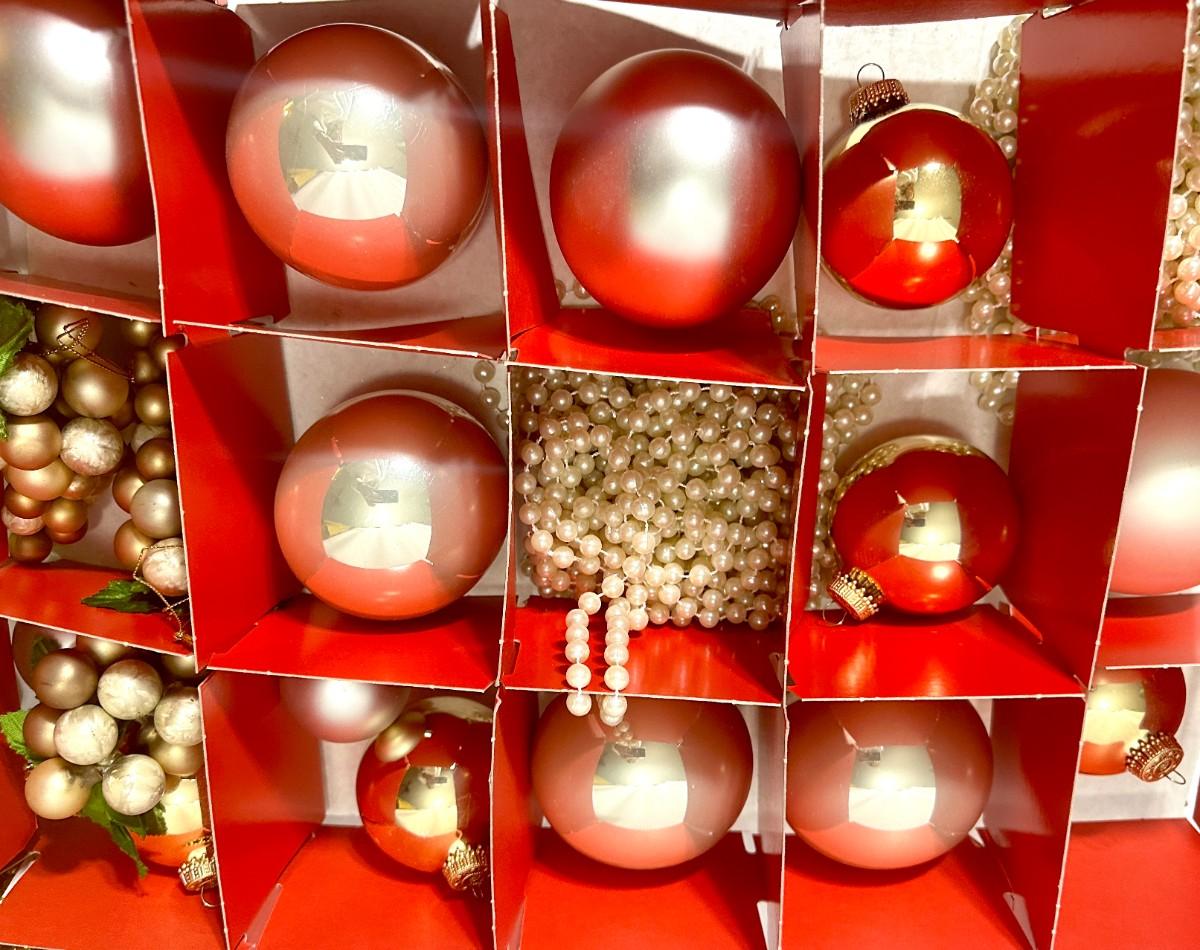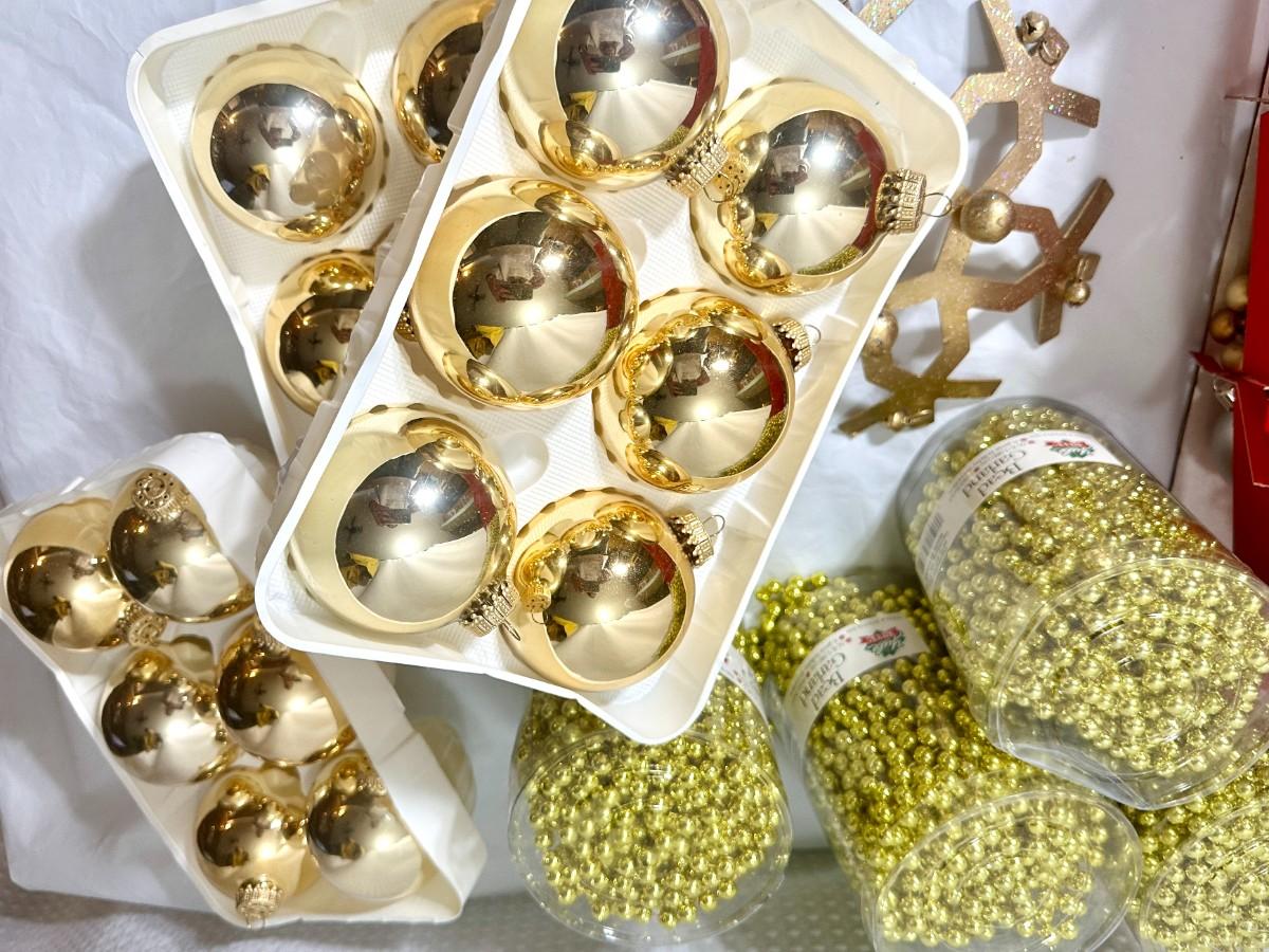 LOCAL PICK UP ONLY. Large lot of gold, pearly and red Christmas decor. Bulbs, beads, candles & decorations.