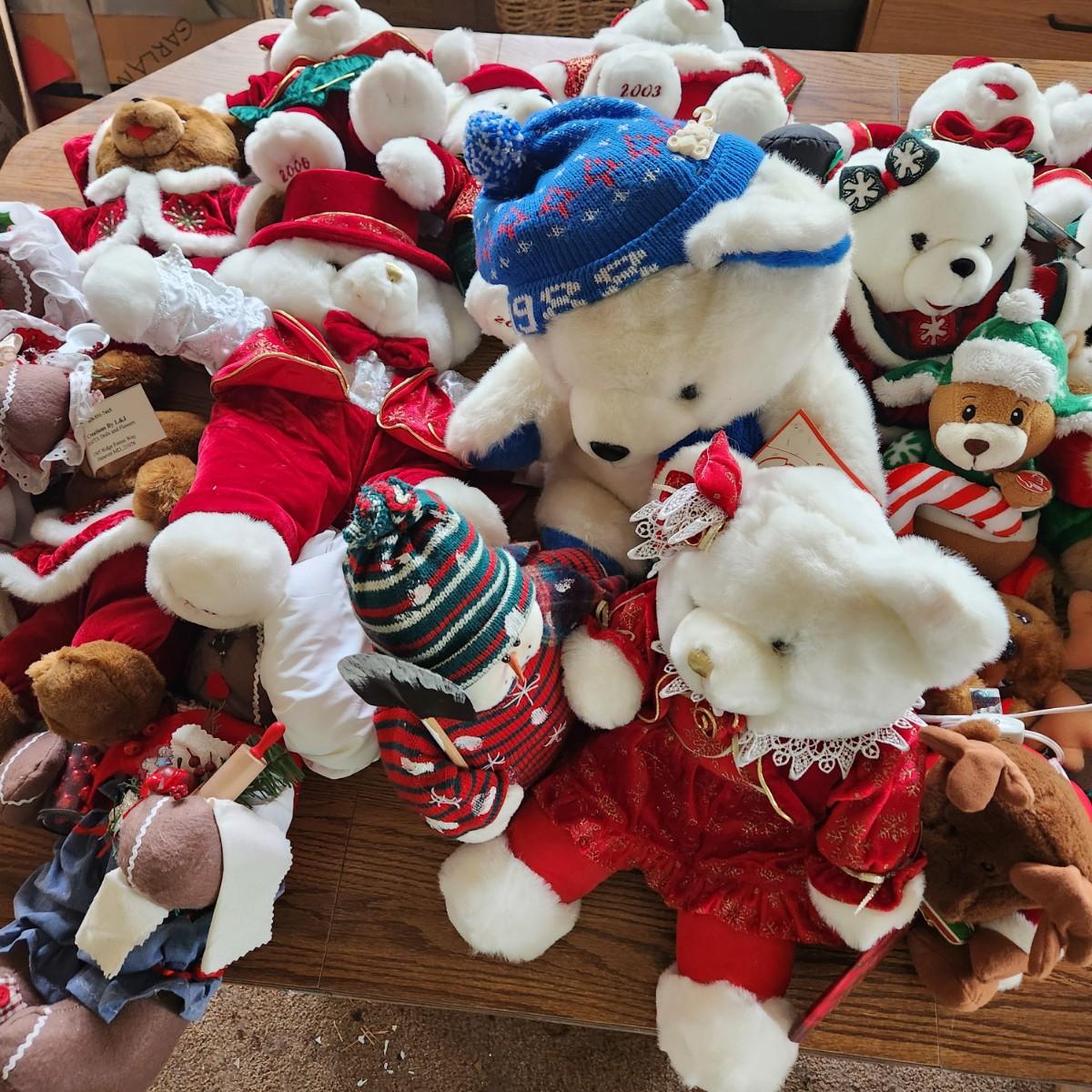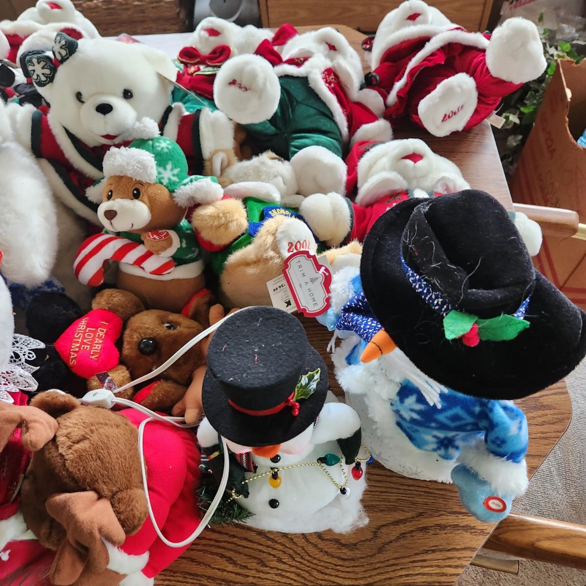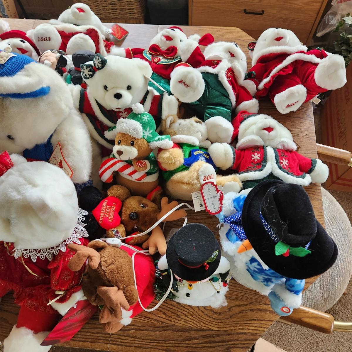 Large Lot of Holiday Plush Mostly Bears ,Snowmans, Keepsake Memories bear