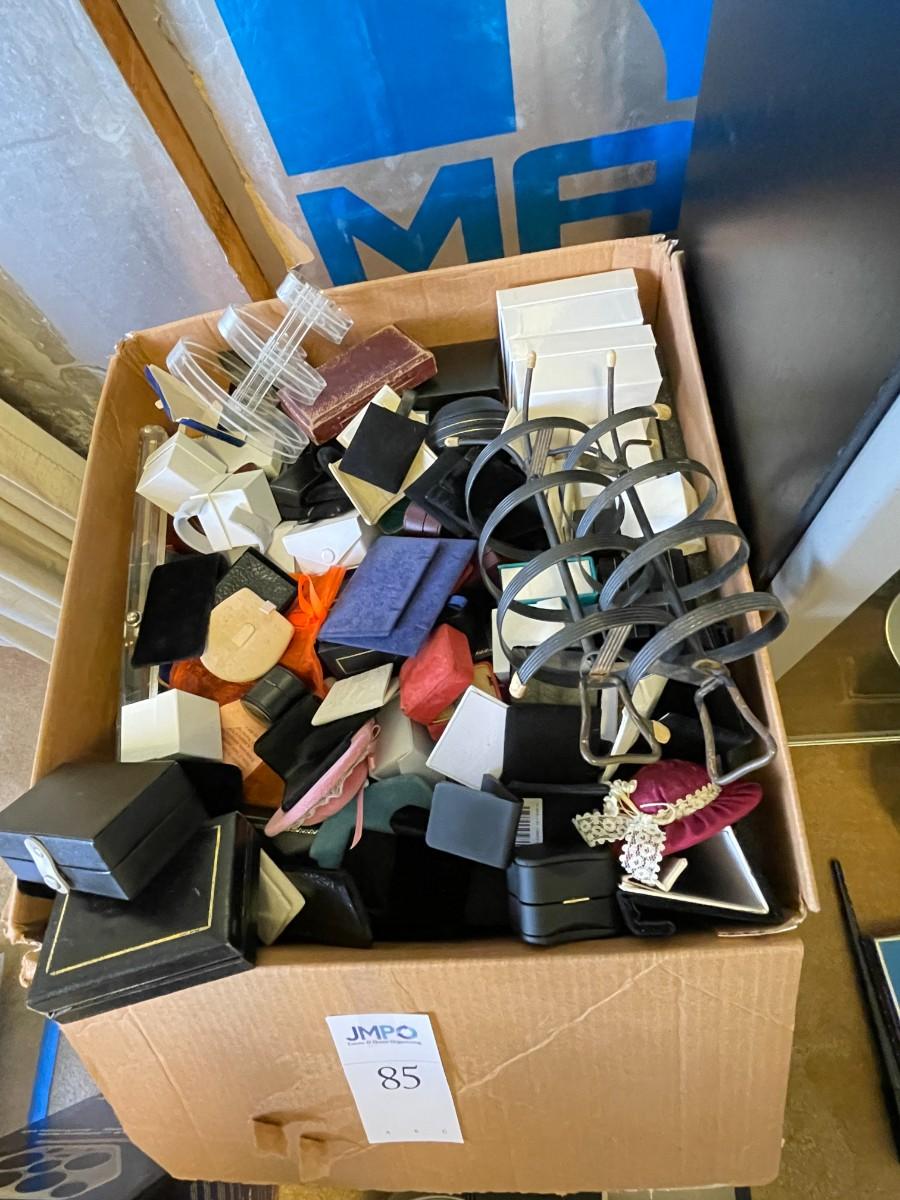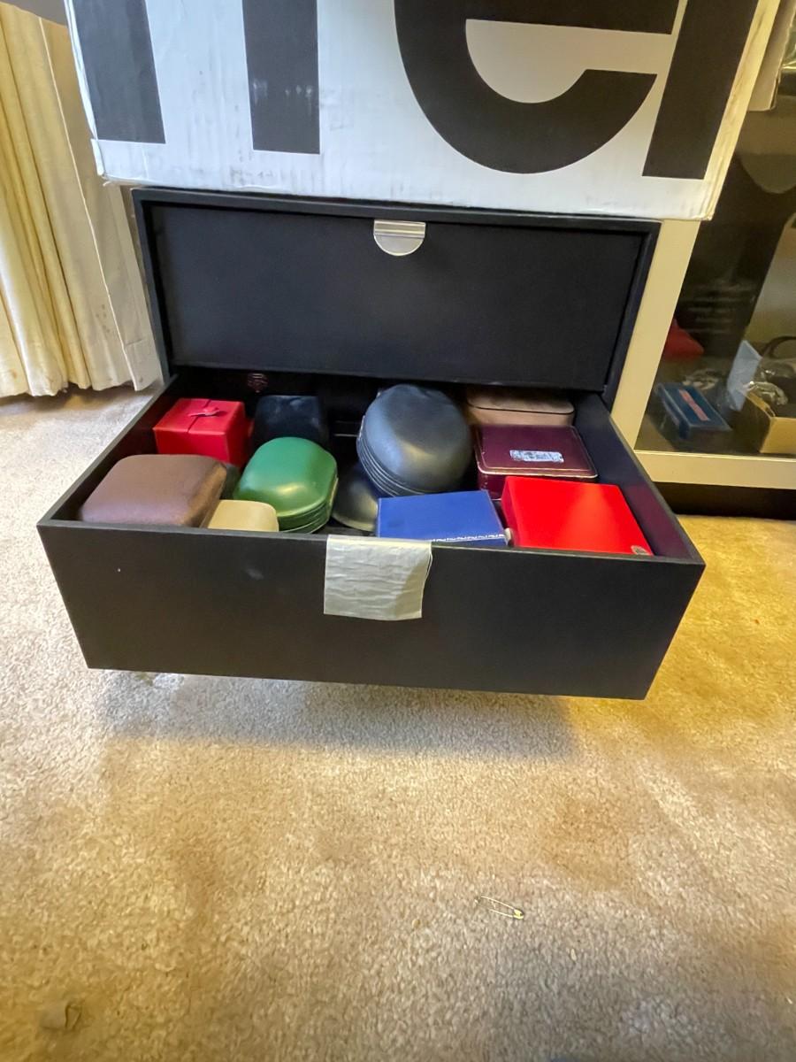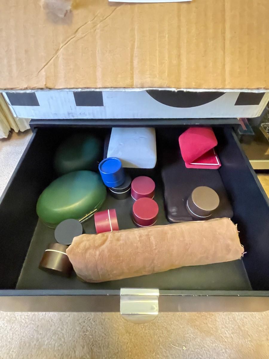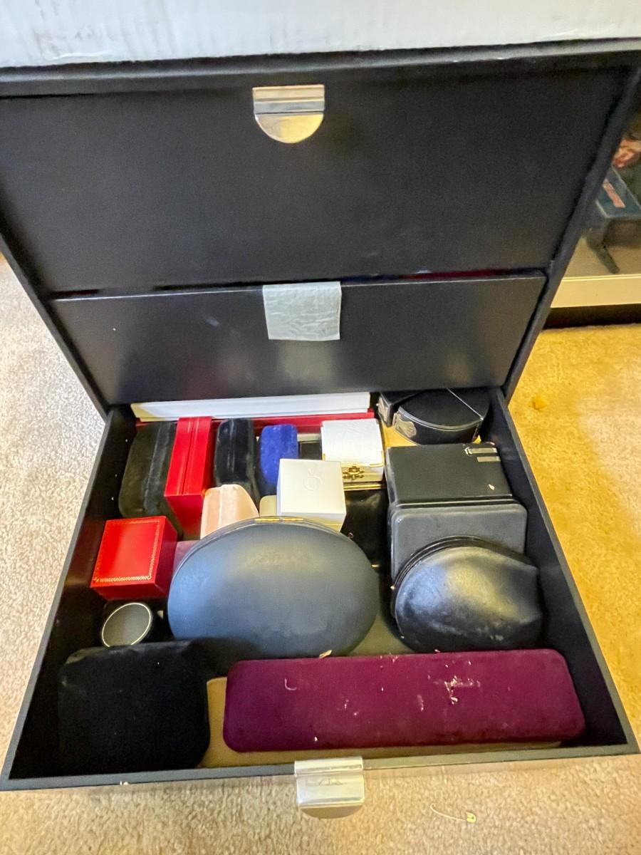 Travel cases, counter displays, trays, ring boxes etc. May need cleaning, not checked for damage. Includes black 3-drawer unit 8"x8" Used previously in retail store