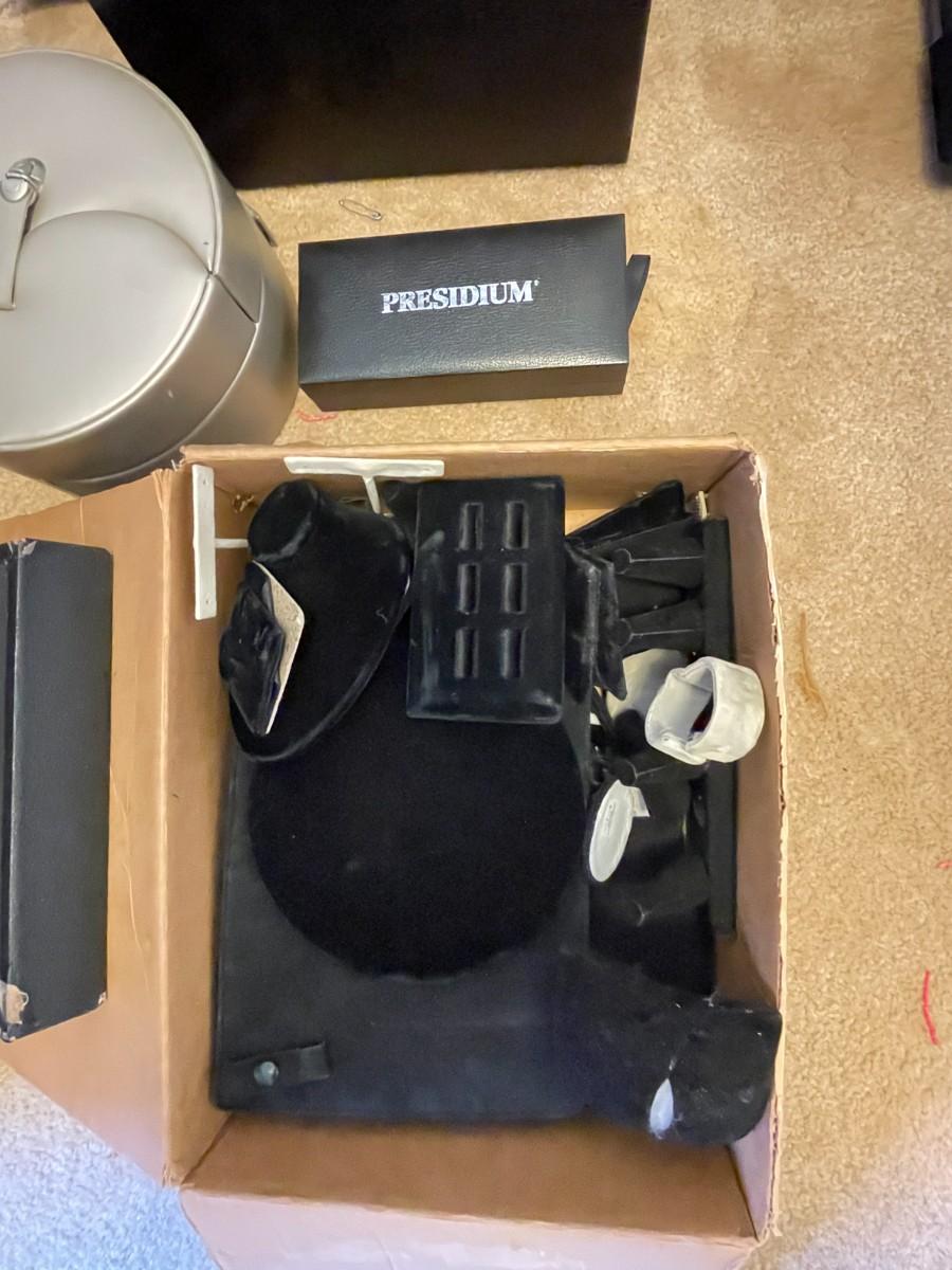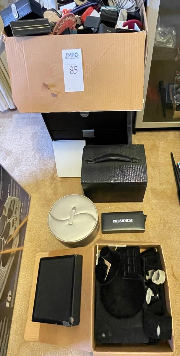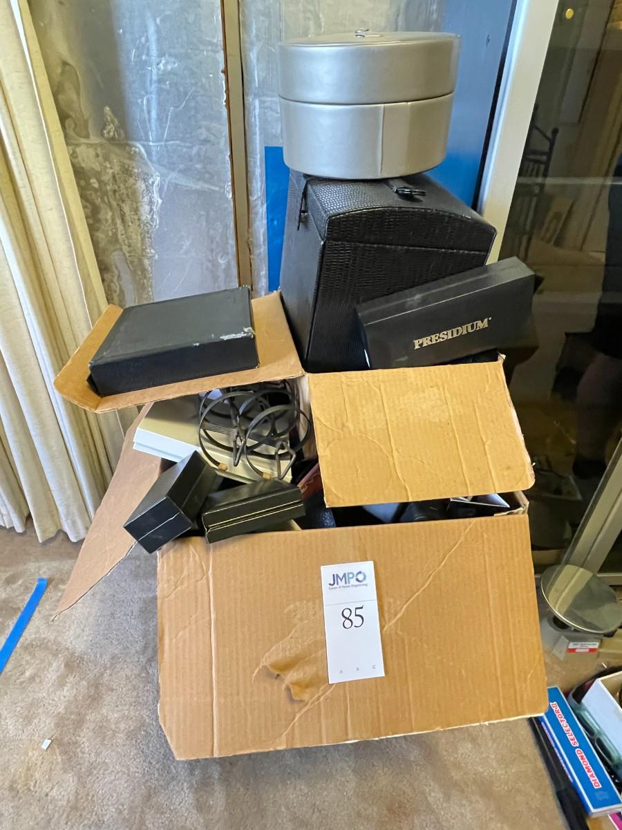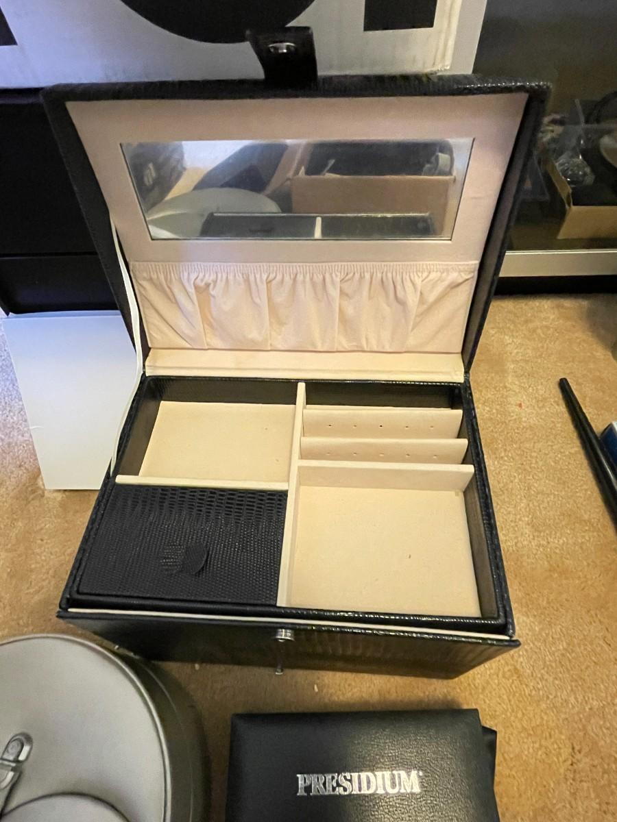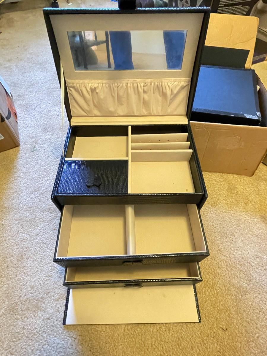 Travel cases, counter displays, trays, ring boxes etc. May need cleaning, not checked for damage. Includes black 3-drawer unit 8"x8" Used previously in retail store