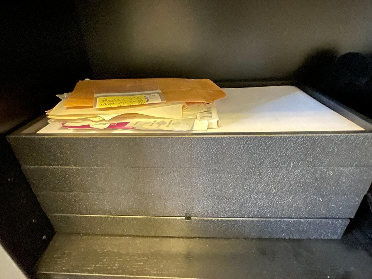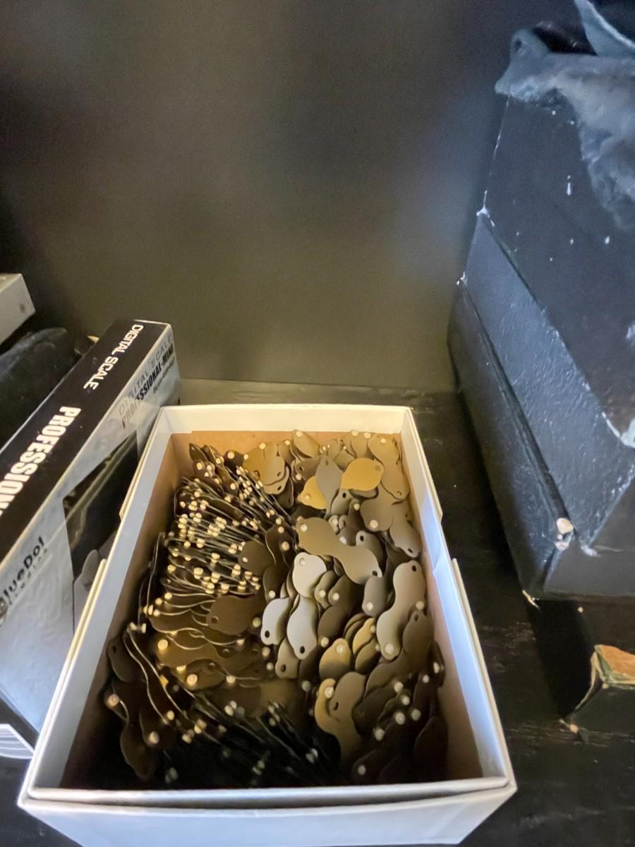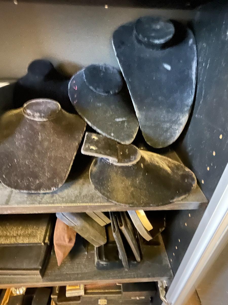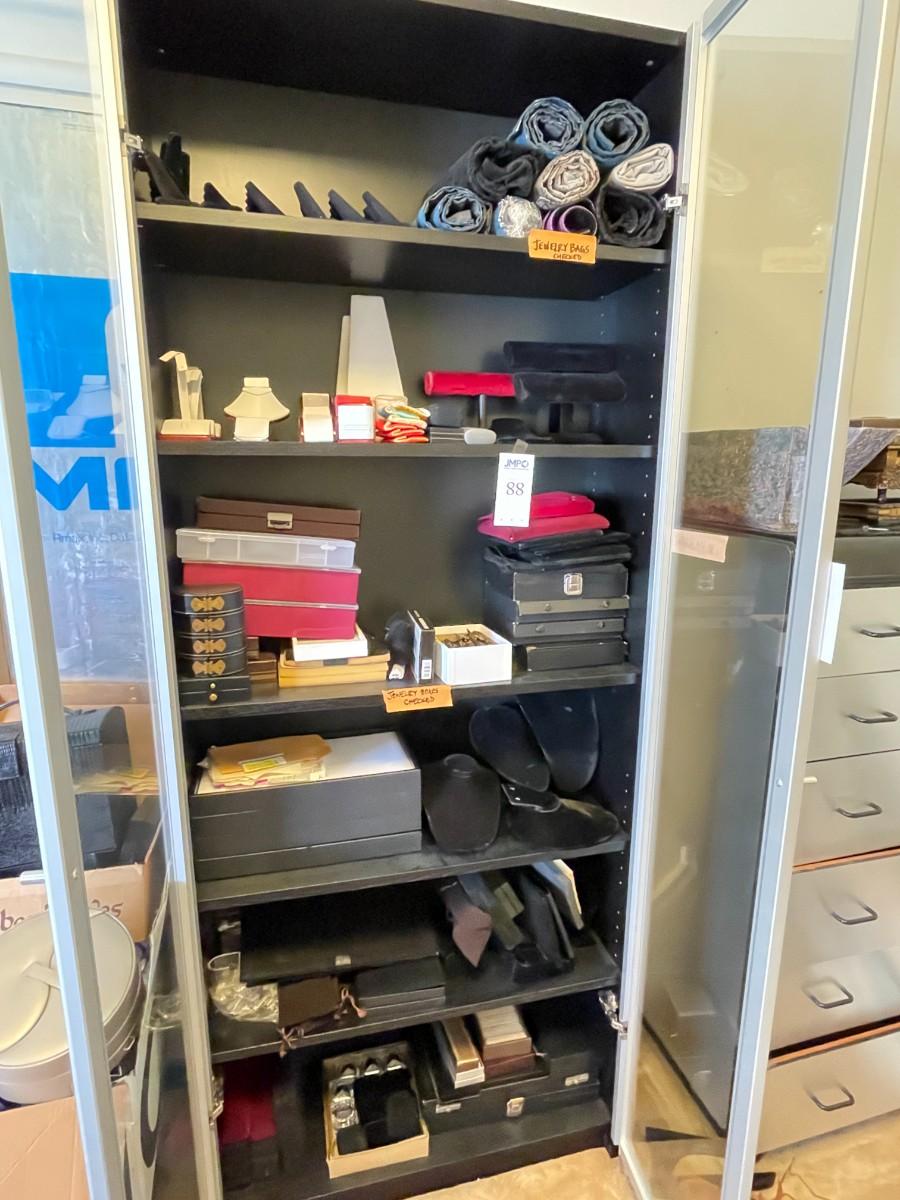 Does not include cabinet. Jewelry storage bags, jewelry display forms, drawers and trays. Price labels. Jeweler's scale. May need cleaning, not checked for damage