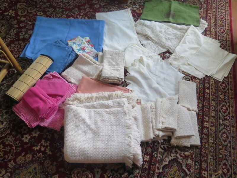 Large lot of linens including some vintage. **Please read Terms and Conditions before placing a bid. Pick up is Sunday, September 1, 2019 from 10am to 4pm in Williamstown. All sales are final. All sales are as is, where is. Please review all photos. Any props included in photos are not included in listing. All measurements are approximate.