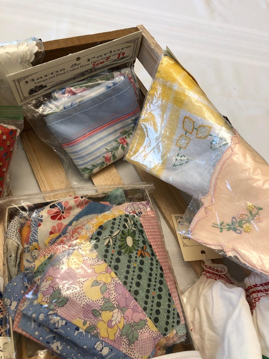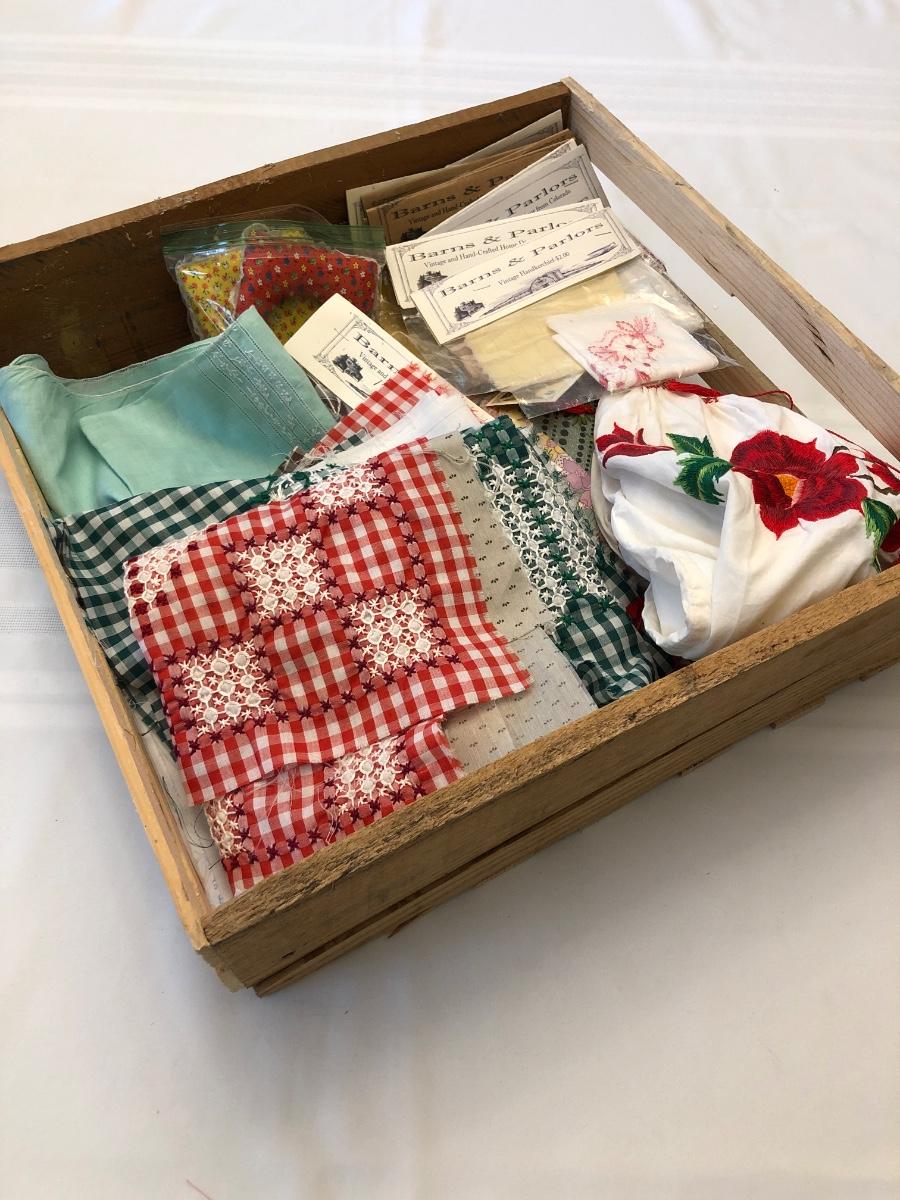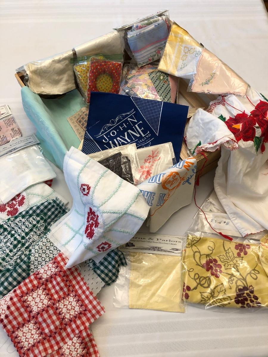 Handkerchiefs, scarves, quilting squares, All in a wooden crate. Crate is damaged.