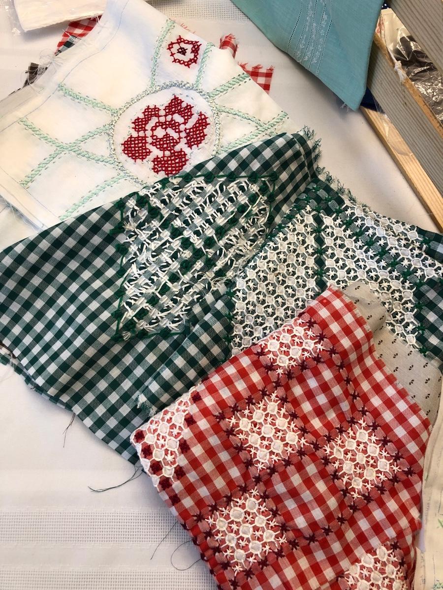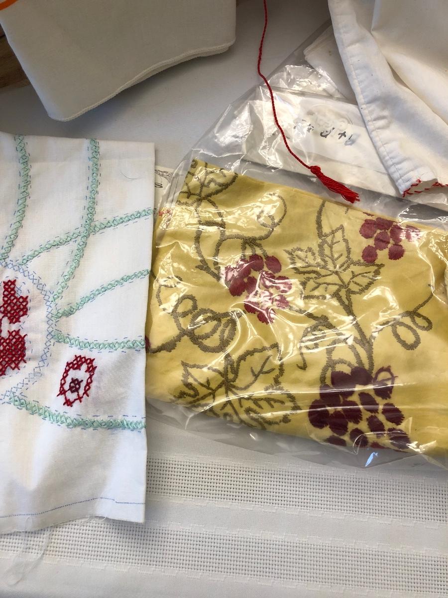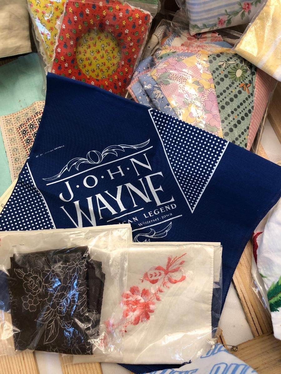 Handkerchiefs, scarves, quilting squares, All in a wooden crate. Crate is damaged.