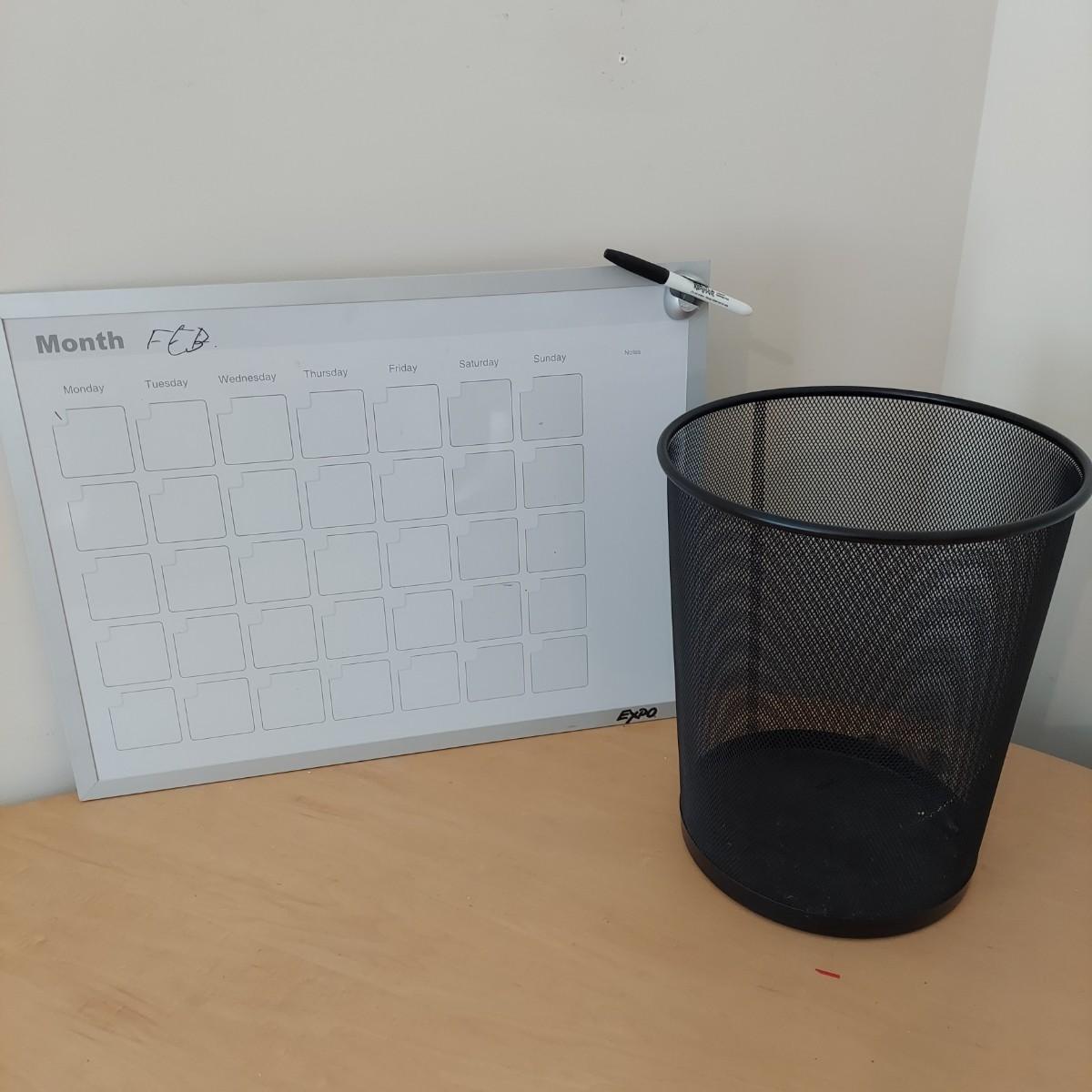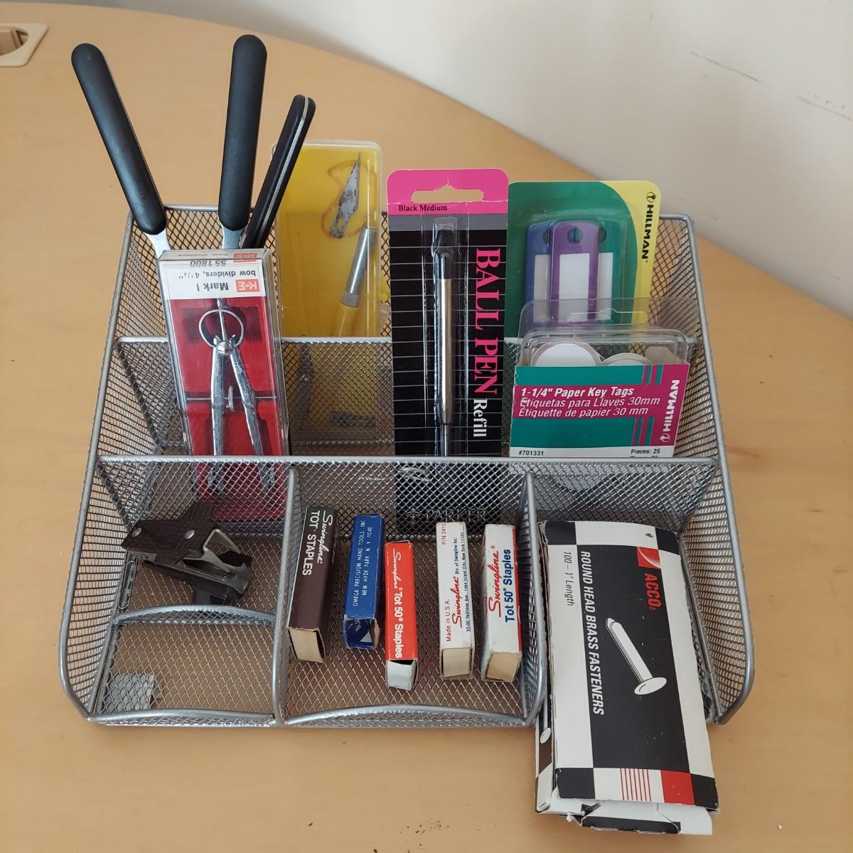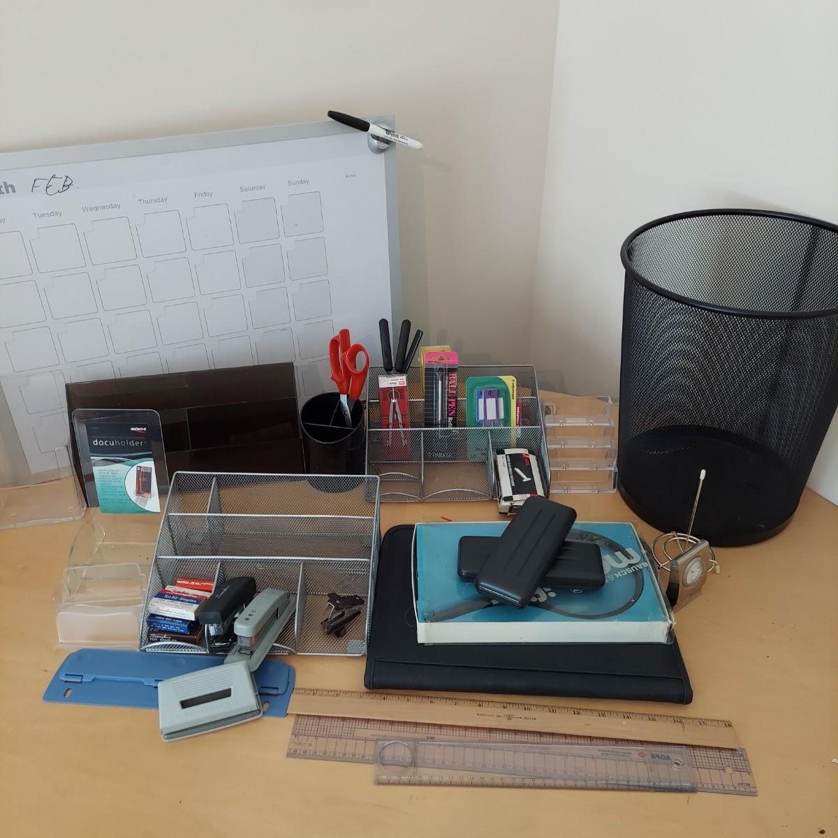 Large lot of office supplies including dry erase calendar, metal waste basket and desktop organizing supplies. Also included are miscellaneous supplies like staples, etc. Local Pickup Only.