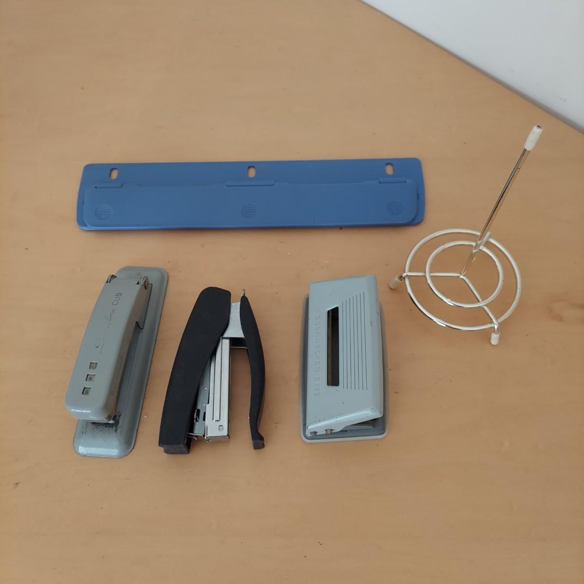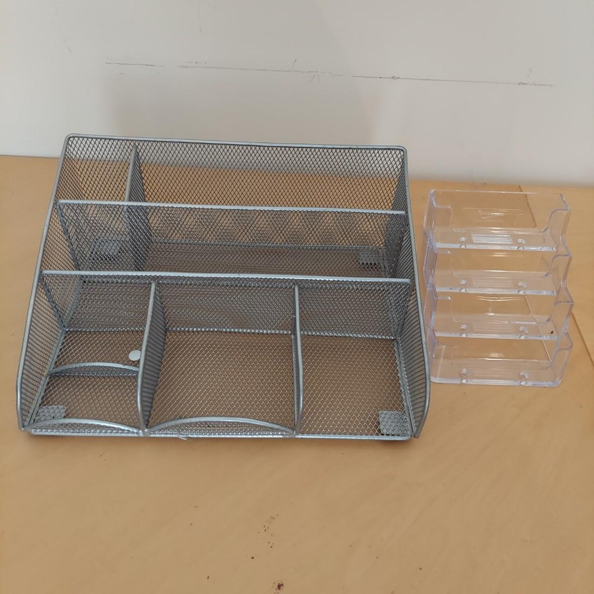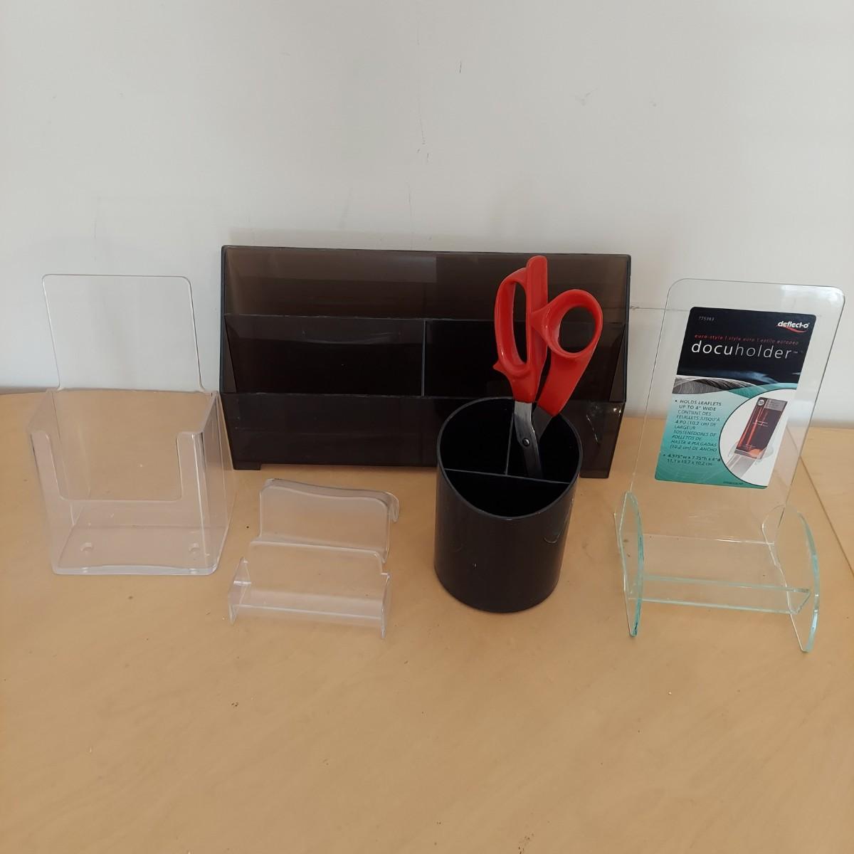 Large lot of office supplies including dry erase calendar, metal waste basket and desktop organizing supplies. Also included are miscellaneous supplies like staples, etc. Local Pickup Only.