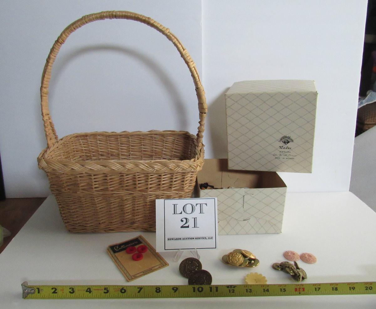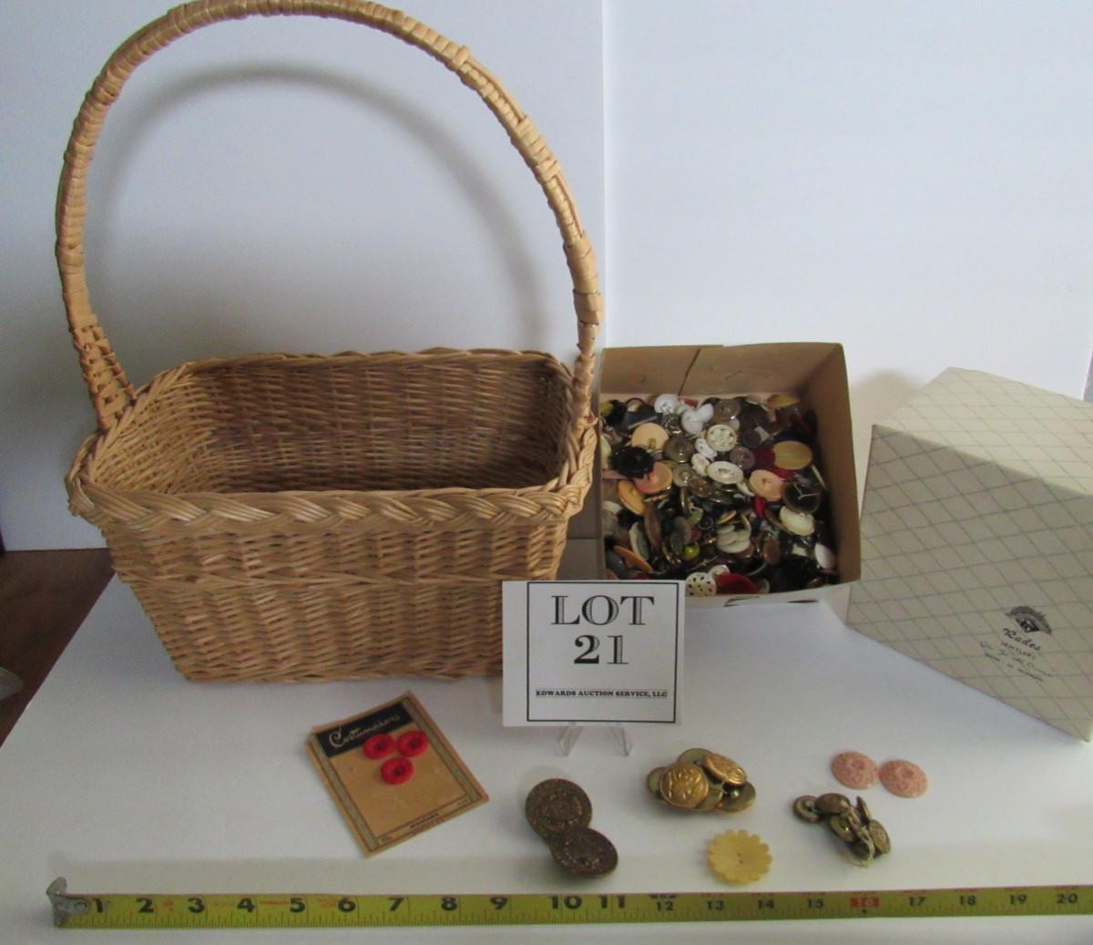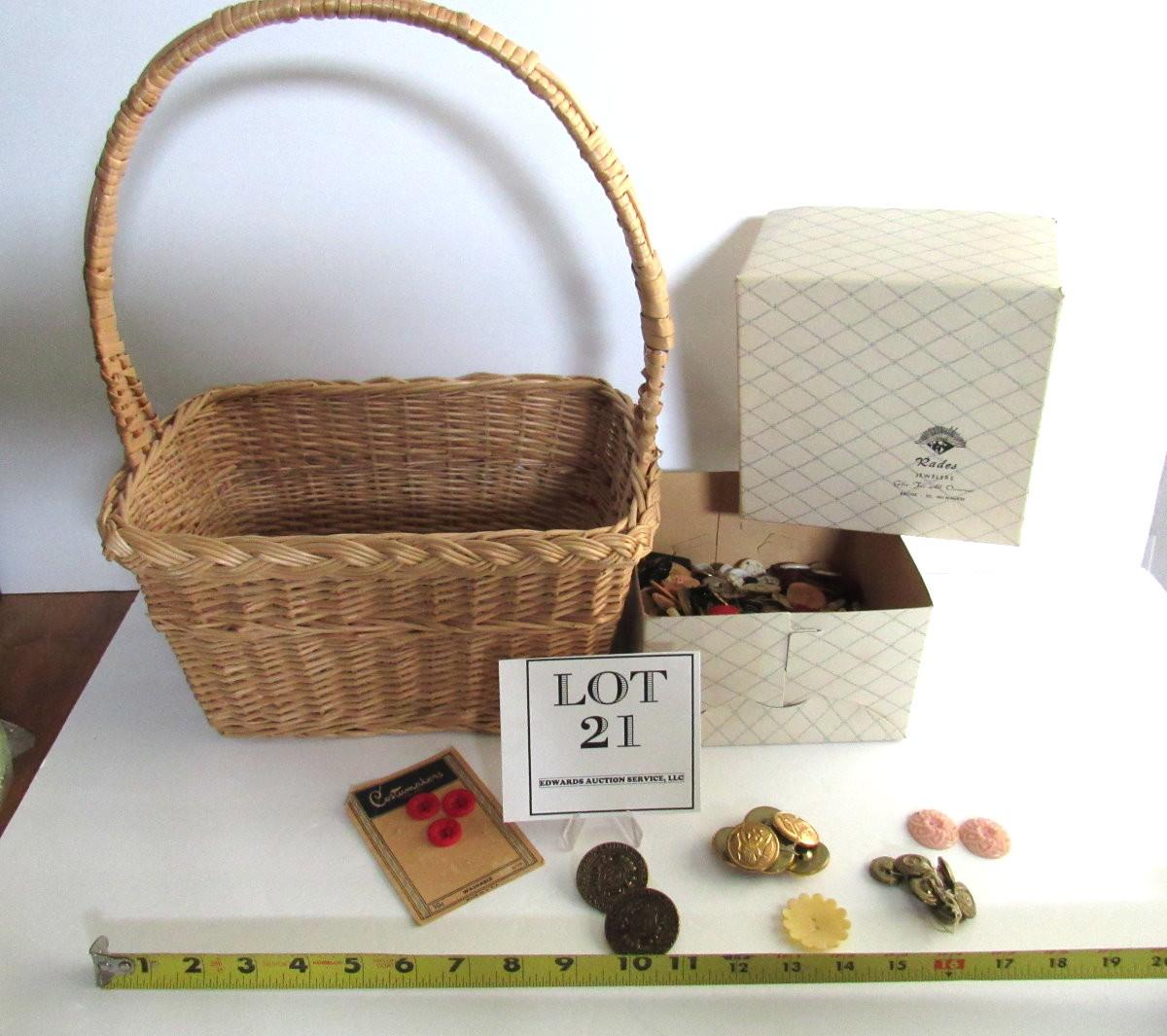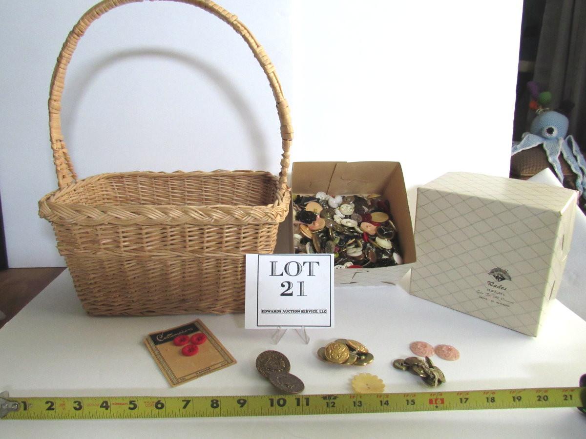 Large Lot of Old Buttons In Old Jewelry Box From Rades Jewelry, Racine, And a Basket