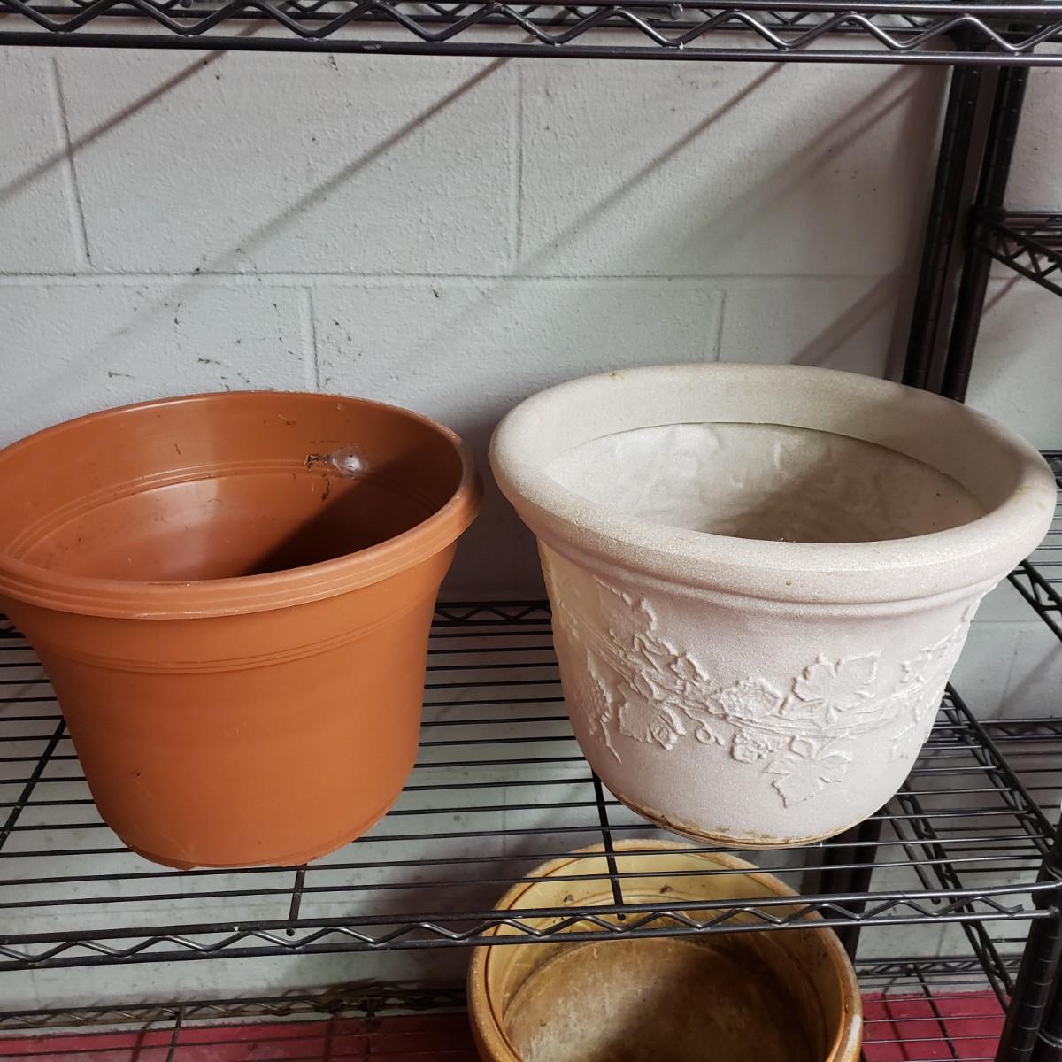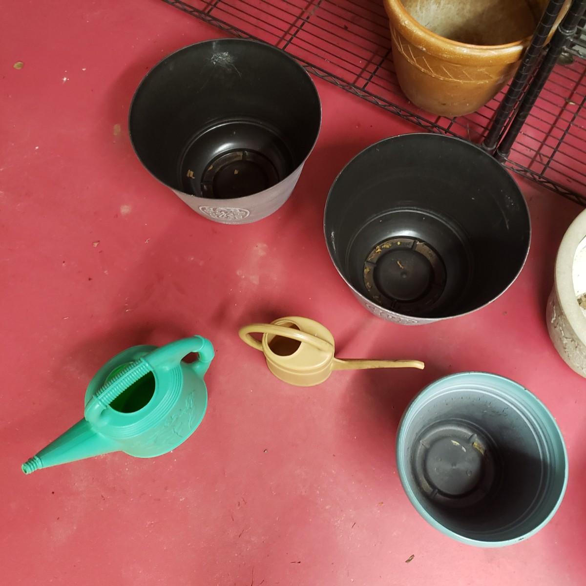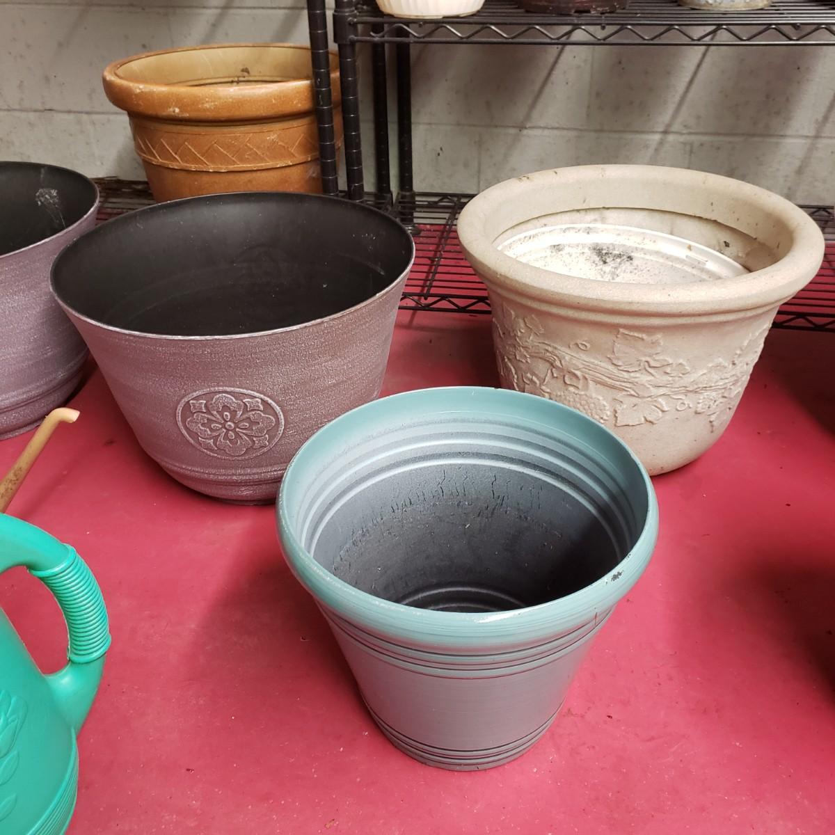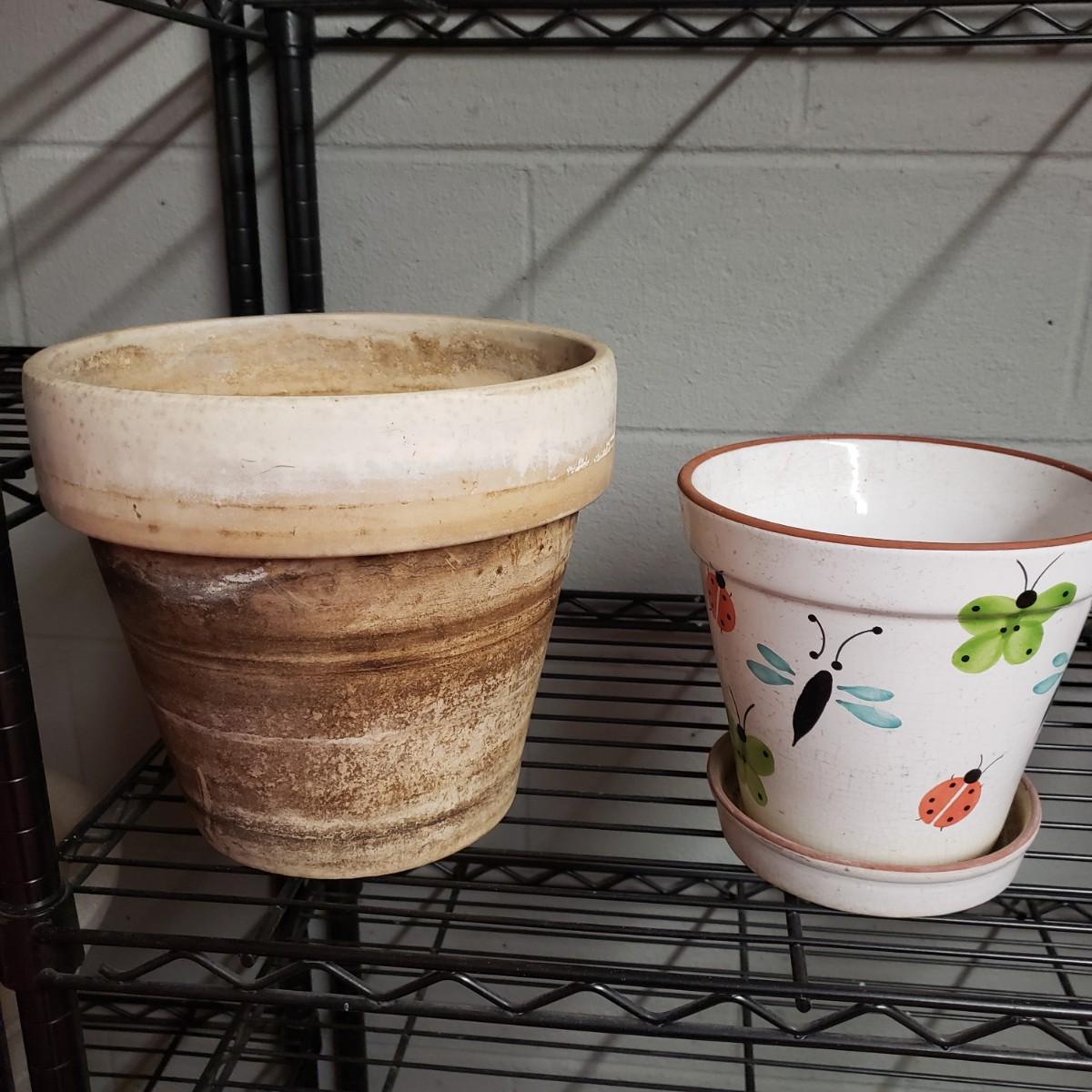 This is large lot of 15 plastic and 7 ceramic/terra cotta pots. The largest cream colored plastic pot with grape vines measures 16" x 12"H. The ceramic and terra cotta pots are all featured on one shelf with the butterfly/insects painted on it. The insect pot measures 8" x 8"H. As a bonus there are two plastic watering cans.l