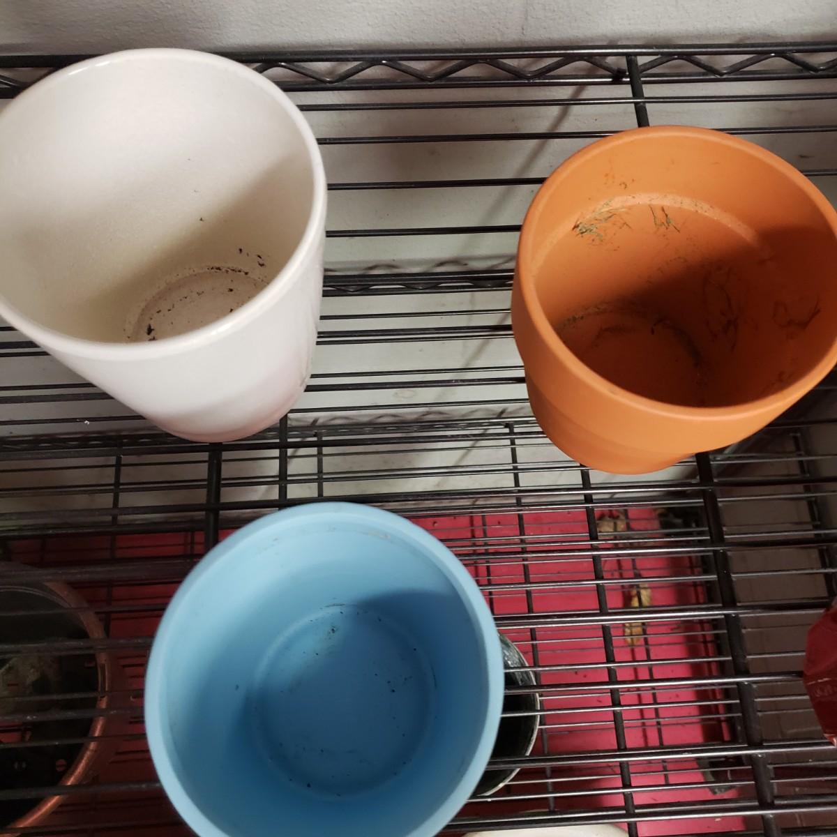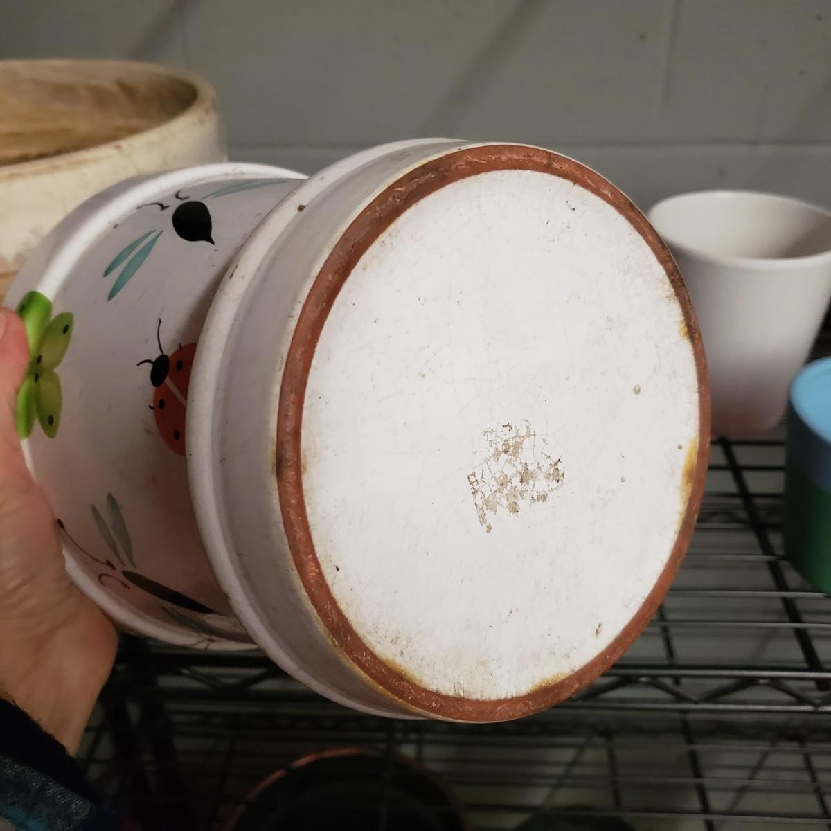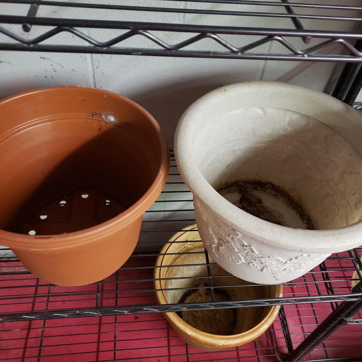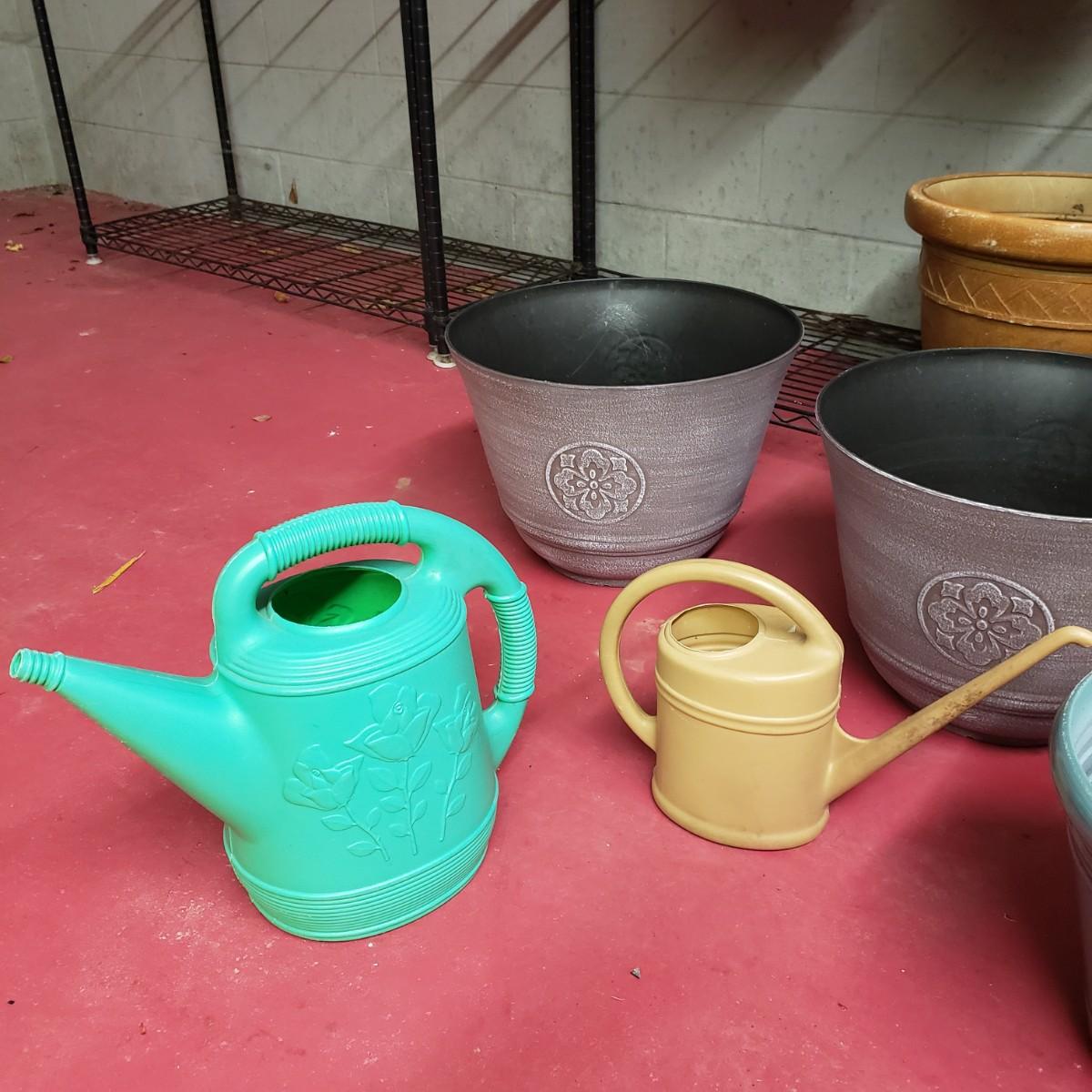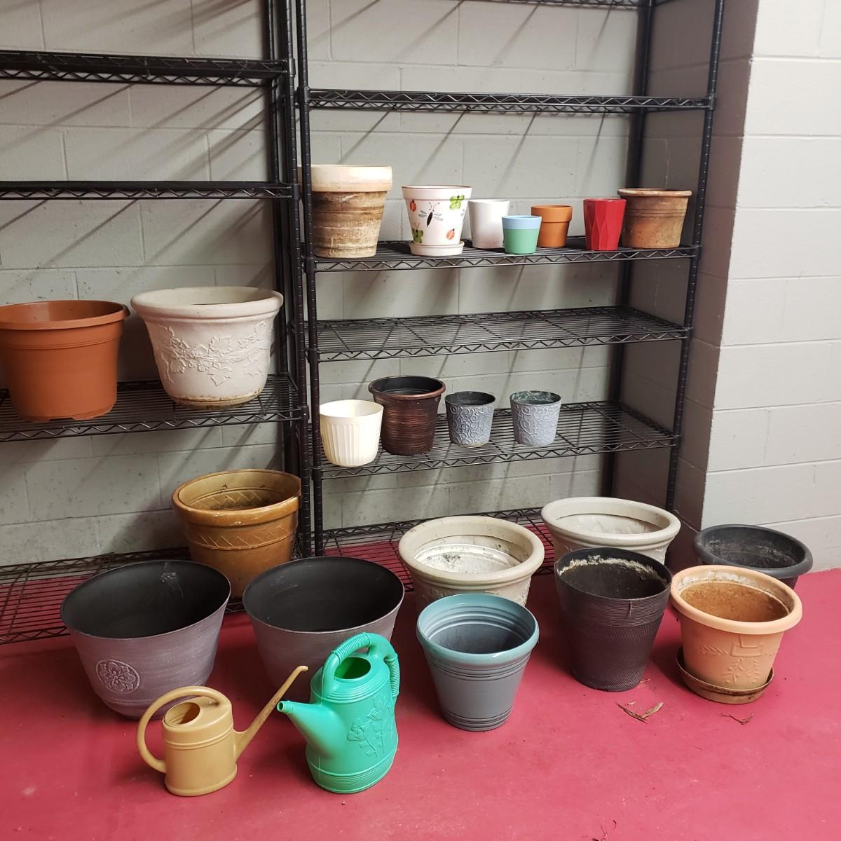 This is large lot of 15 plastic and 7 ceramic/terra cotta pots. The largest cream colored plastic pot with grape vines measures 16" x 12"H. The ceramic and terra cotta pots are all featured on one shelf with the butterfly/insects painted on it. The insect pot measures 8" x 8"H. As a bonus there are two plastic watering cans.l
