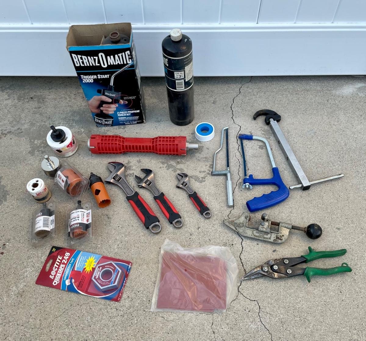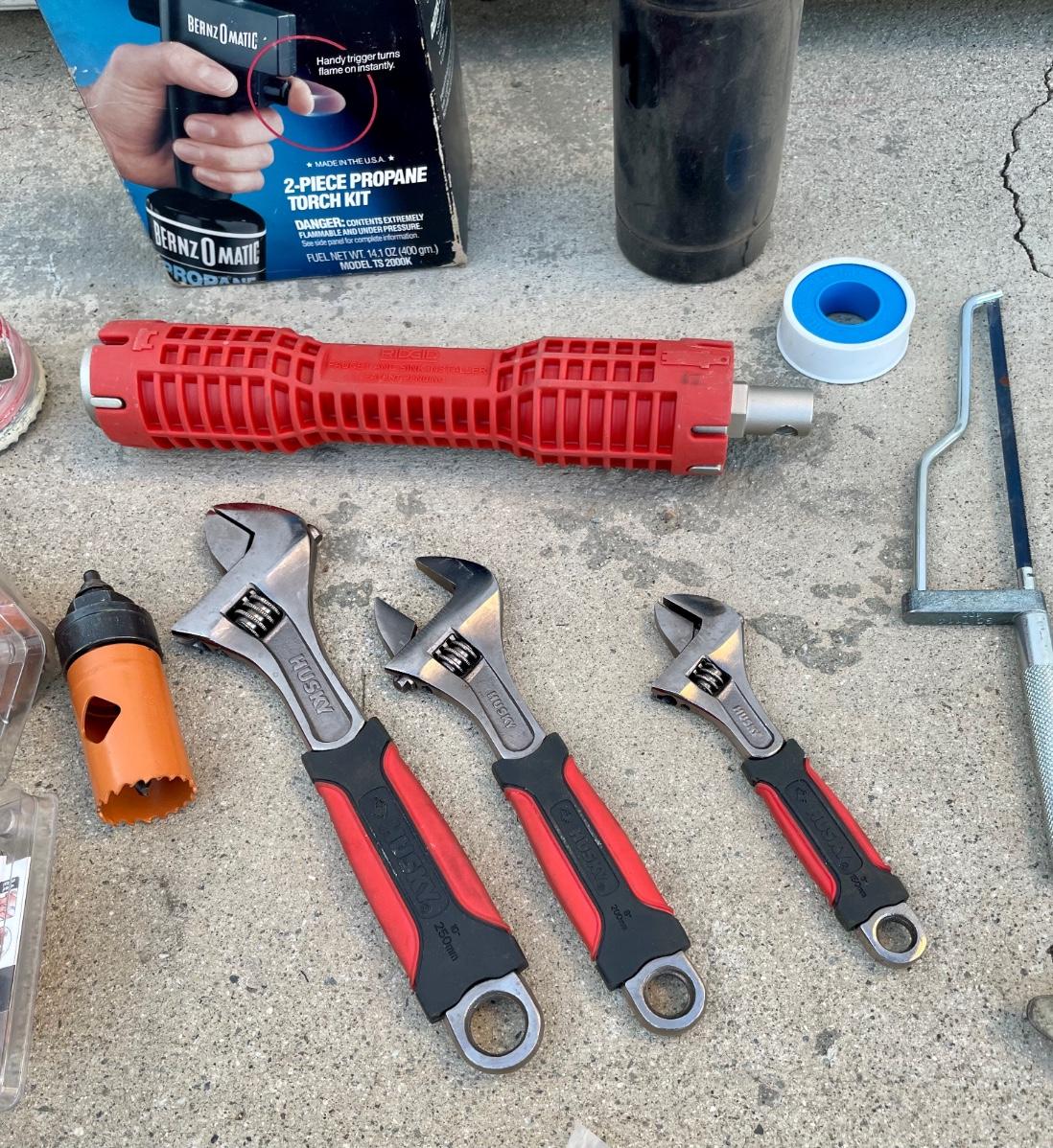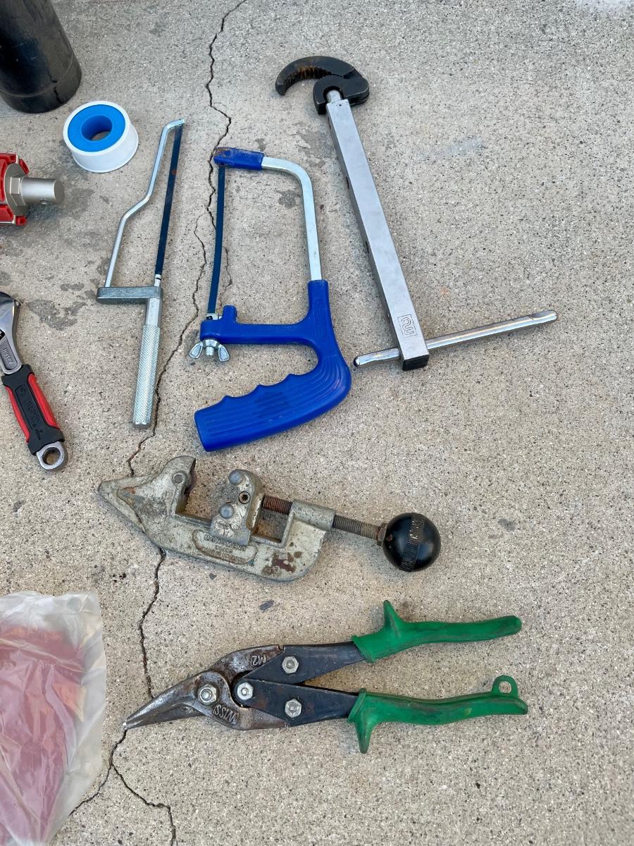 Lot of plumbing tools: set of crescent wrenches, soldering torch, hole saws, PVC tube hacksaws, tube cutter, sheet metal shears, sink wrench, etc. Please see photos for what’s included.