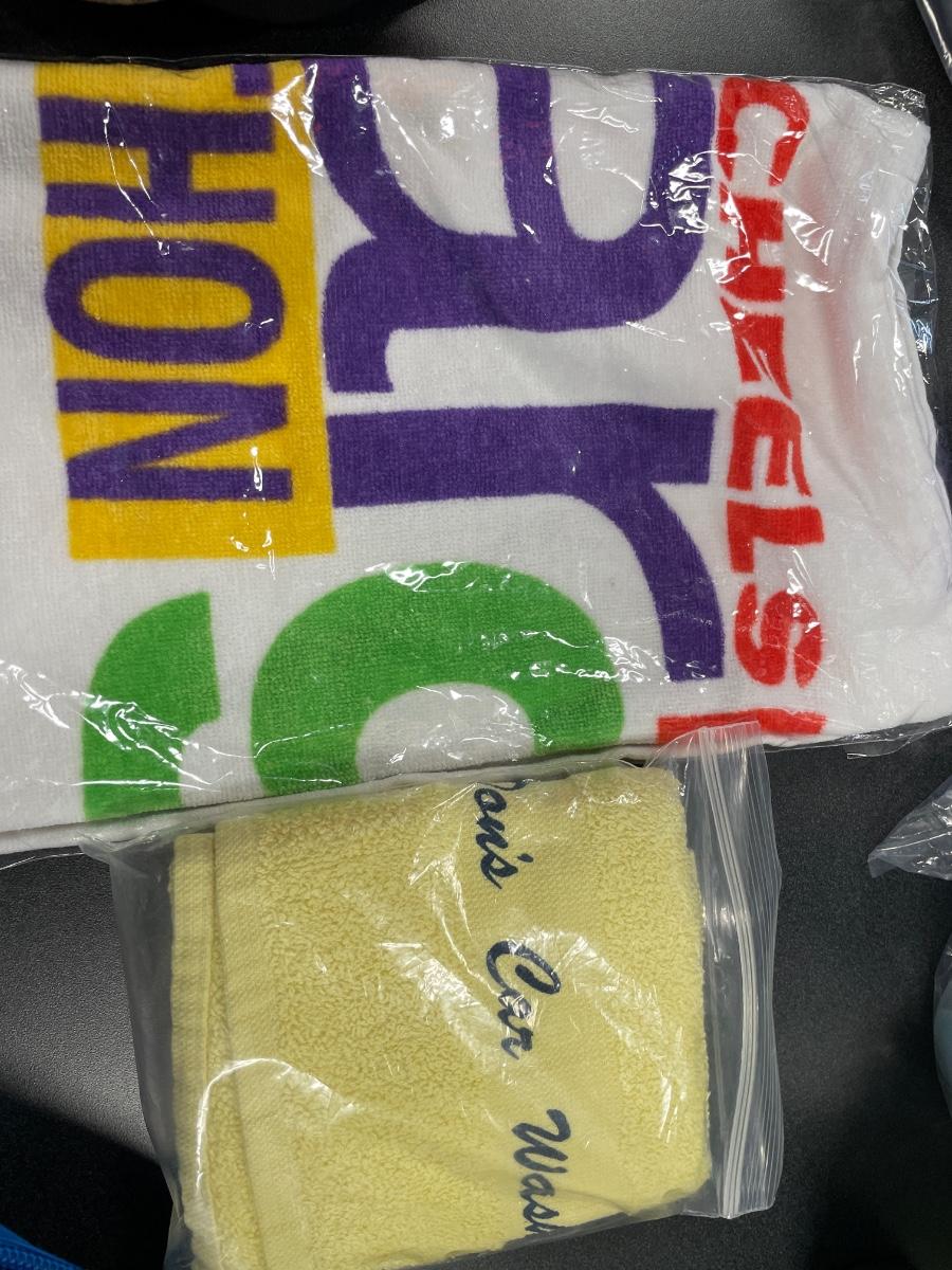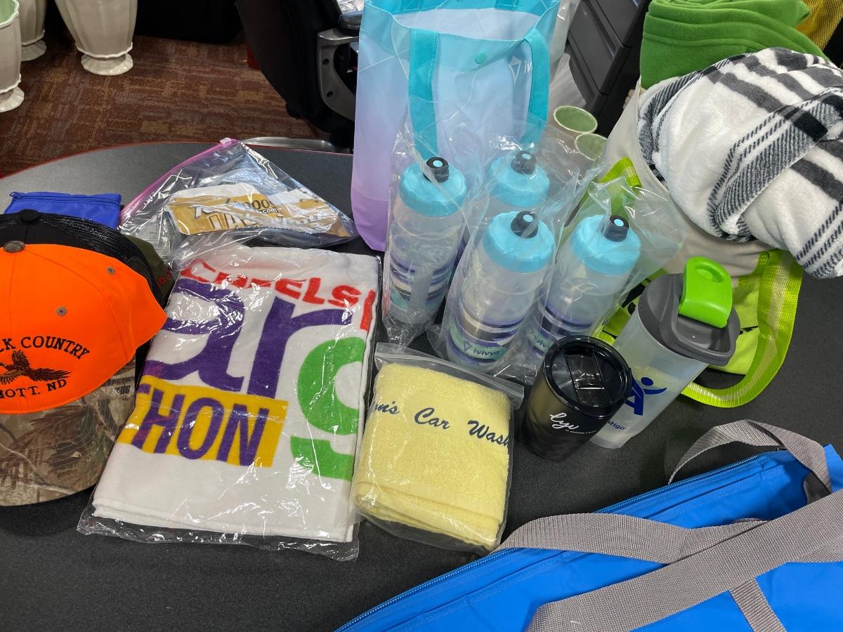Includes baseball hats, freezer tote, blankets and water bottles