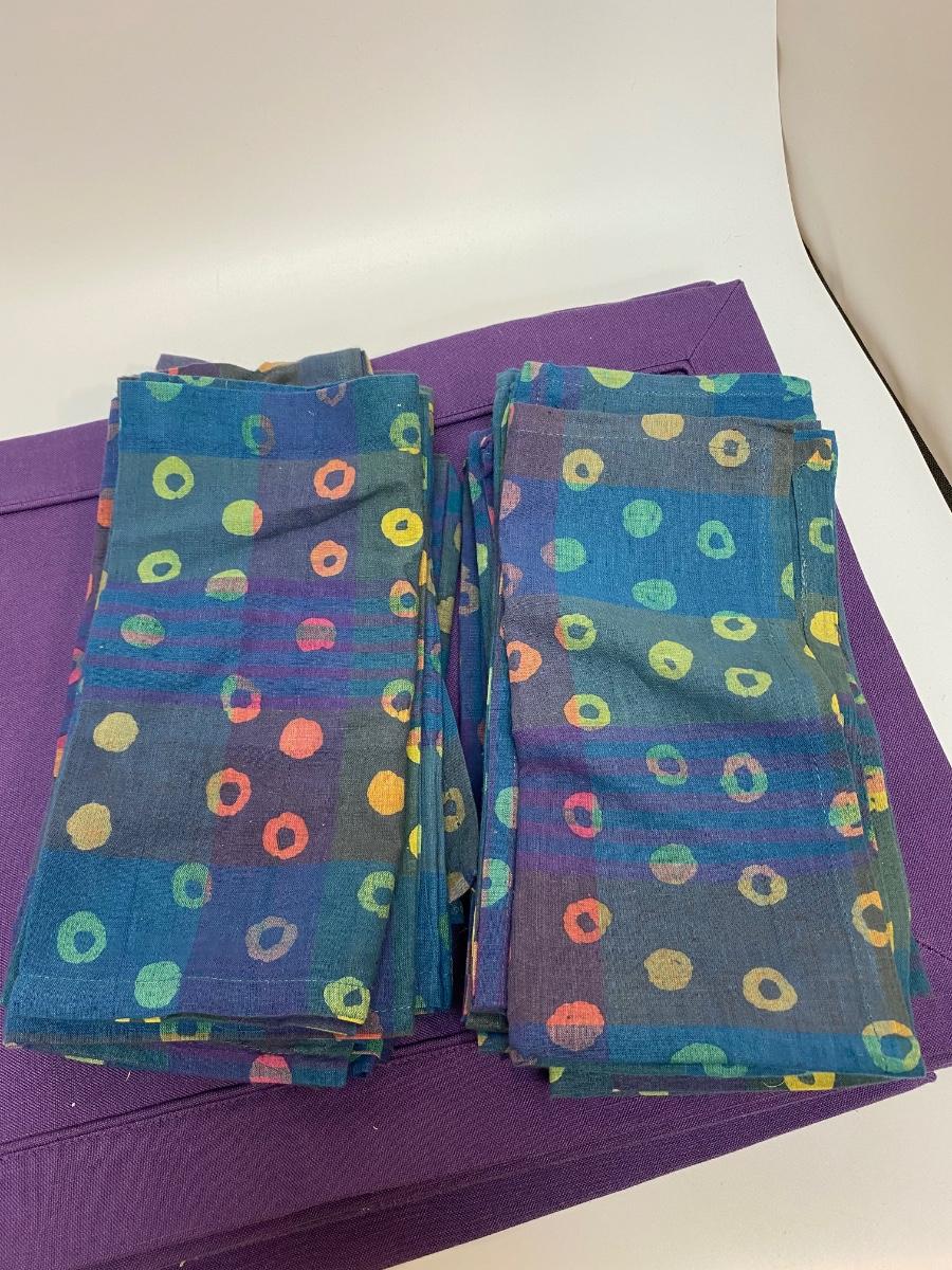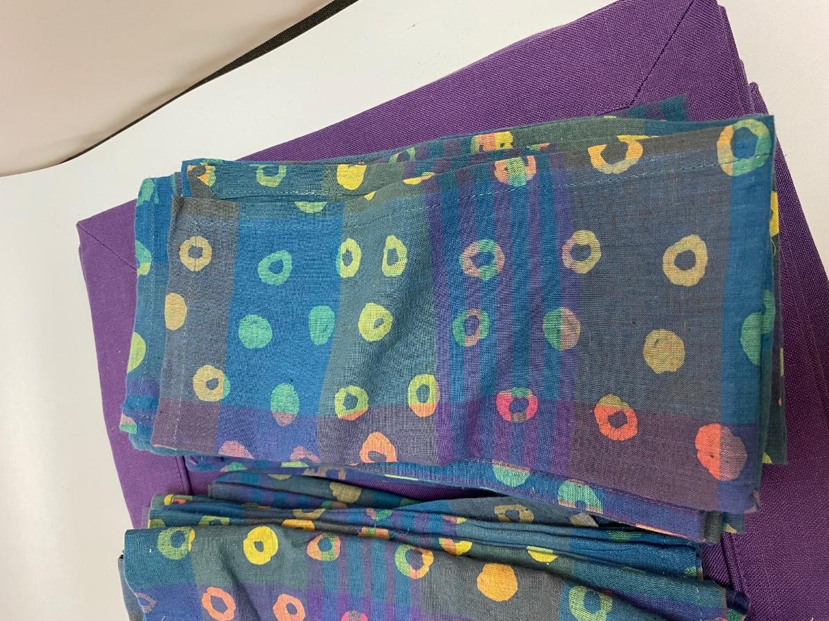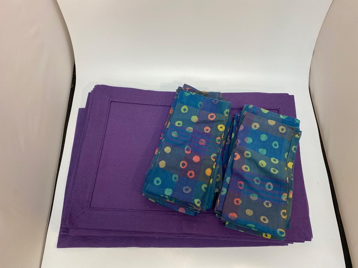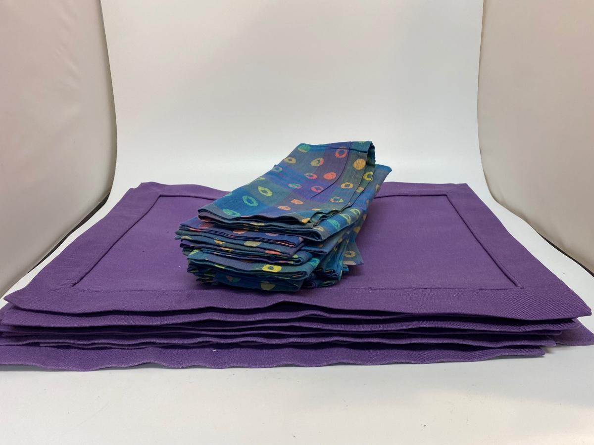 Large Lot of Purple Violet Placemats & Matching Spotted Linen Napkins. Previously used, there is a spot here and there on placemats and some fade on some compared to others. More than 10 placemats and 14 napkins. Napkins are in good condition.