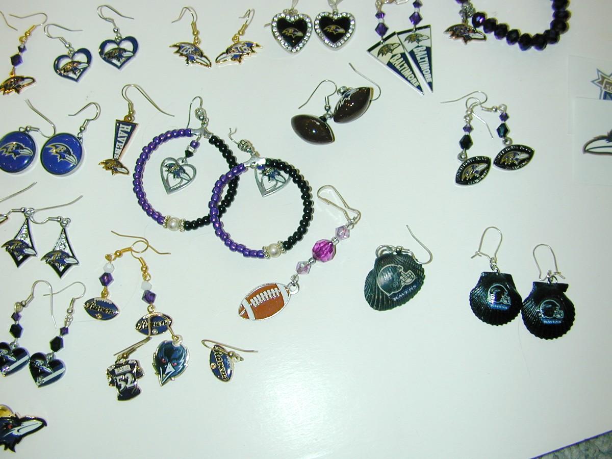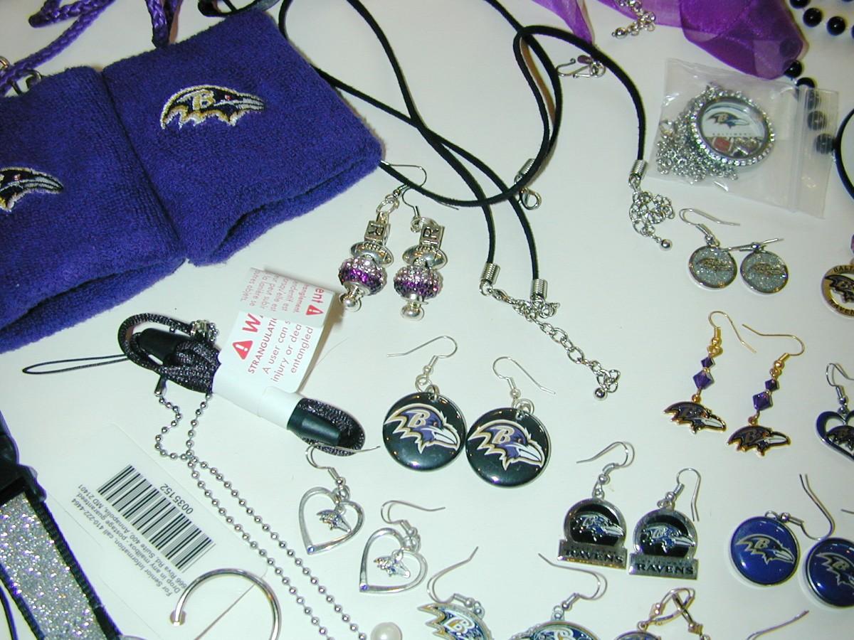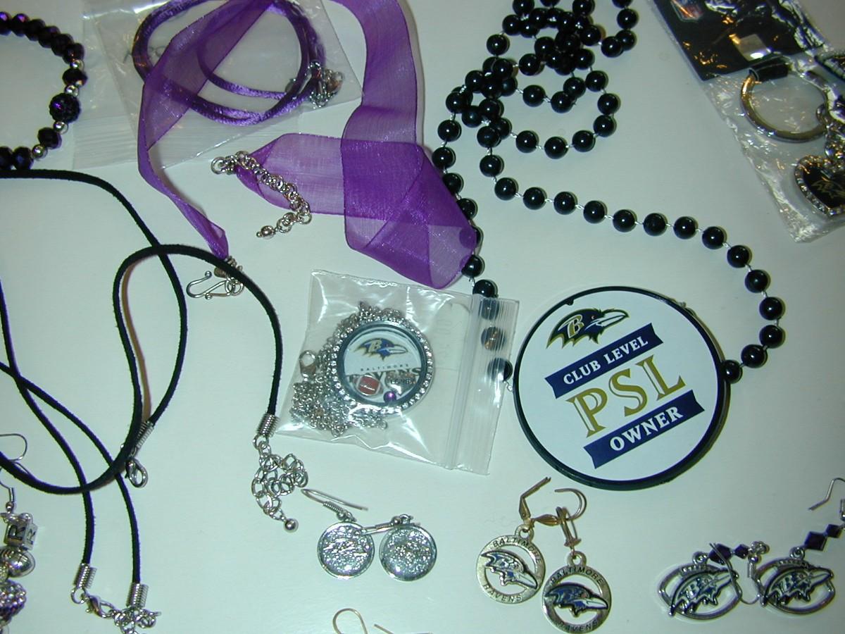 As shown a large lot of assorted Ravens themed jewelry items